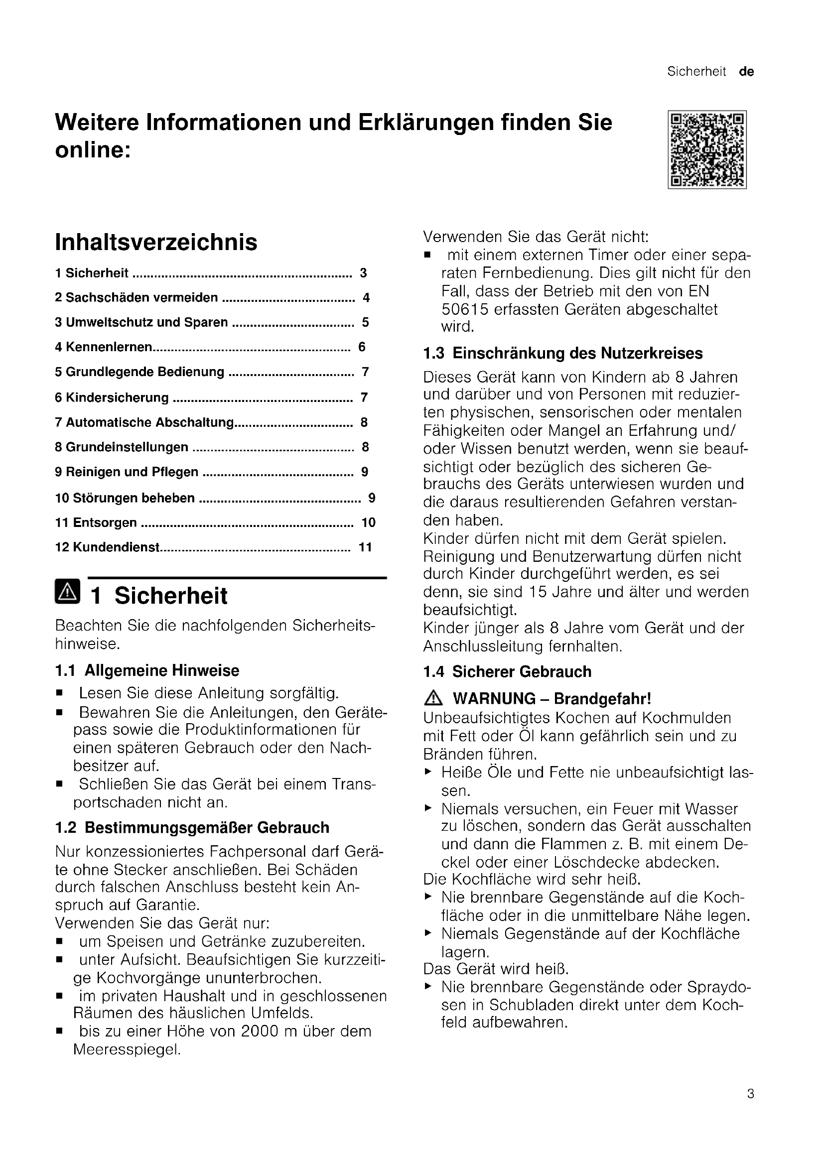 - 12 Kundendienst 1 Sicherheit Beachten Sie die nachfolgenden Sicherheits- hinweise. 1.1 Allgemeine Hinweise ¡ Lesen Sie diese Anleitung sorgfältig. ¡ Bewahren Sie die Anleitungen, den Geräte- pass sowie die Produktinformationen für einen späteren Gebrauch oder den Nach- besitzer auf. ¡ Schließen Sie das Gerät bei einem Trans- portschaden nicht an. 1.2 Bestimmungsgemäßer Gebrauch Nur konzessioniertes Fachpersonal darf Gerä- te ohne Stecker anschließen. Bei Schäden durch falschen Anschluss besteht kein An- spruch auf Garantie. Verwenden Sie das Gerät nur: ¡ um Speisen und Getränke zuzubereiten. ¡ unter Aufsicht. Beaufsichtigen Sie kurzzeiti- ge Kochvorgänge ununterbrochen. ¡ im privaten Haushalt und in geschlossenen Räumen des häuslichen Umfelds. ¡ bis zu einer Höhe von 2000m über dem Meeresspiegel. Verwenden Sie das Gerät nicht: ¡ mit einem externen Timer oder einer sepa- raten Fernbedienung. Dies gilt nicht für den Fall, dass der Betrieb mit den von EN 50615 erfassten Geräten abgeschaltet wird. 1.3 Einschränkung des Nutzerkreises Dieses Gerät kann von Kindern ab 8 Jahren und darüber und von Personen mit reduzier- ten physischen, sensorischen oder mentalen Fähigkeiten oder Mangel an Erfahrung und/ oder Wissen benutzt werden, wenn sie beauf- sichtigt oder bezüglich des sicheren Ge- brauchs des Geräts unterwiesen wurden und die daraus resultierenden Gefahren verstan- den haben. Kinder dürfen nicht mit dem Gerät spielen. Reinigung und Benutzerwartung dürfen nicht durch Kinder durchgeführt werden, es sei denn, sie sind 15 Jahre und älter und werden beaufsichtigt. Kinder jünger als 8 Jahre vom Gerät und der Anschlussleitung fernhalten. 1.4 Sicherer Gebrauch WARNUNG‒Brandgefahr! Unbeaufsichtigtes Kochen auf Kochmulden mit Fett oder Öl kann gefährlich sein und zu Bränden führen. p. 11