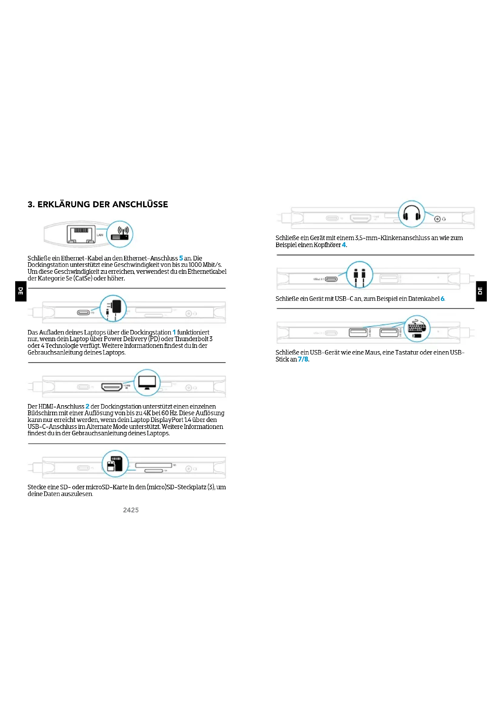 Schließe ein Ethernet-Kabel an den Ethernet-Anschluss 5 an. Die Dockingstation unterstützt eine Geschwindigkeit von bis zu 1000 Mbit/s. Um diese Geschwindigkeit zu erreichen, verwendest du ein Ethernetkabel der Kategorie 5e (Cat5e) oder höher. Das Aufladen deines Laptops über die Dockingstation 1 funktioniert nur, wenn dein Laptop über Power Delivery (PD) oder underbolt 3 oder 4 Technologie verfügt. Weitere Informationen findest du in der Gebrauchsanleitung deines Laptops. Der HDMI-Anschluss 2 der Dockingstation unterstützt einen einzelnen Bildschirm mit einer Auflösung von bis zu 4K bei 60 Hz. Diese Auflösung kann nur erreicht werden, wenn dein Laptop DisplayPort 1.4 über den USB-C-Anschluss im Alternate Mode unterstützt. Weitere Informationen findest du in der Gebrauchsanleitung deines Laptops. Stecke eine SD- oder microSD-Karte in den (micro)SD-Steckplatz (3), um deine Daten auszulesen. Schließe ein Gerät mit einem 3,5-mm-Klinkenanschluss an wie zum Beispiel einen Kopfhörer 4. Schließe ein Gerät mit USB-C an, zum Beispiel ein Datenkabel 6. Schließe ein USB-Gerät wie eine Maus, eine Tastatur oder einen USB- Stick an 7/8.26 27