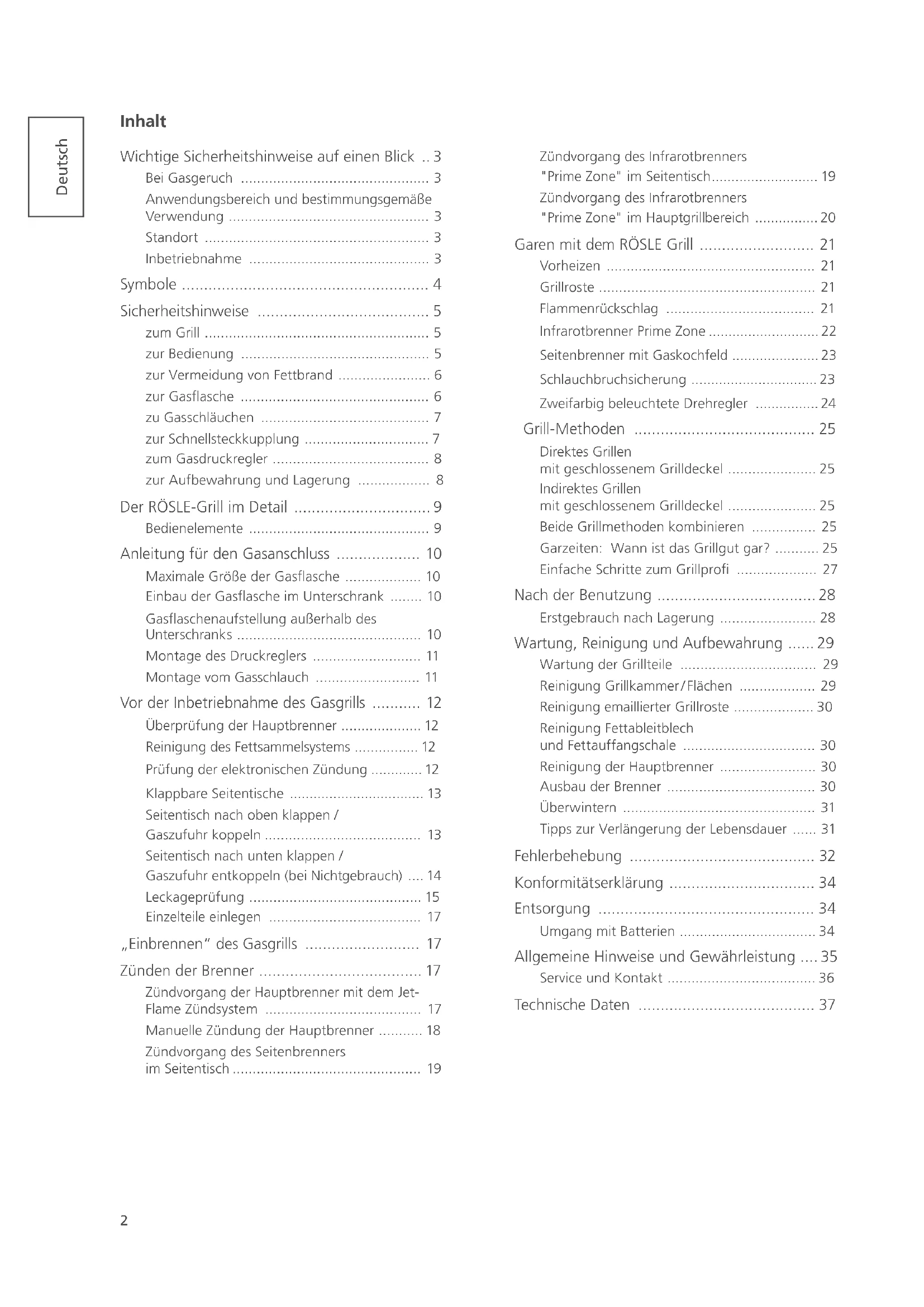 - Zündvorgang des Seitenbrenners im Seitentisch Deutsch SehrgeehrterRÖSLE-Kunde, Herzlichen Glückwunsch! Sie haben sich für den hochwertigen Grill aus dem Hause RÖSLE entschieden. Eine gute Wahl – eine Entscheidung für ein langlebiges Qualitätsprodukt. Diese Bedienungsanleitung ist Bestandteil dieses Produktes. Sie enthält wichtige Hinweise für Sicherheit, Gebrauch und Entsorgung. Machen Sie sich vor der Benutzung des Produktes mit allen Bedien- und Sicher- heitshinweisen vertraut. Benutzen Sie das Produkt nur wie beschrieben und für die angegebenen Einsatz- bereiche. Händigen Sie alle Unterlagen bei Weitergabe des Produktes an Dritte mit aus. WichtigeSicherheitshinweiseaufeinenBlick Nur im Freien verwenden! ACHTUNG: Zugängliche Teile können sehr heiß sein. Kinder fernhalten. Das Gerät muss während des Betriebs von brennbaren Materialien ferngehalten werden. Gerät während des Betriebs nicht bewegen. Nach Gebrauch die Gaszufuhr an der Gasasche schließen. Keine Änderung am Gerät vornehmen. BeiGasgeruch p. 193