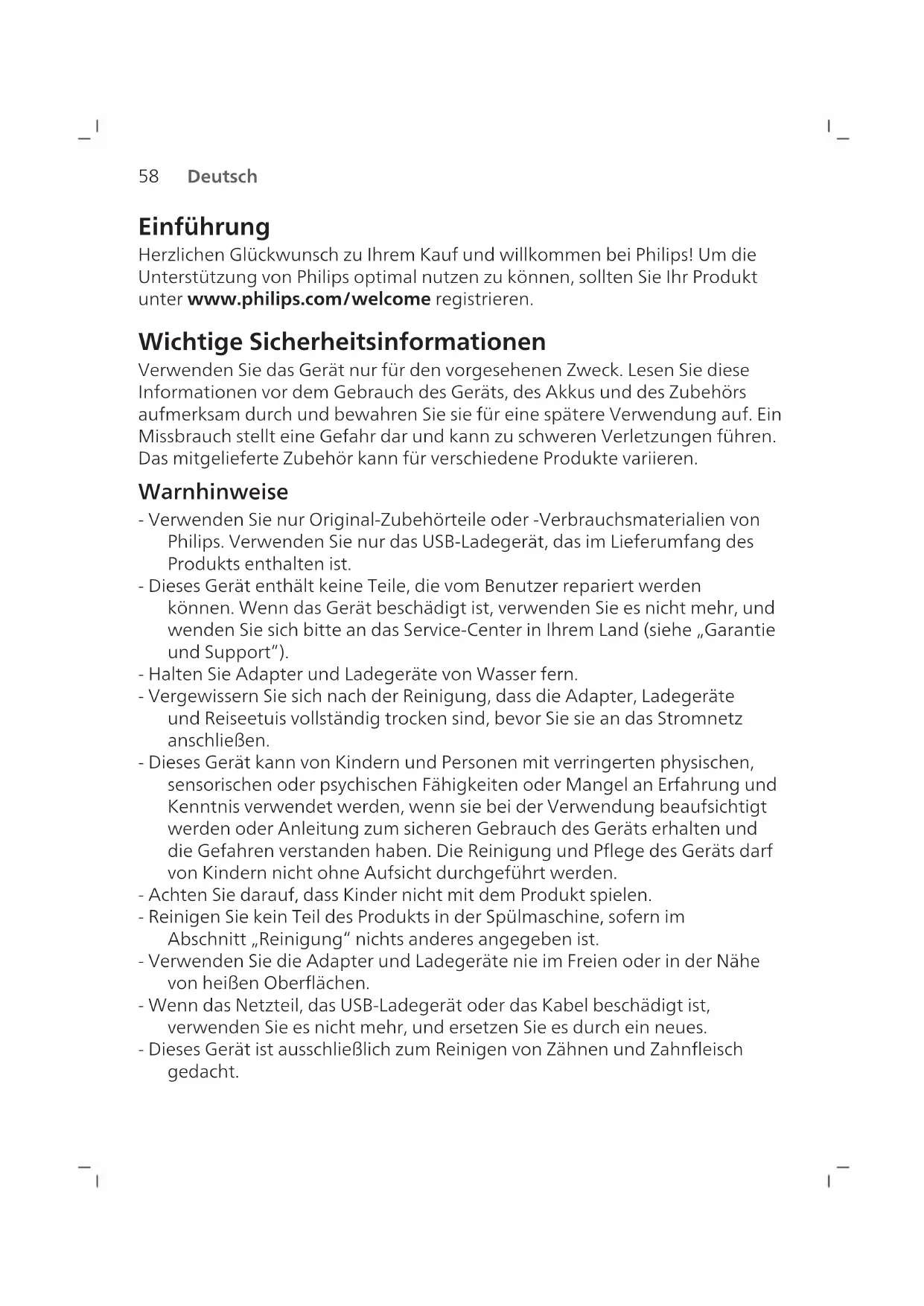 Deutsch Einführung Herzlichen Glückwunsch zu Ihrem Kauf und willkommen bei Philips! Um die Unterstützung von Philips optimal nutzen zu können, sollten Sie Ihr Produkt unter www.philips.com/welcome registrieren. Wichtige Sicherheitsinformationen Verwenden Sie das Gerät nur für den vorgesehenen Zweck. Lesen Sie diese Informationen vor dem Gebrauch des Geräts, des Akkus und des Zubehörs aufmerksam durch und bewahren Sie sie für eine spätere Verwendung auf. Ein Missbrauch stellt eine Gefahr dar und kann zu schweren Verletzungen führen. Das mitgelieferte Zubehör kann für verschiedene Produkte variieren. Warnhinweise - Verwenden Sie nur Original-Zubehörteile oder -Verbrauchsmaterialien von Philips. Verwenden Sie nur das USB-Ladegerät, das im Lieferumfang des Produkts enthalten ist. - Dieses Gerät enthält keine Teile, die vom Benutzer repariert werden können. Wenn das Gerät beschädigt ist, verwenden Sie es nicht mehr, und wenden Sie sich bitte an das Service‑Center in Ihrem Land (siehe „Garantie und Support”). - Halten Sie Adapter und Ladegeräte von Wasser fern. - Vergewissern Sie sich nach der Reinigung, dass die Adapter, Ladegeräte und Reiseetuis vollständig trocken sind, bevor Sie sie an das Stromnetz anschließen. - Dieses Gerät kann von Kindern und Personen mit verringerten physischen, sensorischen oder psychischen Fähigkeiten oder Mangel an Erfahrung und Kenntnis verwendet werden, wenn sie bei der Verwendung beaufsichtigt werden oder Anleitung zum sicheren Gebrauch des Geräts erhalten und die Gefahren verstanden haben. Die Reinigung und Pflege des Geräts darf von Kindern nicht ohne Aufsicht durchgeführt werden. - Achten Sie darauf, dass Kinder nicht mit dem Produkt spielen. - Reinigen Sie kein Teil des Produkts in der Spülmaschine, sofern im Abschnitt „Reinigung“ nichts anderes angegeben ist. - Verwenden Sie die Adapter und Ladegeräte nie im Freien oder in der Nähe von heißen Oberflächen. - Wenn das Netzteil, das USB-Ladegerät oder das Kabel beschädigt ist, verwenden Sie es nicht mehr, und ersetzen Sie es durch ein neues. - Dieses Gerät ist ausschließlich zum Reinigen von Zähnen und Zahnfleisch gedacht.59 Deutsch - Ersetzen Sie den Bürstenkopf alle 3Monate oder früher, falls Anzeichen von Abnutzung auftreten. Unterlassen Sie es, einen Bürstenkopf mit abgeknickten oder zerdrückten Borsten zu verwenden. - Spülen Sie das gesamte Handstück, insbesondere die Verbindung zum Bürstenkopf. Reinigen Sie vorsichtig die Gummidichtung. - Stellen Sie sicher, dass Bürstenkopf und Zahnbürste trocken sind, bevor Sie sie in der Reisebox aufbewahren. - Vermeiden Sie direkten Kontakt mit Produkten, die ätherische Öle oder Kokosnussöl enthalten. Der Kontakt kann zum Lösen von Borsten führen. - Die maximale Höhe der Nutzung beträgt 4500Meter. - Informationen zu in Philips-Produkten enthaltenen REACH-Stoffen finden Sie unter www.philips.com/REACH. Medizinische Warnhinweise - Verwenden Sie das Gerät nicht mehr, und konsultieren Sie Ihren Zahnarzt/Arzt, wenn übermäßiges oder länger anhaltendes Zahnfleischbluten auftritt oder wenn Sie beim Gebrauch Unbehagen oder Schmerzen verspüren. - Wenden Sie sich als Träger eines Herzschrittmachers oder eines anderen Implantats vor der Verwendung dieses Geräts an Ihren Arzt oder den Hersteller des implantierten Gerätes. - Dieses Gerät ist ein Gerät zur individuellen Mundpflege und nicht für die Verwendung durch mehrere Benutzer vorgesehen. Batterie-Sicherheitsanweisungen - Dieses Gerät verwendet Akkus, die nur von fachkundigen Personen entfernt werden dürfen. - Halten Sie das Produkt und die Akkus von Feuer fern und setzen Sie sie nicht direktem Sonnenlicht oder hohen Temperaturen aus. - Wenn das Produkt ungewöhnlich heiß wird, einen ungewöhnlichen Geruch entwickelt, die Farbe ändert oder wenn das Laden viel länger dauert als üblich, beenden Sie die Verwendung und das Laden des Produkts und wenden Sie sich an Philips. - Legen Sie die Produkte und Akkus nicht in die Mikrowelle oder auf Induktionsherde. - Öffnen, modifizieren, durchstechen, beschädigen oder zerlegen Sie das Produkt oder den Akku nicht, um zu verhindern, dass sich die Akkus erhitzen oder giftige oder gefährliche Substanzen freisetzen. Schließen Sie Akkus nicht kurz, überladen Sie sie nicht und laden Sie sie nicht mit verkehrter Polarität.60 Deutsch - Dieses Gerät verwendet Akkus, die nicht austauschbar sind. Wenn der Akku das Ende seiner Lebenszeit erreicht hat, muss das Gerät ordnungsgemäß entsorgt werden (siehe Abschnitt „Recycling“). - Laden Sie nur mit den Philips Adaptern WAA1001, WAA2001, den sicherheitsgeprüften IPX4-Adaptern mit Eingangsleistung (100‑240V~; 50/60Hz; 3,5W) und Ausgangsleistung (5VGleichspannung; 2,5W) auf. Die Liste der Adapter finden Sie unter www.philips.com/support. - Benutzen und laden Sie das Produkt bei Temperaturen zwischen 0°C und 40°C. Umgebungsbedingungen– Aufbewahrung und Transport Temperatur -20°C bis +60°C. Elektromagnetische Felder Dieses Philips Gerät erfüllt sämtliche Normen und Regelungen bezüglich der Exposition in elektromagnetischen Feldern.