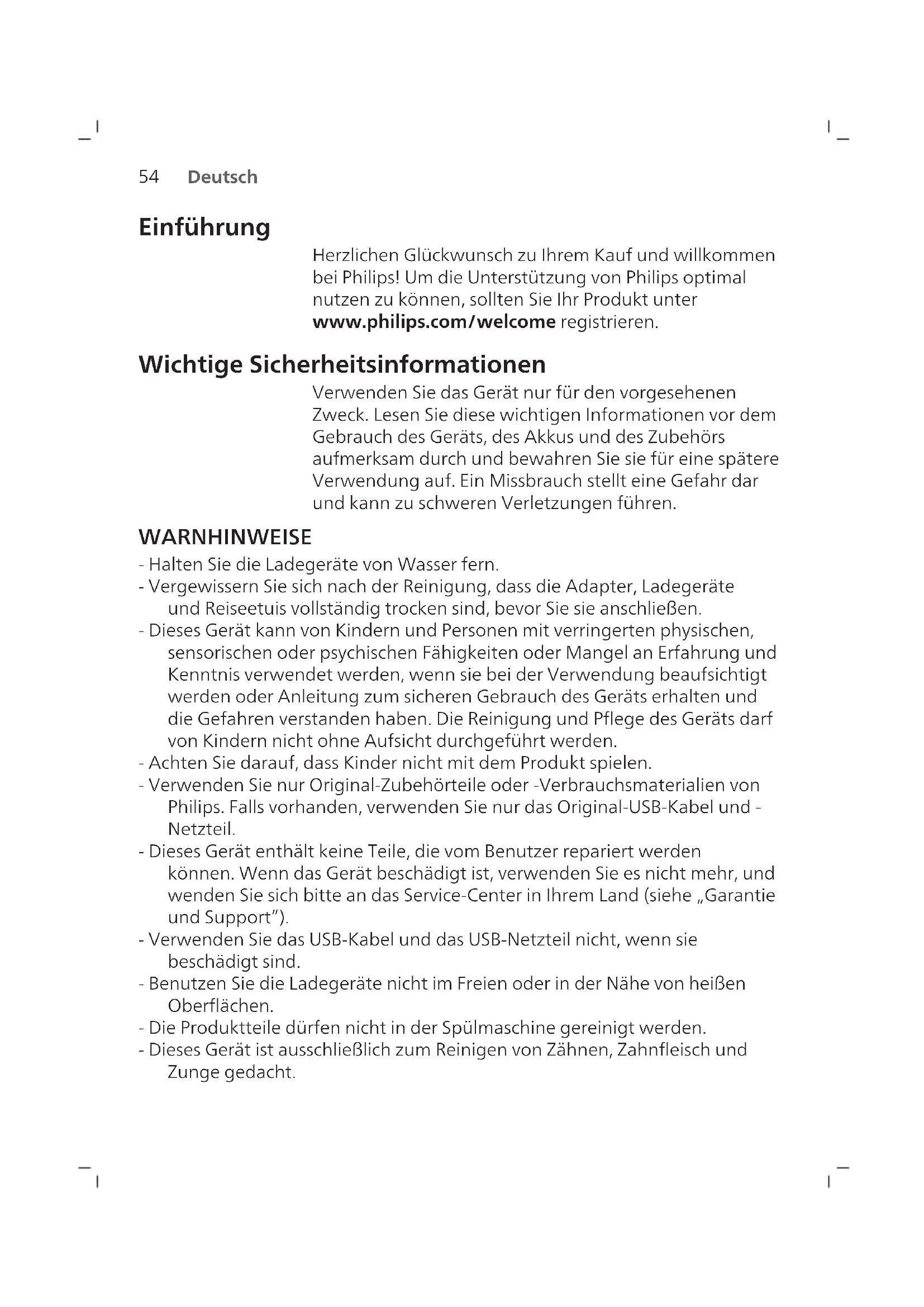 Deutsch Einführung Herzlichen Glückwunsch zu Ihrem Kauf und willkommen bei Philips! Um die Unterstützung von Philips optimal nutzen zu können, sollten Sie Ihr Produkt unter www.philips.com/welcome registrieren. Wichtige Sicherheitsinformationen Verwenden Sie das Gerät nur für den vorgesehenen Zweck. Lesen Sie diese wichtigen Informationen vor dem Gebrauch des Geräts, des Akkus und des Zubehörs aufmerksam durch und bewahren Sie sie für eine spätere Verwendung auf. Ein Missbrauch stellt eine Gefahr dar und kann zu schweren Verletzungen führen. WARNHINWEISE - Halten Sie die Ladegeräte von Wasser fern. - Vergewissern Sie sich nach der Reinigung, dass die Adapter, Ladegeräte und Reiseetuis vollständig trocken sind, bevor Sie sie anschließen. - Dieses Gerät kann von Kindern und Personen mit verringerten physischen, sensorischen oder psychischen Fähigkeiten oder Mangel an Erfahrung und Kenntnis verwendet werden, wenn sie bei der Verwendung beaufsichtigt werden oder Anleitung zum sicheren Gebrauch des Geräts erhalten und die Gefahren verstanden haben. Die Reinigung und Pflege des Geräts darf von Kindern nicht ohne Aufsicht durchgeführt werden. - Achten Sie darauf, dass Kinder nicht mit dem Produkt spielen. - Verwenden Sie nur Original-Zubehörteile oder -Verbrauchsmaterialien von Philips. Falls vorhanden, verwenden Sie nur das Original-USB-Kabel und - Netzteil. - Dieses Gerät enthält keine Teile, die vom Benutzer repariert werden können. Wenn das Gerät beschädigt ist, verwenden Sie es nicht mehr, und wenden Sie sich bitte an das Service‑Center in Ihrem Land (siehe „Garantie und Support”). - Verwenden Sie das USB-Kabel und das USB-Netzteil nicht, wenn sie beschädigt sind. - Benutzen Sie die Ladegeräte nicht im Freien oder in der Nähe von heißen Oberflächen. - Die Produktteile dürfen nicht in der Spülmaschine gereinigt werden. - Dieses Gerät ist ausschließlich zum Reinigen von Zähnen, Zahnfleisch und Zunge gedacht.55 Deutsch - Unterlassen Sie es, einen Bürstenkopf mit abgeknickten oder zerdrückten Borsten zu verwenden. Ersetzen Sie den Bürstenkopf alle 3Monate oder früher, falls Anzeichen von Abnutzung auftreten. - Vermeiden Sie direkten Kontakt mit Produkten, die ätherische Öle oder Kokosnussöl enthalten. Der Kontakt kann zum Lösen von Borsten führen. MEDIZINISCHE HINWEISE - Verwenden Sie das Gerät nicht mehr, und konsultieren Sie Ihren Zahnarzt/Arzt, wenn übermäßiges Zahnfleischbluten auftritt oder Zahnfleischbluten länger als eine Woche anhält oder wenn Sie beim Gebrauch Unbehagen oder Schmerzen verspüren. - Wenn in den vergangenen 2Monaten ein chirurgischer Eingriff an Ihren Zähnen oder am Zahnfleisch vorgenommen wurde, sollten Sie vor Benutzung des Geräts Ihren Zahnarzt konsultieren. - Wenden Sie sich als Träger eines Herzschrittmachers oder eines anderen Implantats vor der Verwendung dieses Geräts an Ihren Arzt oder den Hersteller des implantierten Gerätes. - Sollten Sie Bedenken wegen Ihrer Gesundheit haben, konsultieren Sie vor Benutzung dieses Geräts Ihren Arzt. - Dieses Gerät ist ein Gerät zur individuellen Mundpflege und nicht für die Verwendung durch mehrere Patienten in einer Zahnarztpraxis oder Zahnklinik geeignet. BATTERIE-SICHERHEITSANWEISUNGEN - Laden Sie nur mit dem Philips Adapter WAA1001, WAA2001 oder sicherheitsgeprüften Adaptern mit Eingangsleistung (100 – 240 V~; 50/60 Hz; 3,5W) und Ausgangsleistung (5V DC; 2,5W) auf. Die Liste der Adapter finden Sie unter www.philips.com/support. - Dieses Gerät verwendet Akkus, die nur von fachkundigen Personen entfernt werden dürfen. - Laden und verwenden Sie das Gerät bei Temperaturen zwischen 32 °F / 0°C und 104 °F / 40°C. - Verwenden Sie das Gerät nur für den vorgesehenen Zweck. Lesen Sie diese Informationen vor dem Gebrauch des Geräts, des Akkus und des Zubehörs aufmerksam durch und bewahren Sie sie für eine spätere Verwendung auf. Ein Missbrauch stellt eine Gefahr dar und kann zu schweren Verletzungen führen. Das mitgelieferte Zubehör kann für verschiedene Produkte variieren. - Verwenden Sie nur Original-Zubehörteile und -Verbrauchsmaterialien von Philips. - Halten Sie das Produkt und die Akkus von Feuer fern und setzen Sie sie keinem direkten Sonnenlicht oder hohen Temperaturen aus.56 Deutsch - Wenn das Produkt ungewöhnlich heiß wird, einen ungewöhnlichen Geruch entwickelt, die Farbe ändert oder wenn das Laden viel länger dauert als üblich, beenden Sie die Verwendung und das Laden des Produkts und wenden Sie sich an Philips. - Legen Sie die Produkte und die Batterien nicht in Mikrowellen oder auf Induktionsherde. - Um die Aufheizung oder die Freisetzung giftiger oder gefährlicher Substanzen aus den Akkus zu verhindern, sollten Sie das Produkt oder die Akkus nicht öffnen, modifizieren, durchbohren, beschädigen oder zerlegen. Überladen Sie die Akkus nicht, verursachen Sie keinen Kurzschluss und laden Sie sie nicht umgekehrt auf. - Dieses Gerät verwendet Akkus, die nicht austauschbar sind. Wenn der Akku das Ende seiner Lebenszeit erreicht hat, muss das Gerät ordnungsgemäß entsorgt werden (siehe Abschnitt „Recycling“). - Dieses Gerät verwendet eine wiederaufladbare Lithium-Ionen-Zelle. MUSS DEM RECYCLING ZUGEFÜHRT ODER ORDNUNGSGEMÄSS ENTSORGT WERDEN. Die folgenden Symbole können auf dem Produkt angezeigt werden: Lesen Sie die Bedienungsanleitung. Abnehmbares Netzteil:Mit „xxxxxx“ wird die Modellnummer der zugelassenen Ladegeräte angegeben. Umgebungsbedingungen– Aufbewahrung und Transport - Temperaturbereich (Lagerung und Transport) von -10°C bis +60°C (14°F und 140°F).57 Deutsch Elektromagnetische Felder (EMF) Dieses Philips Gerät erfüllt sämtliche Normen und Vorschriften bezüglich der Gefährdung durch elektromagnetische Felder. Vorgesehener Verwendungszweck Elektrische Zahnbürsten der 1000 und 2000 Series sind zur Beseitigung von Plaque und Speiseresten von den Zähnen, zur Reduzierung von Karies sowie zur Verbess