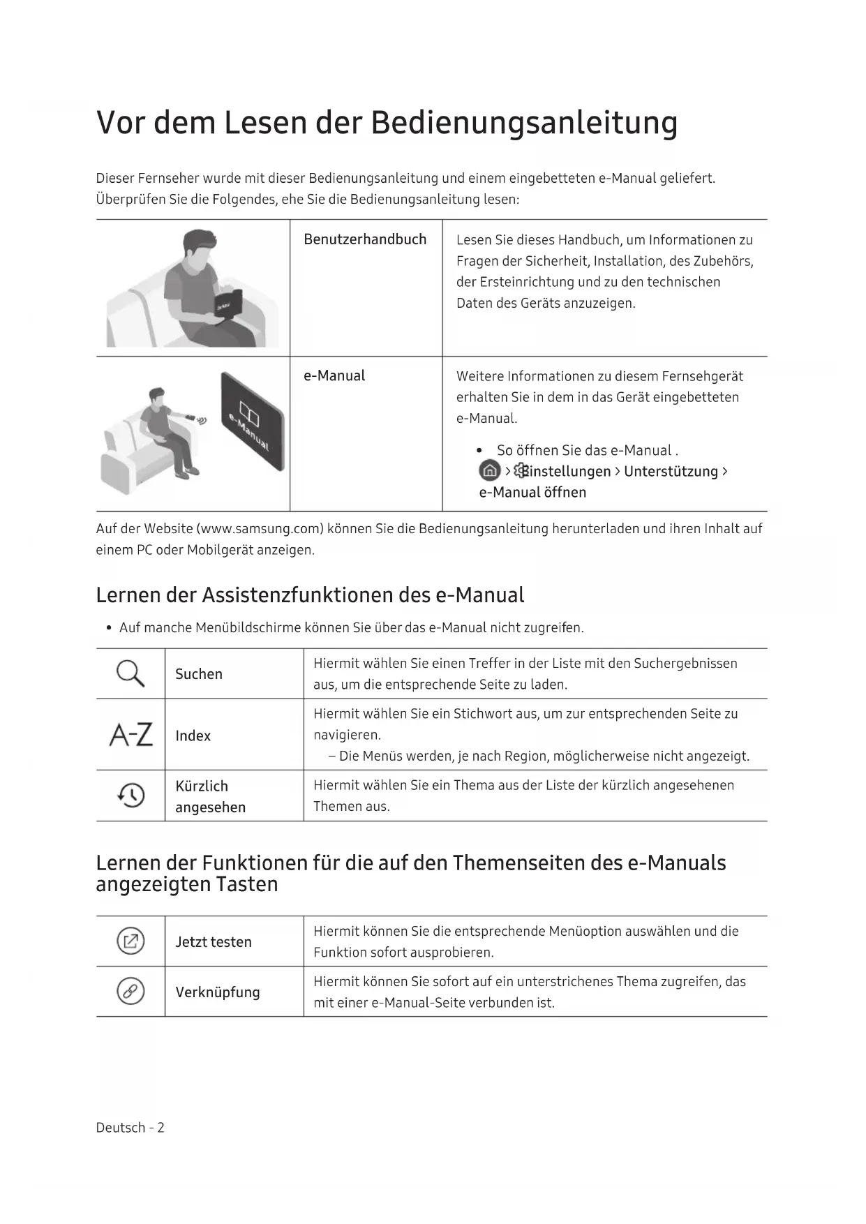 - So öffnen Sie das e-Manual . > Einstellungen > Unterstützung > e-Manual öffnen Auf der Website (www.samsung.com) können Sie die Bedienungsanleitung herunterladen und ihren Inhalt auf einem PC oder Mobilgerät anzeigen. Lernen der Assistenzfunktionen des e-Manual