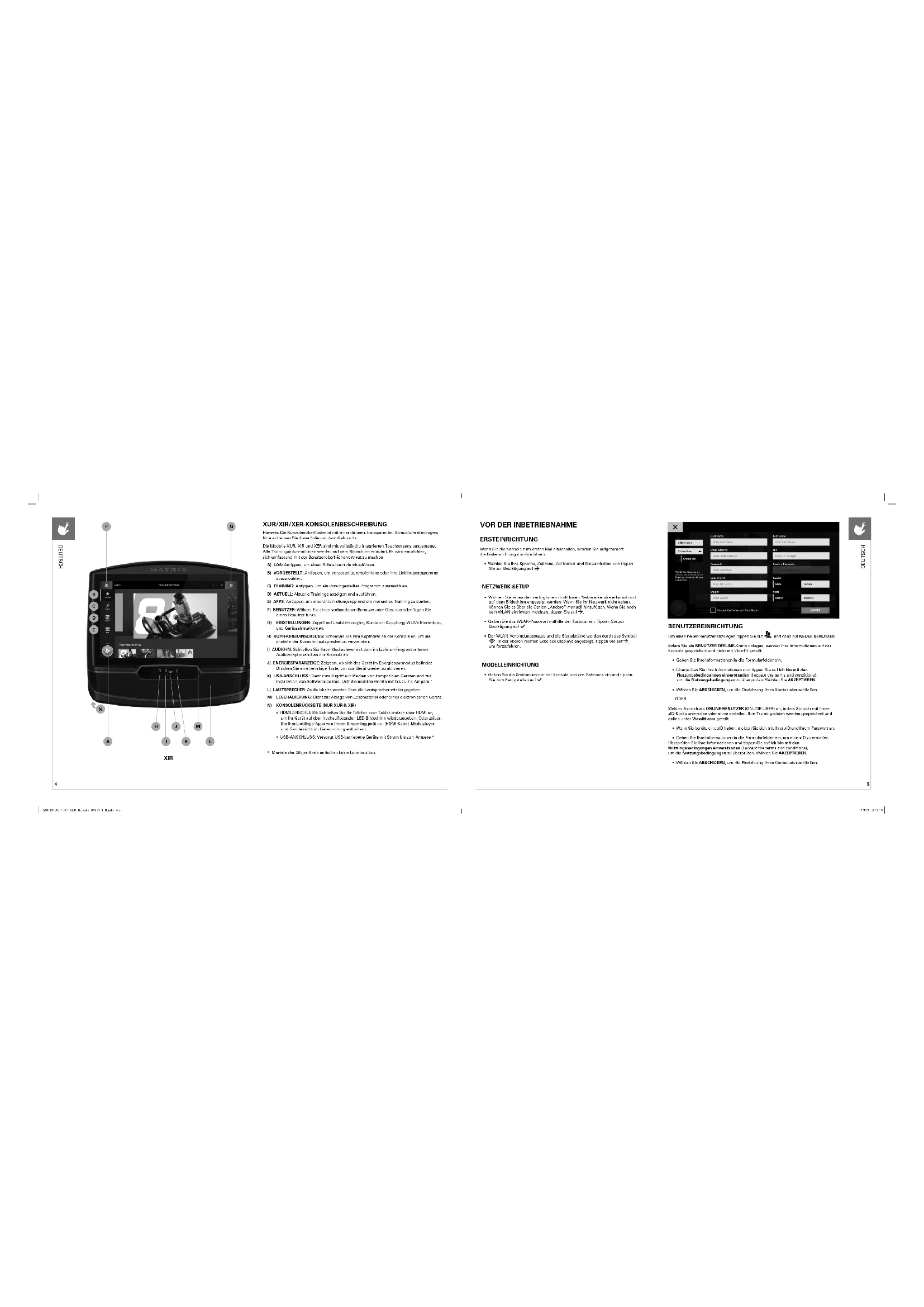 Hinweis: Die Konsolenoberfläche ist mit einer dünnen, transparenten Schutzfolie überzogen; bitte entfernen Sie diese Folie vor dem Gebrauch.Die Modelle XUR, XIR und XER sind mit vollständig integrierten Touchscreens ausgestattet. Alle Trainingsinformationen werden auf dem Bildschirm erläutert. Es wird empfohlen, sichumfassend mit der Benutzeroberfläche vertraut zu machenA) LOS: Antippen, um einen Schnellstart durchzuführen.B) VORGESTELLT: Antippen, um vorgestellte, empfohlene oder Ihre Lieblingsprogramme auszuwählen.C) TRAINING: Antippen, um ein voreingestelltes Programm auszuwählen.D) AKTUELL: Aktuelle Trainings anzeigen und ausführen.E) APPS: Antippen, um eine Unterhaltungsapp und ein manuelles Training zu starten.F) BENUTZER: Wählen Sie einen vorhandenen Benutzer oder Gast aus oder fügen Sie einen Benutzer hinzu. G) EINSTELLUNGEN: Zugriff auf Lautstärkeregler, Bluetooth-Kopplung, WLAN-Einrichtung und Geräteeinstellungen.H) KOPFHÖRERANSCHLUSS: Schließen Sie Ihre Kopfhörer an die Konsole an, um sie anstelle der Konsolenlautsprecher zu verwenden.I) AUDIO-IN: Schließen Sie Ihren Mediaplayer mit dem im Lieferumfang enthaltenen Audioadapterkabel an der Konsole an.J) ENERGIESPARANZEIGE: Zeigt an, ob sich das Gerät im Energiesparmodus befindet. Drücken Sie eine beliebige Taste, um das Gerät wieder zu aktivieren.K) USB-ANSCHLUSS: Dient zum Zugriff auf Medien von kompatiblen Geräten und zur Installation von Softwareupdates. Lädt die meisten Geräte mit bis zu 2,4 Ampere.*L) LAUTSPRECHER: Audioinhalte werden über die Lautsprecher wiedergegeben. M) LESEHALTERUNG: Dient zur Ablage von Lesematerial oder eines elektronischen Geräts. N) KONSOLENRÜCKSEITE (NUR XUR & XIR)• HDMI-ANSCHLUSS: Schließen Sie Ihr Telefon oder Tablet einfach über HDMI an, umIhr Gerät auf dem hochauflösenden LED-Bildschirm wiederzugeben. Oder zeigen Sie Ihre Lieblings-Apps von Ihrem Streaminggerät an. (HDMI-Kabel, Mediaplayer undGeräte nicht im Lieferumfang enthalten).• USB-ANSCHLUSS: Versorgt USB-betriebene Geräte mit Strom bis zu 1 Ampere.** Modelle der 30iger-Serie enthalten keine Ladefunktion. XIR
