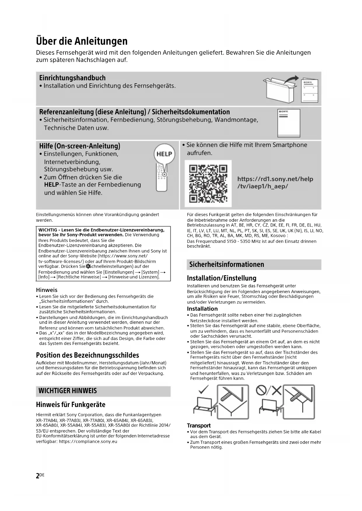 - Lesen Sie sich vor der Bedienung des Fernsehgeräts die „Sicherheitsinformationen“ durch.• Lesen Sie die mitgelieferte Sicherheitsdokumentation für zusätzliche Sicherheitsinformationen.• Darstellungen und Abbildungen, die im Einrichtungshandbuch und in dieser Anleitung verwendet werden, dienen nur der Referenz und können vom tatsächlichen Produkt abweichen.• Das „x“/„xx“ das in der Modellbezeichnung angegeben wird, entspricht einer Ziffer, die sich auf das Design, die Farbe oder das System des Fernsehgeräts bezieht. Position des Bezeichnungsschildes Aufkleber mit Modellnummer, Herstellungsdatum (Jahr/Monat) und Bemessungsdaten für die Betriebsspannung befinden sich auf der Rückseite des Fernsehgeräts oder auf der Verpackung. WICHTIGER HINWEIS Hinweis für Funkgeräte Hiermit erklärt Sony Corporation, dass die Funkanlagentypen XR-77A84J, XR-77A83J, XR-77A80J, XR-65A84J, XR-65A83J, XR-65A80J, XR-55A84J, XR-55A83J, XR-55A80J der Richtlinie 2014/53/EU entsprechen. Der vollständige Text der EU-Konformitätserklärung ist unter der folgenden Internetadresse verfügbar: https://compliance.sony.euFür dieses Funkgerät gelten die folgenden Einschränkungen für die Inbetriebnahme oder Anforderungen an die Betriebszulassung in AT, BE, HR, CY, CZ, DK, EE, FI, FR, DE, EL, HU, IE, IT, LV, LT, LU, MT, NL, PL, PT, SK, SI, ES, SE, UK, UK (NI), IS, LI, NO, CH, BG, RO, TR, AL, BA, MK, MD, RS, ME, Kosovo :Das Frequenzband 5150 - 5350 MHz ist auf den Einsatz drinnen beschränkt. Sicherheitsinformationen Installation/Einstellung Installieren und benutzen Sie das Fernsehgerät unter Berücksichtigung der im Folgenden angegebenen Anweisungen, um alle Risiken wie Feuer, Stromschlag oder Beschädigungen und/oder Verletzungen zu vermeiden. Installation