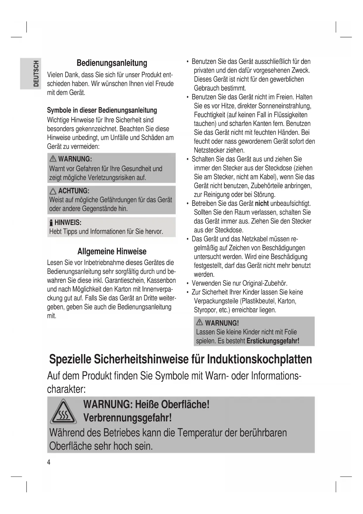- Zur Sicherheit Ihrer Kinder lassen Sie keine Verpackungsteile (Plastikbeutel, Karton, Styropor, etc.) erreichbar liegen. WARNUNG! Lassen Sie kleine Kinder nicht mit Folie spielen. Es besteht Erstickungsgefahr! Spezielle Sicherheitshinweise für Induktionskochplatten Auf dem Produkt finden Sie Symbole mit Warn- oder Informations- charakter: WARNUNG: Heiße Oberfläche! Verbrennungsgefahr! Während des Betriebes kann die Temperatur der berührbaren Oberfläche sehr hoch sein.5 WARNUNG: