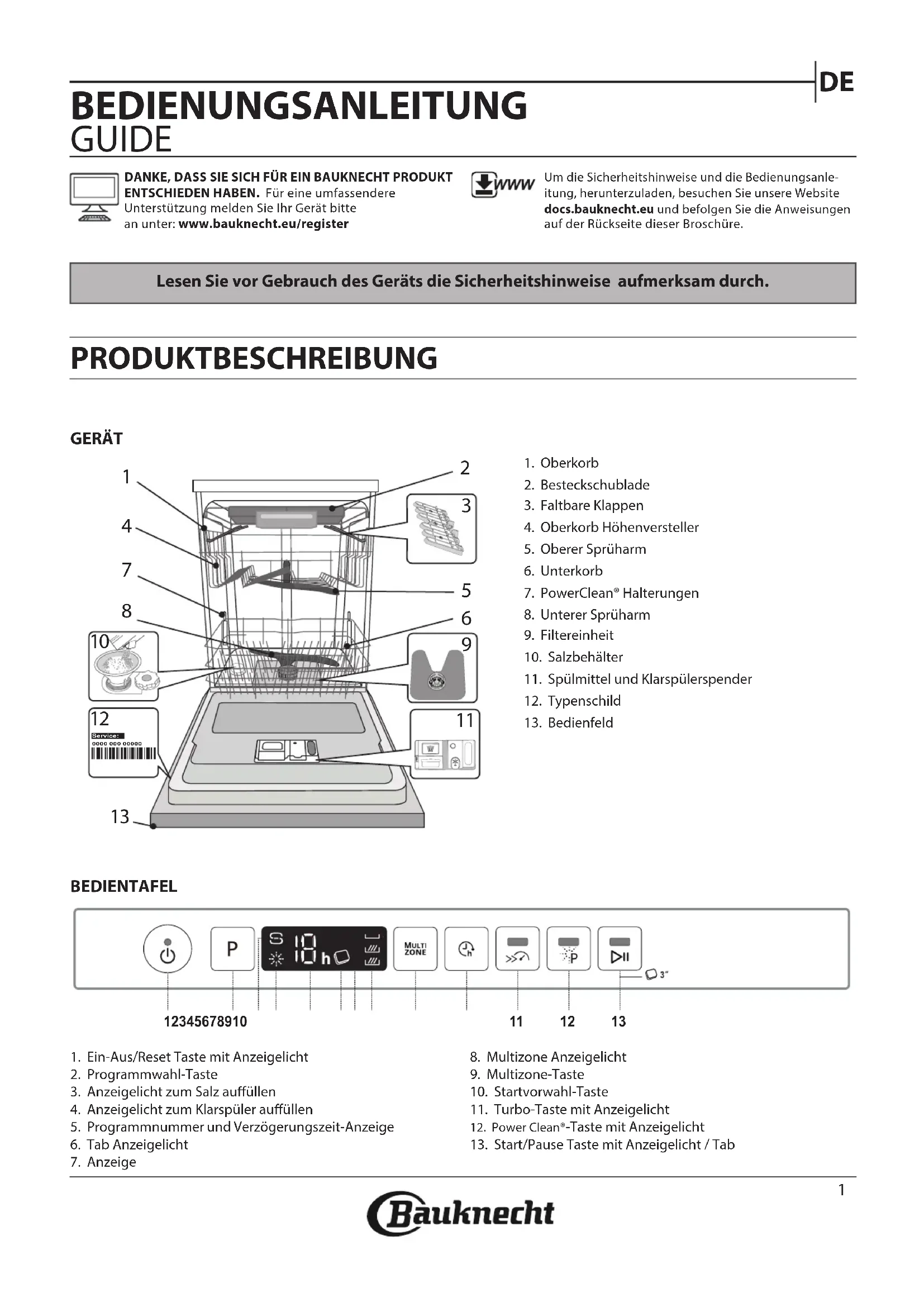 Lesen Sie vor Gebrauch des Geräts die Sicherheitshinweise aufmerksam durch. GERÄT PRODUKTBESCHREIBUNG BEDIENUNGSANLEITUNG GUIDE BEDIENTAFEL DANKE, DASS SIE SICH FÜR EIN BAUKNECHT PRODUKT ENTSCHIEDEN HABEN. Für eine umfassendere Unterstützung melden Sie Ihr Gerät bittean unter: www.bauknecht.eu/registerUm die Sicherheitshinweise und die Bedienungsanle-itung, herunterzuladen, besuchen Sie unsere Website docs.bauknecht.eu und befolgen Sie die Anweisungen auf der Rückseite dieser Broschüre.1. Oberkorb2. Besteckschublade3. Faltbare Klappen4. Oberkorb Höhenversteller5. Oberer Sprüharm6. Unterkorb7. PowerClean® Halterungen8. Unterer Sprüharm9. Filtereinheit10. Salzbehälter11. Spülmittel und Klarspülerspender12. Typenschild13. Bedienfeld1. Ein-Aus/Reset Taste mit Anzeigelicht2. Programmwahl-Taste3. Anzeigelicht zum Salz auüllen4. Anzeigelicht zum Klarspüler auüllen5. Programmnummer und Verzögerungszeit-Anzeige6. Tab Anzeigelicht7. Anzeige8. Multizone Anzeigelicht9. Multizone-Taste10. Startvorwahl-Taste11. Turbo-Taste mit Anzeigelicht12. Power Clean®-Taste mit Anzeigelicht13. Start/Pause Taste mit Anzeigelicht / Tab1 2 3 4 5 6 7 8 9 1011 12 130000 000 00000 Service: