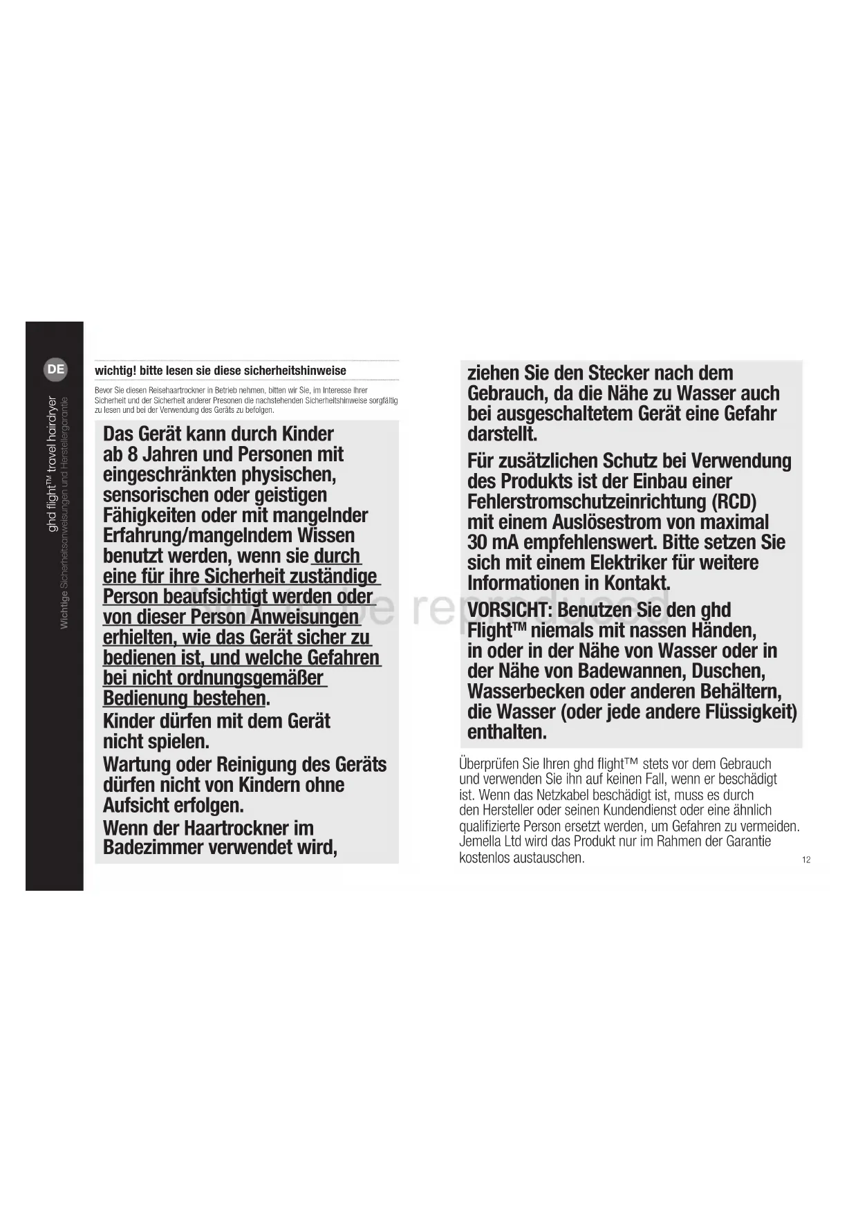 niemals mit nassen Händen, in oder in der Nähe von Wasser oder in der Nähe von Badewannen, Duschen, Wasserbecken oder anderen Behältern, die Wasser (oder jede andere Flüssigkeit) enthalten. Überprüfen Sie Ihren ghd ight™ stets vor dem Gebrauch und verwenden Sie ihn auf keinen Fall, wenn er beschädigt ist. Wenn das Netzkabel beschädigt ist, muss es durch den Hersteller oder seinen Kundendienst oder eine ähnlich qualizierte Person ersetzt werden, um Gefahren zu vermeiden. Jemella Ltd wird das Produkt nur im Rahmen der Garantie kostenlos austauschen. wichtig! bitte lesen sie diese sicherheitshinweise Bevor Sie diesen Reisehaartrockner in Betrieb nehmen, bitten wir Sie, im Interesse Ihrer Sicherheit und der Sicherheit anderer Presonen die nachstehenden Sicherheitshinweise sorgfältig zu lesen und bei der Verwendung des Geräts zu befolgen. Das Gerät kann durch Kinder ab 8 Jahren und Personen mit eingeschränkten physischen, sensorischen oder geistigen Fähigkeiten oder mit mangelnder Erfahrung/mangelndem Wissen benutzt werden, wenn sie durch eine für ihre Sicherheit zuständige Person beaufsichtigt werden oder von dieser Person Anweisungen erhielten, wie das Gerät sicher zu bedienen ist, und welche Gefahren bei nicht ordnungsgemäßer Bedienung bestehen. Kinder dürfen mit dem Gerät nicht spielen. Wartung oder Reinigung des Geräts dürfen nicht von Kindern ohne Aufsicht erfolgen. Wenn der Haartrockner im Badezimmer verwendet wird, Not to be reproduced1413