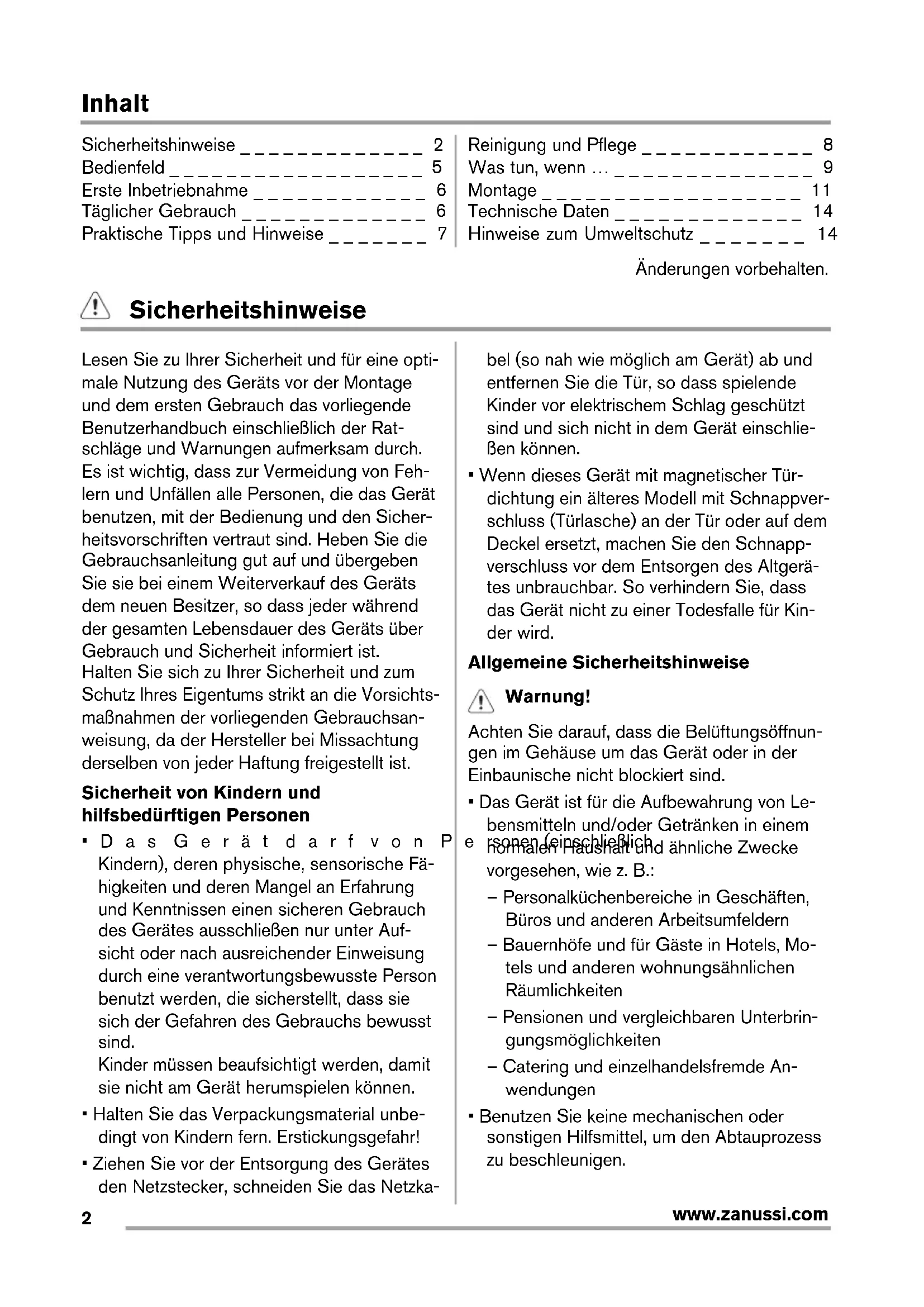 User manual 39 Gefriergerät Congélateur Congelatore Freezer ZFT11111AInhalt Sicherheitshinweise _ _ _ _ _ _ _ _ _ _ _ _ _ 2 Bedienfeld _ _ _ _ _ _ _ _ _ _ _ _ _ _ _ _ _ _ 5 Erste Inbetriebnahme _ _ _ _ _ _ _ _ _ _ _ _ 6 Täglicher Gebrauch _ _ _ _ _ _ _ _ _ _ _ _ _ 6 Praktische Tipps und Hinweise _ _ _ _ _ _ _ 7 Reinigung und Pflege _ _ _ _ _ _ _ _ _ _ _ _ 8 Was tun, wenn … _ _ _ _ _ _ _ _ _ _ _ _ _ _ 9 Montage _ _ _ _ _ _ _ _ _ _ _ _ _ _ _ _ _ _ 11 Technische Daten _ _ _ _ _ _ _ _ _ _ _ _ _ 14 Hinweise zum Umweltschutz _ _ _ _ _ _ _ 14 Änderungen vorbehalten. Sicherheitshinweise Lesen Sie zu Ihrer Sicherheit und für eine opti- male Nutzung des Geräts vor der Montage und dem ersten Gebrauch das vorliegende Benutzerhandbuch einschließlich der Rat- schläge und Warnungen aufmerksam durch. Es ist wichtig, dass zur Vermeidung von Feh- lern und Unfällen alle Personen, die das Gerät benutzen, mit der Bedienung und den Sicher- heitsvorschriften vertraut sind. Heben Sie die Gebrauchsanleitung gut auf und übergeben Sie sie bei einem Weiterverkauf des Geräts dem neuen Besitzer, so dass jeder während der gesamten Lebensdauer des Geräts über Gebrauch und Sicherheit informiert ist. Halten Sie sich zu Ihrer Sicherheit und zum Schutz Ihres Eigentums strikt an die Vorsichts- maßnahmen der vorliegenden Gebrauchsan- weisung, da der Hersteller bei Missachtung derselben von jeder Haftung freigestellt ist. Sicherheit von Kindern und hilfsbedürftigen Personen