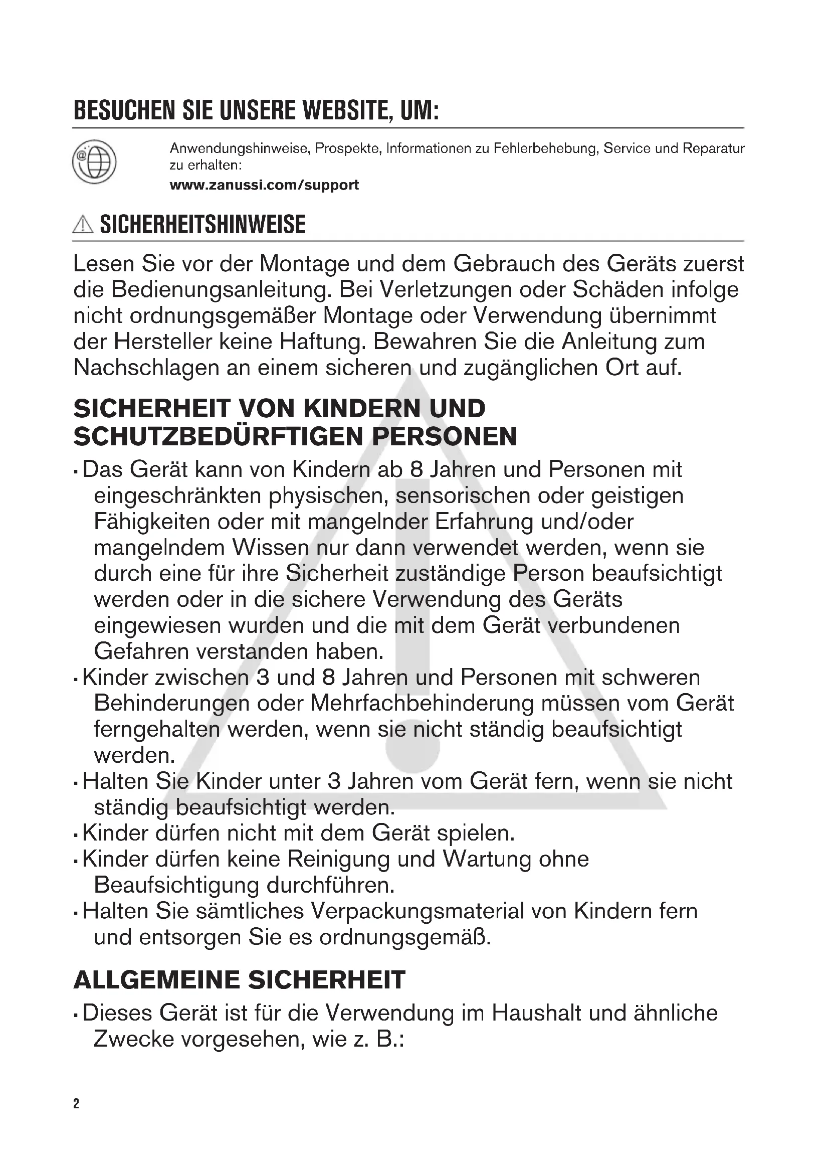 GETTING STARTED? EASY. User Manual ZCAN15EW1 DE Benutzerinformation 2 Gefriertruhe FR Notice d'utilisation 18 Congélateur coffre IT Istruzioni per l’uso 34 Congelatore a pozzo EN User Manual 49 Chest FreezerBESUCHEN SIE UNSERE WEBSITE, UM: Anwendungshinweise, Prospekte, Informationen zu Fehlerbehebung, Service und Reparatur zu erhalten: www.zanussi.com/support SICHERHEITSHINWEISE Lesen Sie vor der Montage und dem Gebrauch des Geräts zuerst die Bedienungsanleitung. Bei Verletzungen oder Schäden infolge nicht ordnungsgemäßer Montage oder Verwendung übernimmt der Hersteller keine Haftung. Bewahren Sie die Anleitung zum Nachschlagen an einem sicheren und zugänglichen Ort auf.