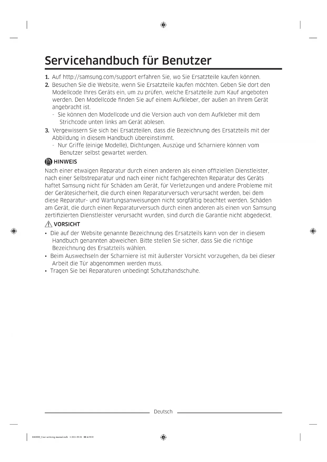 ziehen Sie ihn ganz heraus. Einbauen des Auszugs Gehen Sie beim Einbauen des Auszugs in der umgekehrten Reihenfolge wie beim Ausbauen vor. RB3000J_User-servicing-manual.indb 5 2021-09-01 4:19:59Deutsch Austauschen des Scharniers Um die Scharniere auszutauschen, müssen Sie zuerst die Türen ausbauen. VORSICHT