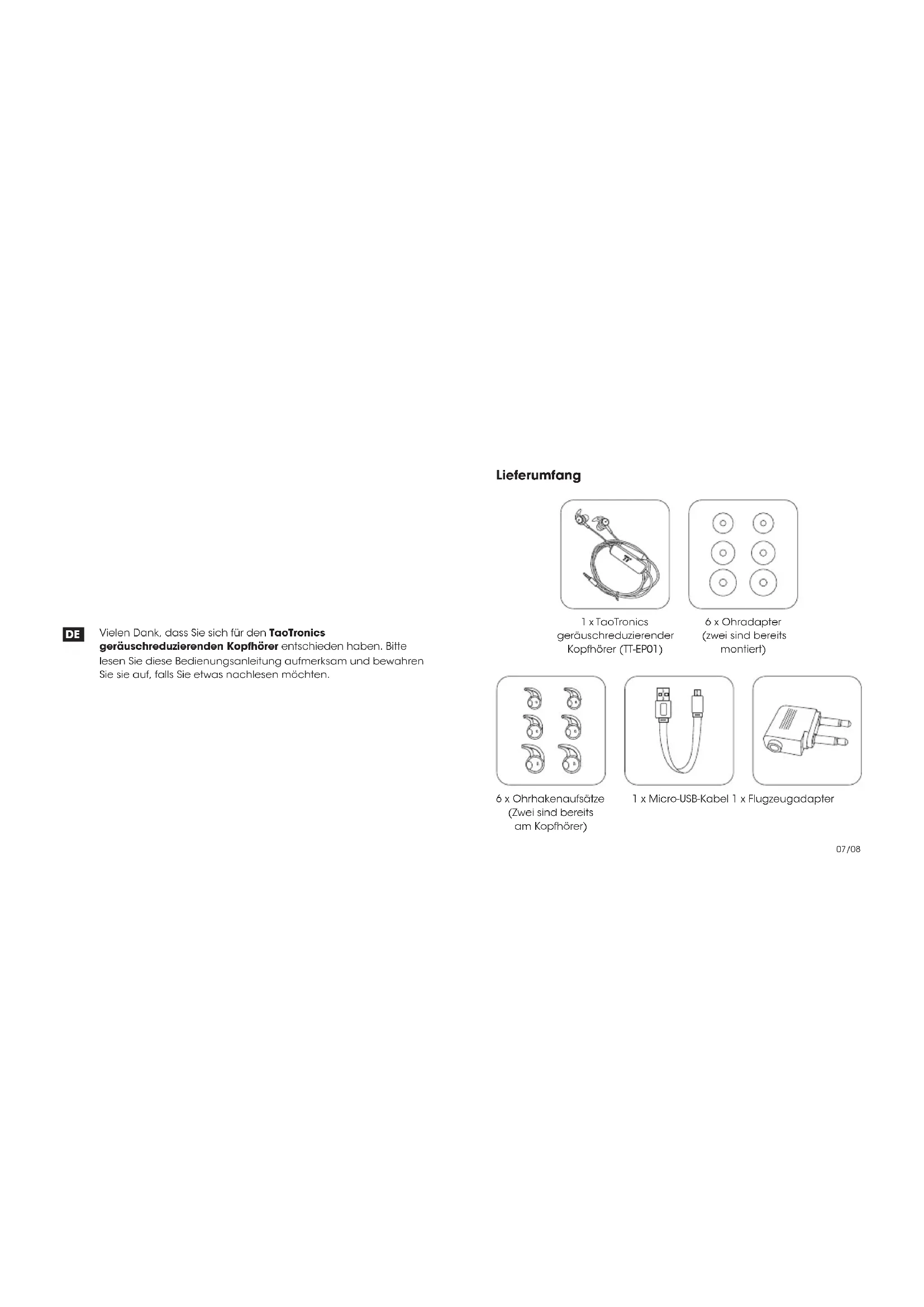 - Damage caused to any 3rd party / person / object and beyond No return will be accepted without seller authorization. Statement We can only provide after sale services for products that are sold by TaoTronics or TaoTronics authorized retailer and distributor. If you have purchased your unit from a different place, please contact the seller for return and warranty issues. 05/06Vielen Dank, dass Sie sich für den TaoTronics geräuschreduzierenden Kopfhörer entschieden haben. Bitte lesen Sie diese Bedienungsanleitung aufmerksam und bewahren Sie sie auf, falls Sie etwas nachlesen möchten.