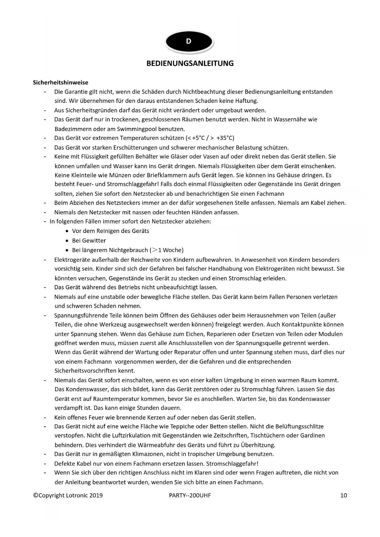 - Bei längerem Nichtgebrauch (>1 Woche) - Elektrogeräte außerhalb der Reichweite von Kindern aufbewahren. In Anwesenheit von Kindern besonders vorsichtig sein. Kinder sind sich der Gefahren bei falscher Handhabung von Elektrogeräten nicht bewusst. Sie könnten versuchen, Gegenstände ins Gerät zu stecken und einen Stromschlag erleiden. - Das Gerät während des Betriebs nicht unbeaufsichtigt lassen. - Niemals auf eine unstabile oder bewegliche Fläche stellen. Das Gerät kann beim Fallen Personen verletzen und schweren Schaden nehmen. - Spannungsführende Teile können beim Öffnen des Gehäuses oder beim Herausnehmen von Teilen (außer Teilen, die ohne Werkzeug ausgewechselt werden können) freigelegt werden. Auch Kontaktpunkte können unter Spannung stehen. Wenn das Gehäuse zum Eichen, Reparieren oder Ersetzen von Teilen oder Modulen geöffnet werden muss, müssen zuerst alle Anschlussstellen von der Spannungsquelle getrennt werden. Wenn das Gerät während der Wartung oder Reparatur offen und unter Spannung stehen muss, darf dies nur von einem Fachmann vorgenommen werden, der die Gefahren und die entsprechenden Sicherheitsvorschriften kennt. - Niemals das Gerät sofort einschalten, wenn es von einer kalten Umgebung in einen warmen Raum kommt. Das Kondenswasser, das sich bildet, kann das Gerät zerstören oder zu Stromschlag führen. Lassen Sie das Gerät erst auf Raumtemperatur kommen, bevor Sie es anschließen. Warten Sie, bis das Kondenswasser verdampft ist. Das kann einige Stunden dauern. - Kein offenes Feuer wie brennende Kerzen auf oder neben das Gerät stellen. - Das Gerät nicht auf eine weiche Fläche wie Teppiche oder Betten stellen. Nicht die Belüftungsschlitze verstopfen. Nicht die Luftzirkulation mit Gegenständen wie Zeitschriften, Tischtüchern oder Gardinen behindern. Dies verhindert die Wärmeabfuhr des Geräts und führt zu Überhitzung. - Das Gerät nur in gemäßigten Klimazonen, nicht in tropischer Umgebung benutzen. - Defekte Kabel nur von einem Fachmann ersetzen lassen. Stromschlaggefahr! - Wenn Sie sich über den richtigen Anschluss nicht im Klaren sind oder wenn Fragen auftreten, die nicht von der Anleitung beantwortet wurden, wenden Sie sich bitte an einen Fachmann. D©Copyright Lotronic 2019 PARTY--200UHF 11 FEATURES