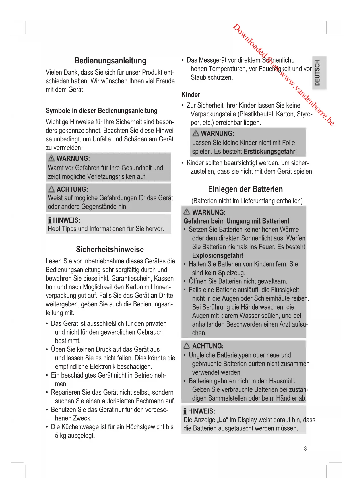 - Batterien gehören nicht in den Hausmüll. Geben Sie verbrauchte Batterien bei zustän- digen Sammelstellen oder beim Händler ab. HINWEIS: Die Anzeige „Lo“ im Display weist darauf hin, dass die Batterien ausgetauscht werden müssen. Downloaded from www.vandenborre.be4