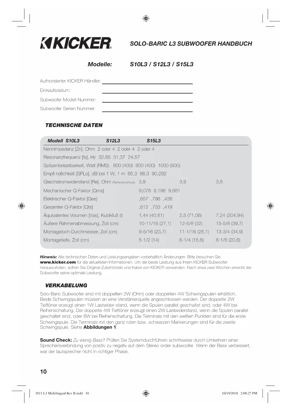 Authorisierter KICKER Händler: Einkaufsdatum: Subwoofer Modell Nummer: Subwoofer Serien Nummer: Modell S10L3 S12L3 S15L3 Nennimpedanz [Zn], Ohm 2 oder 4 2 oder 4 2 oder 4 Resonanzfrequenz [fs], Hz 32,85 31,37 24,57 Spitzenbelastbarkeit, Watt (RMS) 800 (400) 800 (400) 1000 (500) Empfi ndlichkeit [SPLo], dB bei 1 W, 1 m 85,3 86,3 90,292 Gleichstromwiderstand [Re], Ohm (Reihenanschluss) 3,9 3,9 3,8 Mechanischer Q-Faktor [Qms] 9,078 9,198 9,881 Elektrischer Q-Faktor [Qes] ,657 ,796 ,438 Gesamter Q-Faktor [Qts] ,612 ,733 ,419 Äquivalentes Volumen [Vas], Kubikfuß (l) 1,44 (40,81) 2,5 (71,06) 7,24 (204,94) Äußere Rahmenabmessung, Zoll (cm) 10-11/16 (27,1) 12-5/8 (32) 15-5/8 (39,7) Montageloch-Durchmesser, Zoll (cm) 9-5/16 (23,7) 11-1/16 (28,1) 13-3/4 (34,9) Montagetiefe, Zoll (cm) 5-1/2 (14) 6-1/4 (15,8) 8-1/8 (20,6) S10L3 / S12L3 / S15L3Modelle: Hinweis: Alle technischen Daten und Leistungsangaben vorbehaltlich Änderungen. Bitte besuchen Sie www.kicker.com für die aktuellsten Informationen. Um die beste Leistung aus Ihrem KICKER Subwoofer herauszuholen, sollten Sie Original-Zubehörteile und Kabel von KICKER verwenden. Nach etwa zwei Wochen erreicht der Subwoofer seine optimale Leistung. Sound Check: Zu wenig Bass? Prüfen Sie Systemdurchführen schrittweise durch Umkehren einer Sprechersverbindung von positiv zu negativ auf dem Stereo order subwoofer. Wenn der Bass verbessert, war der lautsprecher nicht in richtiger Phase. 2011 L3 Multilingual Rev B.indd 102011 L3 Multilingual Rev B.indd 10 10/19/2010 2:08:27 PM10/19/2010 2:08:27 PM11