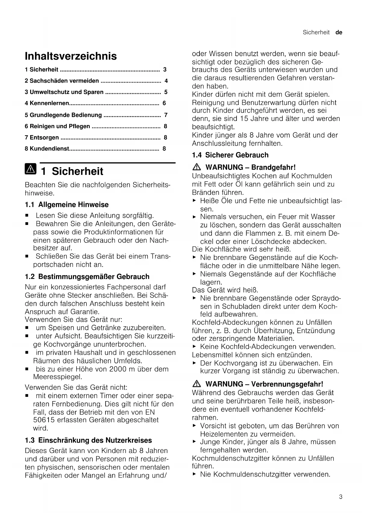 - 8 Kundendienst 1 Sicherheit Beachten Sie die nachfolgenden Sicherheits- hinweise. 1.1 Allgemeine Hinweise ¡ Lesen Sie diese Anleitung sorgfältig. ¡ Bewahren Sie die Anleitungen, den Geräte- pass sowie die Produktinformationen für einen späteren Gebrauch oder den Nach- besitzer auf. ¡ Schließen Sie das Gerät bei einem Trans- portschaden nicht an. 1.2 Bestimmungsgemäßer Gebrauch Nur ein konzessioniertes Fachpersonal darf Geräte ohne Stecker anschließen. Bei Schä- den durch falschen Anschluss besteht kein Anspruch auf Garantie. Verwenden Sie das Gerät nur: ¡ um Speisen und Getränke zuzubereiten. ¡ unter Aufsicht. Beaufsichtigen Sie kurzzeiti- ge Kochvorgänge ununterbrochen. ¡ im privaten Haushalt und in geschlossenen Räumen des häuslichen Umfelds. ¡ bis zu einer Höhe von 2000m über dem Meeresspiegel. Verwenden Sie das Gerät nicht: ¡ mit einem externen Timer oder einer sepa- raten Fernbedienung. Dies gilt nicht für den Fall, dass der Betrieb mit den von EN 50615 erfassten Geräten abgeschaltet wird. 1.3 Einschränkung des Nutzerkreises Dieses Gerät kann von Kindern ab 8 Jahren und darüber und von Personen mit reduzier- ten physischen, sensorischen oder mentalen Fähigkeiten oder Mangel an Erfahrung und/ oder Wissen benutzt werden, wenn sie beauf- sichtigt oder bezüglich des sicheren Ge- brauchs des Geräts unterwiesen wurden und die daraus resultierenden Gefahren verstan- den haben. Kinder dürfen nicht mit dem Gerät spielen. Reinigung und Benutzerwartung dürfen nicht durch Kinder durchgeführt werden, es sei denn, sie sind 15 Jahre und älter und werden beaufsichtigt. Kinder jünger als 8 Jahre vom Gerät und der Anschlussleitung fernhalten. 1.4 Sicherer Gebrauch WARNUNG‒Brandgefahr! Unbeaufsichtigtes Kochen auf Kochmulden mit Fett oder Öl kann gefährlich sein und zu Bränden führen. p. 8