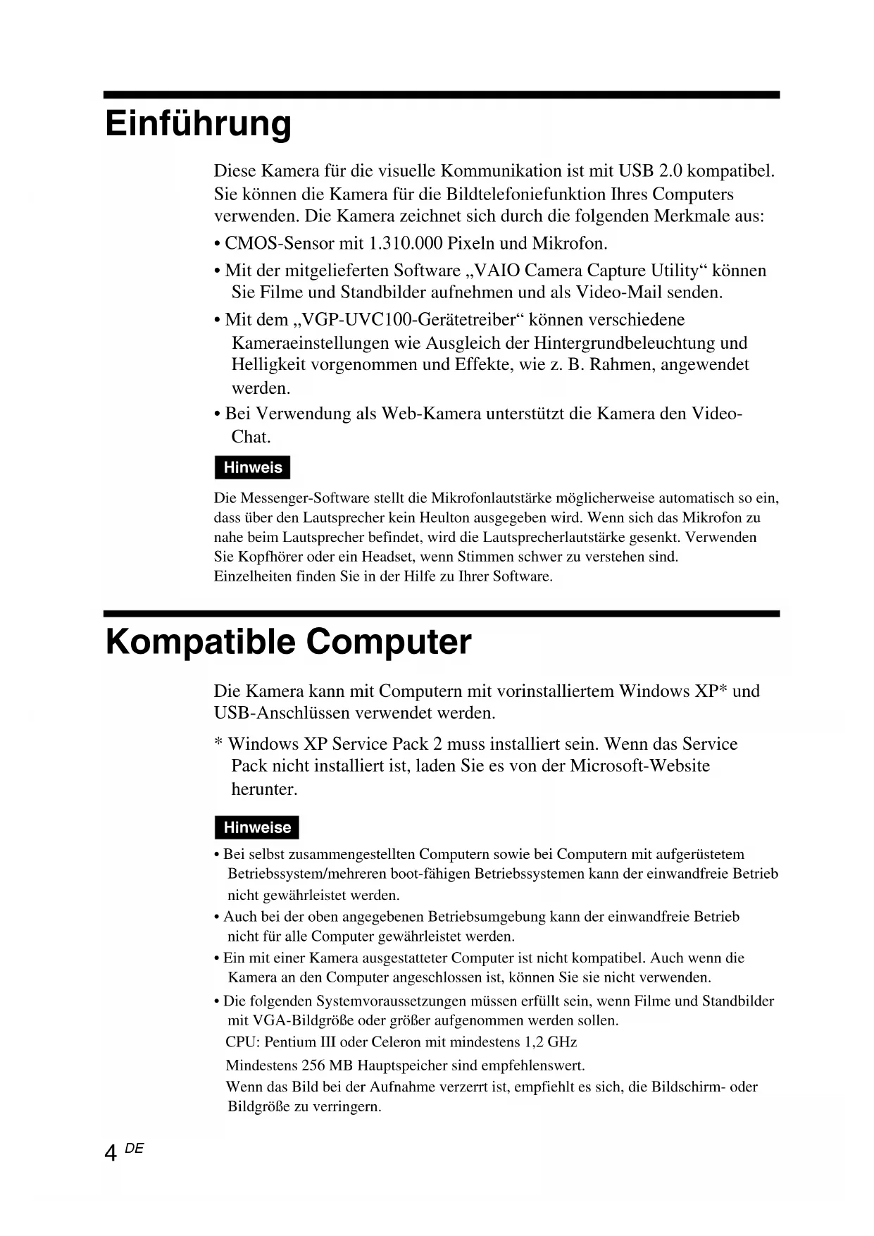 - Bei Verwendung als Web-Kamera unterstützt die Kamera den Video- Chat. Hinweis Die Messenger-Software stellt die Mikrofonlautstärke möglicherweise automatisch so ein, dass über den Lautsprecher kein Heulton ausgegeben wird. Wenn sich das Mikrofon zu nahe beim Lautsprecher befindet, wird die Lautsprecherlautstärke gesenkt. Verwenden Sie Kopfhörer oder ein Headset, wenn Stimmen schwer zu verstehen sind. Einzelheiten finden Sie in der Hilfe zu Ihrer Software. Kompatible Computer Die Kamera kann mit Computern mit vorinstalliertem Windows XP* und USB-Anschlüssen verwendet werden.