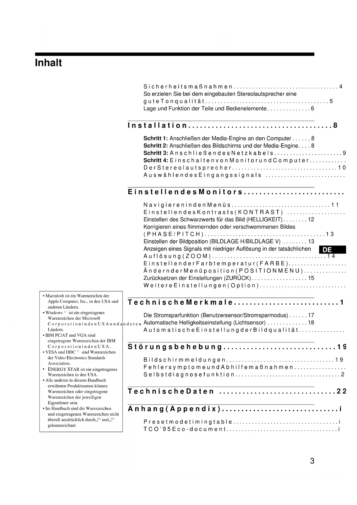 - Die vertikale Austastbreite sollte über 450 µSek. liegen. Änderungen, die dem technischen Fortschritt dienen, bleiben vorbehalten. Netzanzeige1 amBildschirms 03DE02BAS-UC.book Page 22 Friday, August 17, 2001 10:49 AM3 Índice
