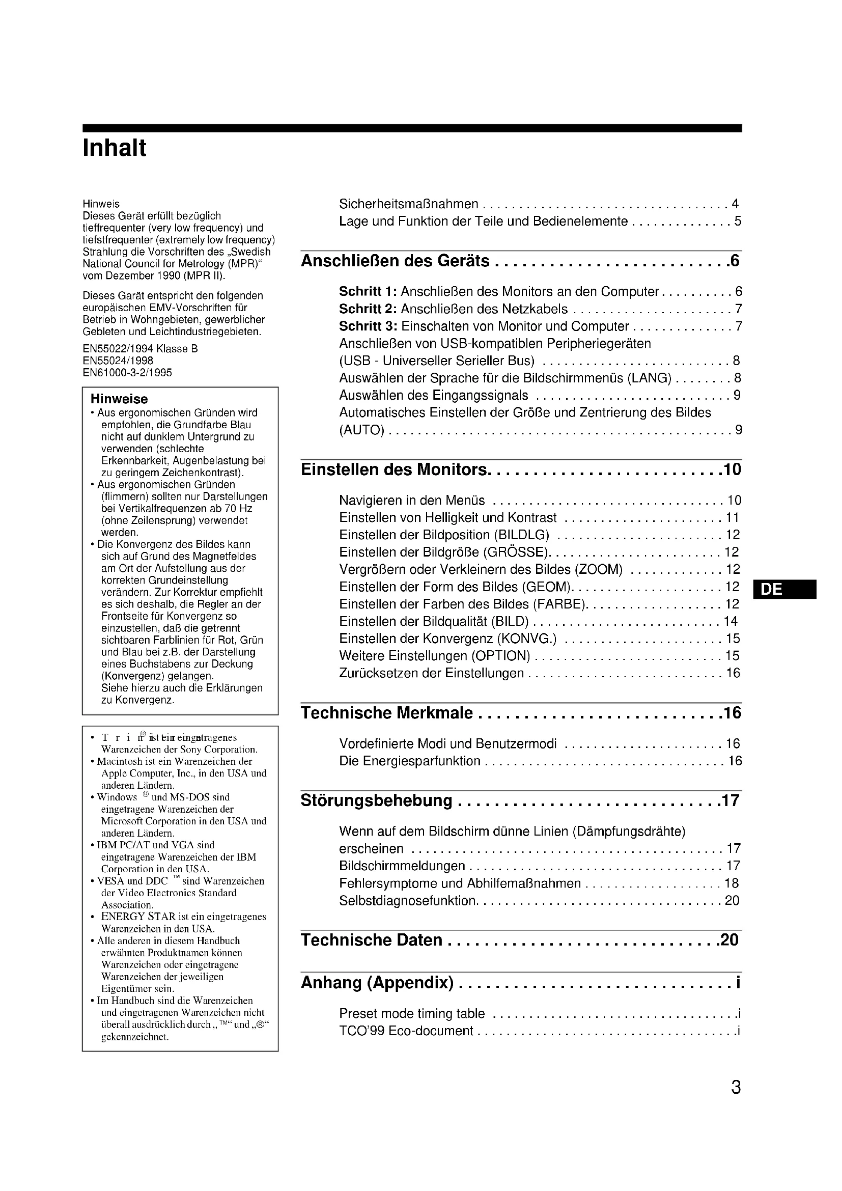 - Aus ergonomischen Gründen wird empfohlen, die Grundfarbe Blau nicht auf dunklem Untergrund zu verwenden (schlechte Erkennbarkeit, Augenbelastung bei zu geringem Zeichenkontrast).• Aus ergonomischen Gründen (flimmern) sollten nur Darstellungen bei Vertikalfrequenzen ab 70 Hz (ohne Zeilensprung) verwendet werden.• Die Konvergenz des Bildes kann sich auf Grund des Magnetfeldes am Ort der Aufstellung aus der korrekten Grundeinstellung verändern. Zur Korrektur empfiehlt es sich deshalb, die Regler an der Frontseite für Konvergenz so einzustellen, daß die getrennt sichtbaren Farblinien für Rot, Grün und Blau bei z.B. der Darstellung eines Buchstabens zur Deckung (Konvergenz) gelangen.Siehe hierzu auch die Erklärungen zu Konvergenz.•Trinitron ist ein eingetragenes Warenzeichen der Sony Corporation.• Macintosh ist ein Warenzeichen der Apple Computer, Inc., in den USA und anderen Ländern.• Windows und MS-DOS sind eingetragene Warenzeichen der Microsoft Corporation in den USA und anderen Ländern.• IBM PC/AT und VGA sind eingetragene Warenzeichen der IBM Corporation in den USA.• VESA und DDC sind Warenzeichen der Video Electronics Standard Association. ENERGY STAR ist ein eingetragenes Warenzeichen in den USA.• Alle anderen in diesem Handbuch erwähnten Produktnamen können Warenzeichen oder eingetragene Warenzeichen der jeweiligen Eigentümer sein.• Im Handbuch sind die Warenzeichen und eingetragenen Warenzeichen nicht überall ausdrücklich durch „ä“ und „â“ gekennzeichnet. Sicherheitsmaßnahmen . . . . . . . . . . . . . . . . . . . . . . . . . . . . . . . . . . 4 Lage und Funktion der Teile und Bedienelemente . . . . . . . . . . . . . . 5 Anschließen des Geräts . . . . . . . . . . . . . . . . . . . . . . . . . .6 Schritt 1: Anschließen des Monitors an den Computer . . . . . . . . . . 6 Schritt 2: Anschließen des Netzkabels . . . . . . . . . . . . . . . . . . . . . . 7 Schritt 3: Einschalten von Monitor und Computer . . . . . . . . . . . . . . 7 Anschließen von USB-kompatiblen Peripheriegeräten (USB - Universeller Serieller Bus) . . . . . . . . . . . . . . . . . . . . . . . . . . 8 Auswählen der Sprache für die Bildschirmmenüs (LANG) . . . . . . . . 8 Auswählen des Eingangssignals . . . . . . . . . . . . . . . . . . . . . . . . . . . 9 Automatisches Einstellen der Größe und Zentrierung des Bildes (AUTO) . . . . . . . . . . . . . . . . . . . . . . . . . . . . . . . . . . . . . . . . . . . . . . . 9 Einstellen des Monitors. . . . . . . . . . . . . . . . . . . . . . . . . .10 Navigieren in den Menüs . . . . . . . . . . . . . . . . . . . . . . . . . . . . . . . . 10 Einstellen von Helligkeit und Kontrast . . . . . . . . . . . . . . . . . . . . . . 11 Einstellen der Bildposition (BILDLG) . . . . . . . . . . . . . . . . . . . . . . . 12 Einstellen der Bildgröße (GRÖSSE). . . . . . . . . . . . . . . . . . . . . . . . 12 Vergrößern oder Verkleinern des Bildes (ZOOM) . . . . . . . . . . . . . 12 Einstellen der Form des Bildes (GEOM). . . . . . . . . . . . . . . . . . . . . 12 Einstellen der Farben des Bildes (FARBE). . . . . . . . . . . . . . . . . . . 12 Einstellen der Bildqualität (BILD) . . . . . . . . . . . . . . . . . . . . . . . . . . 14 Einstellen der Konvergenz (KONVG.) . . . . . . . . . . . . . . . . . . . . . . 15 Weitere Einstellungen (OPTION) . . . . . . . . . . . . . . . . . . . . . . . . . . 15 Zurücksetzen der Einstellungen . . . . . . . . . . . . . . . . . . . . . . . . . . . 16 Technische Merkmale . . . . . . . . . . . . . . . . . . . . . . . . . . .16 Vordefinierte Modi und Benutzermodi . . . . . . . . . . . . . . . . . . . . . . 16 Die Energiesparfunktion . . . . . . . . . . . . . . . . . . . . . . . . . . . . . . . . . 16 Störungsbehebung . . . . . . . . . . . . . . . . . . . . . . . . . . . . .17 Wenn auf dem Bildschirm dünne Linien (Dämpfungsdrähte) erscheinen . . . . . . . . . . . . . . . . . . . . . . . . . . . . . . . . . . . . . . . . . . . 17 Bildschirmmeldungen . . . . . . . . . . . . . . . . . . . . . . . . . . . . . . . . . . . 17 Fehlersymptome und Abhilfemaßnahmen . . . . . . . . . . . . . . . . . . . 18 Selbstdiagnosefunktion. . . . . . . . . . . . . . . . . . . . . . . . . . . . . . . . . . 20 Technische Daten . . . . . . . . . . . . . . . . . . . . . . . . . . . . . .20 Anhang (Appendix) . . . . . . . . . . . . . . . . . . . . . . . . . . . . . . i Preset mode timing table . . . . . . . . . . . . . . . . . . . . . . . . . . . . . . . . . .i TCO’99 Eco-document . . . . . . . . . . . . . . . . . . . . . . . . . . . . . . . . . . . .i4 Sicherheitsmaßnahmen Warnhinweis zum Netzanschluß