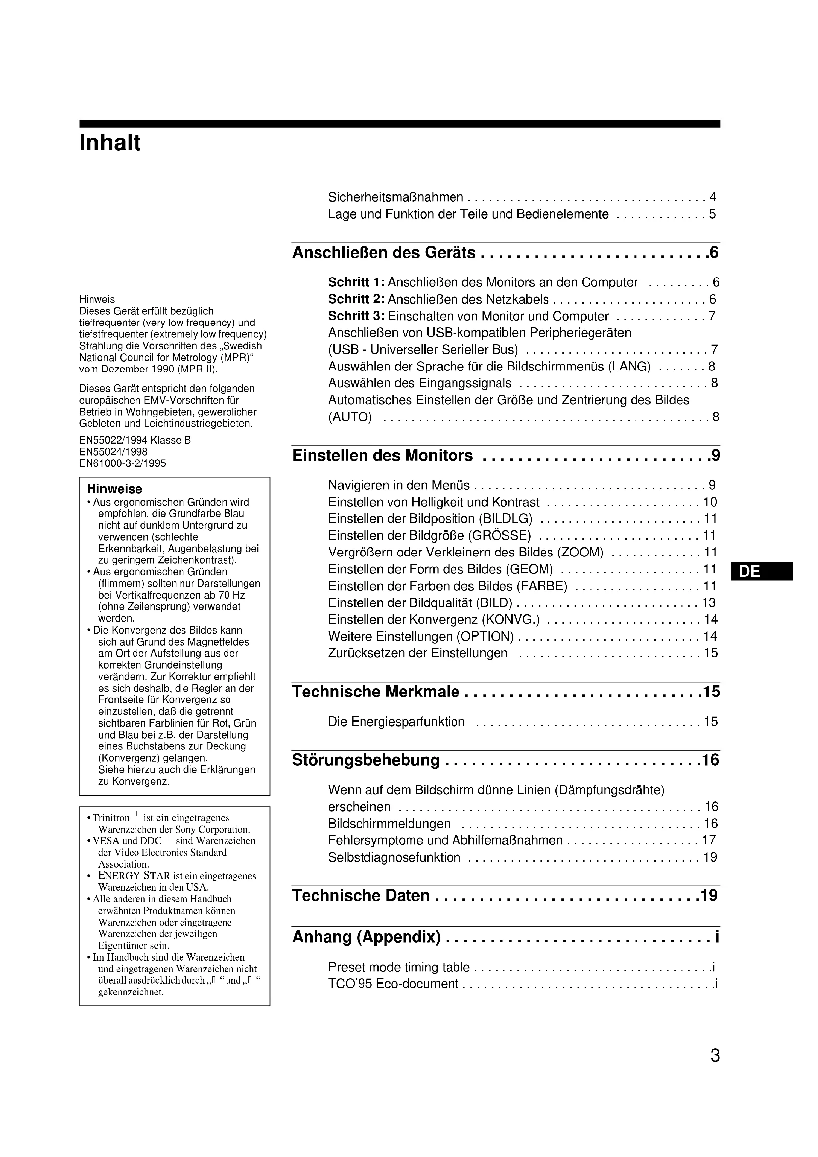 gekennzeichnet. Sicherheitsmaßnahmen . . . . . . . . . . . . . . . . . . . . . . . . . . . . . . . . . . 4 Lage und Funktion der Teile und Bedienelemente . . . . . . . . . . . . . 5 Anschließen des Geräts . . . . . . . . . . . . . . . . . . . . . . . . . .6 Schritt 1: Anschließen des Monitors an den Computer . . . . . . . . . 6 Schritt 2: Anschließen des Netzkabels . . . . . . . . . . . . . . . . . . . . . . 6 Schritt 3: Einschalten von Monitor und Computer . . . . . . . . . . . . . 7 Anschließen von USB-kompatiblen Peripheriegeräten (USB - Universeller Serieller Bus) . . . . . . . . . . . . . . . . . . . . . . . . . . 7 Auswählen der Sprache für die Bildschirmmenüs (LANG) . . . . . . . 8 Auswählen des Eingangssignals . . . . . . . . . . . . . . . . . . . . . . . . . . . 8 Automatisches Einstellen der Größe und Zentrierung des Bildes (AUTO) . . . . . . . . . . . . . . . . . . . . . . . . . . . . . . . . . . . . . . . . . . . . . . 8 Einstellen des Monitors . . . . . . . . . . . . . . . . . . . . . . . . . .9 Navigieren in den Menüs . . . . . . . . . . . . . . . . . . . . . . . . . . . . . . . . . 9 Einstellen von Helligkeit und Kontrast . . . . . . . . . . . . . . . . . . . . . . 10 Einstellen der Bildposition (BILDLG) . . . . . . . . . . . . . . . . . . . . . . . 11 Einstellen der Bildgröße (GRÖSSE) . . . . . . . . . . . . . . . . . . . . . . . 11 Vergrößern oder Verkleinern des Bildes (ZOOM) . . . . . . . . . . . . . 11 Einstellen der Form des Bildes (GEOM) . . . . . . . . . . . . . . . . . . . . 11 Einstellen der Farben des Bildes (FARBE) . . . . . . . . . . . . . . . . . . 11 Einstellen der Bildqualität (BILD) . . . . . . . . . . . . . . . . . . . . . . . . . . 13 Einstellen der Konvergenz (KONVG.) . . . . . . . . . . . . . . . . . . . . . . 14 Weitere Einstellungen (OPTION) . . . . . . . . . . . . . . . . . . . . . . . . . . 14 Zurücksetzen der Einstellungen . . . . . . . . . . . . . . . . . . . . . . . . . . 15 Technische Merkmale . . . . . . . . . . . . . . . . . . . . . . . . . . .15 Die Energiesparfunktion . . . . . . . . . . . . . . . . . . . . . . . . . . . . . . . . 15 Störungsbehebung . . . . . . . . . . . . . . . . . . . . . . . . . . . . .16 Wenn auf dem Bildschirm dünne Linien (Dämpfungsdrähte) erscheinen . . . . . . . . . . . . . . . . . . . . . . . . . . . . . . . . . . . . . . . . . . . 16 Bildschirmmeldungen . . . . . . . . . . . . . . . . . . . . . . . . . . . . . . . . . . 16 Fehlersymptome und Abhilfemaßnahmen . . . . . . . . . . . . . . . . . . . 17 Selbstdiagnosefunktion . . . . . . . . . . . . . . . . . . . . . . . . . . . . . . . . . 19 Technische Daten . . . . . . . . . . . . . . . . . . . . . . . . . . . . . .19 Anhang (Appendix) . . . . . . . . . . . . . . . . . . . . . . . . . . . . . . i Preset mode timing table . . . . . . . . . . . . . . . . . . . . . . . . . . . . . . . . . .i TCO’95 Eco-document . . . . . . . . . . . . . . . . . . . . . . . . . . . . . . . . . . . .i4 Sicherheitsmaßnahmen Warnhinweis zum Netzanschluß Verwenden Sie das für die Stromversorgung in Ihrem Land geeignete Netzkabel.