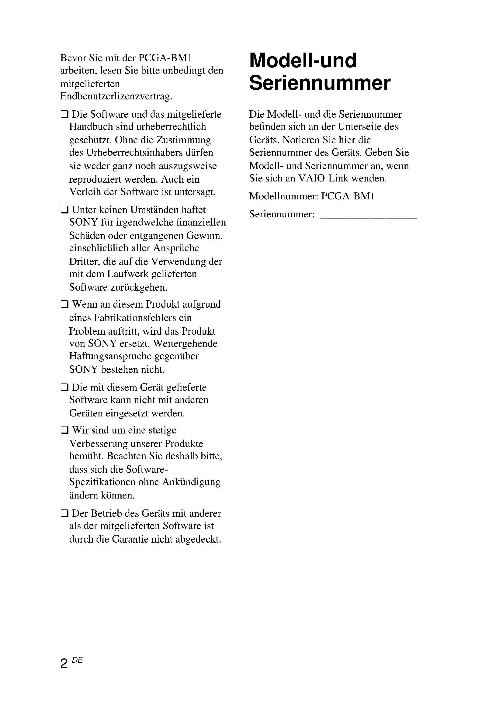 Bevor Sie mit der PCGA-BM1 arbeiten, lesen Sie bitte unbedingt den mitgelieferten Endbenutzerlizenzvertrag. ❑ Die Software und das mitgelieferte Handbuch sind urheberrechtlich geschützt. Ohne die Zustimmung des Urheberrechtsinhabers dürfen sie weder ganz noch auszugsweise reproduziert werden. Auch ein Verleih der Software ist untersagt. ❑ Unter keinen Umständen haftet SONY für irgendwelche finanziellen Schäden oder entgangenen Gewinn, einschließlich aller Ansprüche Dritter, die auf die Verwendung der mit dem Laufwerk gelieferten Software zurückgehen. ❑ Wenn an diesem Produkt aufgrund eines Fabrikationsfehlers ein Problem auftritt, wird das Produkt von SONY ersetzt. Weitergehende Haftungsansprüche gegenüber SONY bestehen nicht. ❑ Die mit diesem Gerät gelieferte Software kann nicht mit anderen Geräten eingesetzt werden. ❑ Wir sind um eine stetige Verbesserung unserer Produkte bemüht. Beachten Sie deshalb bitte, dass sich die Software- Spezifikationen ohne Ankündigung ändern können. ❑ Der Betrieb des Geräts mit anderer als der mitgelieferten Software ist durch die Garantie nicht abgedeckt. Modell-und Seriennummer Die Modell- und die Seriennummer befinden sich an der Unterseite des Geräts. Notieren Sie hier die Seriennummer des Geräts. Geben Sie Modell- und Seriennummer an, wenn Sie sich an VAIO-Link wenden. Modellnummer: PCGA-BM1 Seriennummer: __________________3
