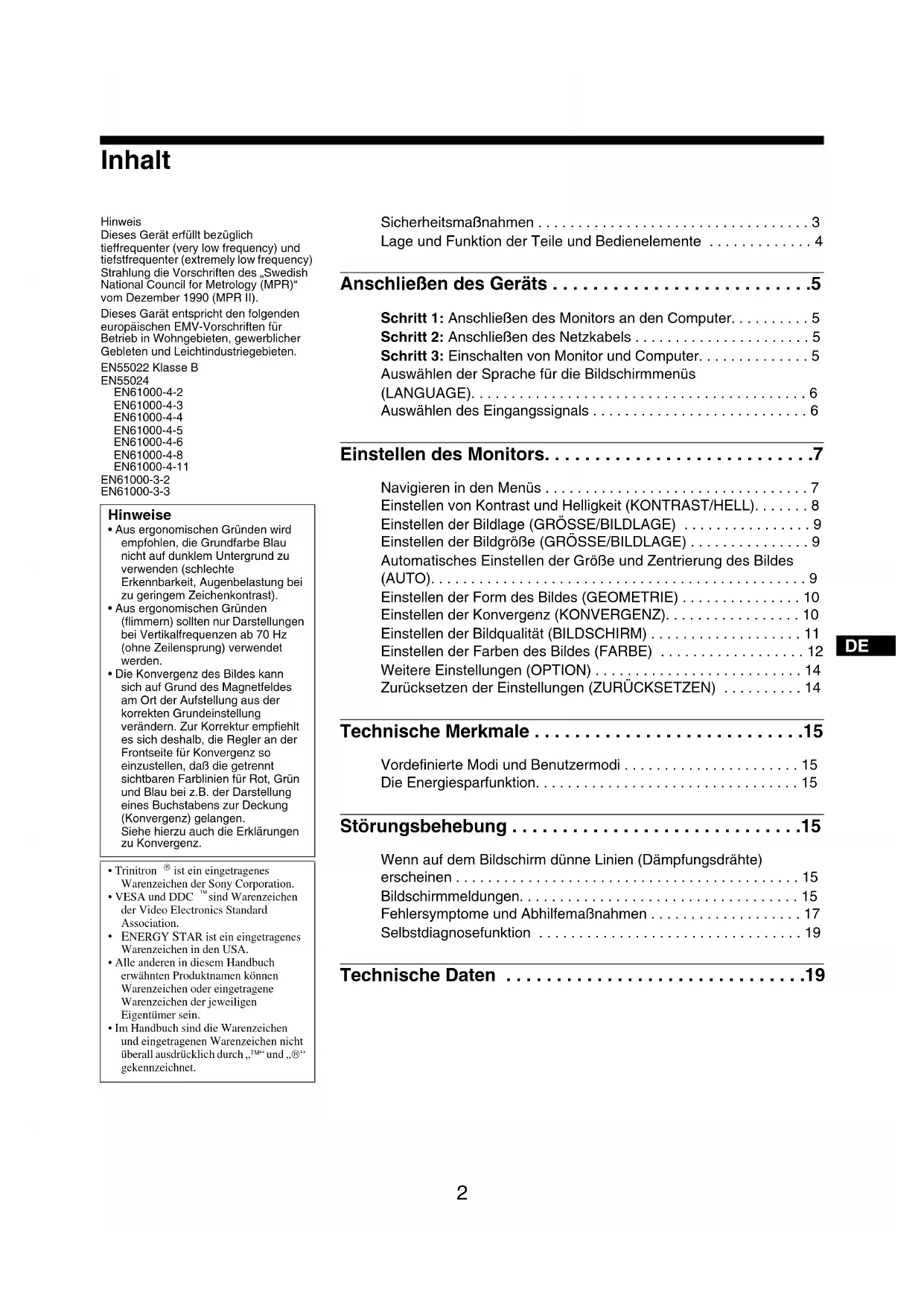 - Aus ergonomischen Gründen wird empfohlen, die Grundfarbe Blau nicht auf dunklem Untergrund zu verwenden (schlechte Erkennbarkeit, Augenbelastung bei zu geringem Zeichenkontrast).• Aus ergonomischen Gründen (flimmern) sollten nur Darstellungen bei Vertikalfrequenzen ab 70 Hz (ohne Zeilensprung) verwendet werden.• Die Konvergenz des Bildes kann sich auf Grund des Magnetfeldes am Ort der Aufstellung aus der korrekten Grundeinstellung verändern. Zur Korrektur empfiehlt es sich deshalb, die Regler an der Frontseite für Konvergenz so einzustellen, daß die getrennt sichtbaren Farblinien für Rot, Grün und Blau bei z.B. der Darstellung eines Buchstabens zur Deckung (Konvergenz) gelangen.Siehe hierzu auch die Erklärungen zu Konvergenz.• Trinitron ist ein eingetragenes Warenzeichen der Sony Corporation.• VESA und DDC sind Warenzeichen der Video Electronics Standard Association. ENERGY STAR ist ein eingetragenes Warenzeichen in den USA.• Alle anderen in diesem Handbuch erwähnten Produktnamen können Warenzeichen oder eingetragene Warenzeichen der jeweiligen Eigentümer sein.• Im Handbuch sind die Warenzeichen und eingetragenen Warenzeichen nicht überall ausdrücklich durch „“ und „“ gekennzeichnet.