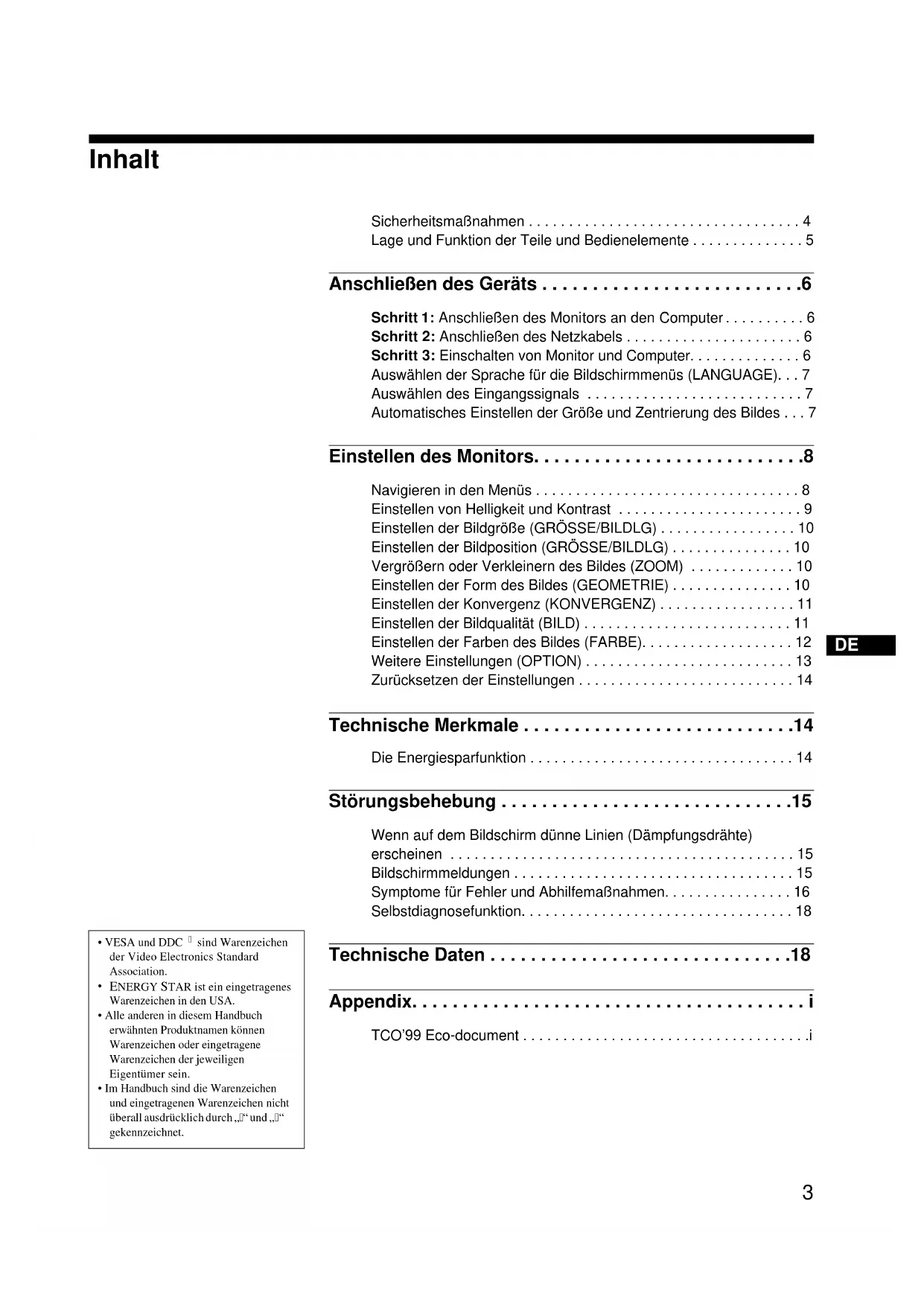 - VESA und DDC sind Warenzeichen der Video Electronics Standard Association. ENERGY STAR ist ein eingetragenes Warenzeichen in den USA.• Alle anderen in diesem Handbuch erwähnten Produktnamen können Warenzeichen oder eingetragene Warenzeichen der jeweiligen Eigentümer sein.• Im Handbuch sind die Warenzeichen und eingetragenen Warenzeichen nicht überall ausdrücklich durch „“ und „“ gekennzeichnet. Sicherheitsmaßnahmen . . . . . . . . . . . . . . . . . . . . . . . . . . . . . . . . . . 4 Lage und Funktion der Teile und Bedienelemente . . . . . . . . . . . . . . 5 Anschließen des Geräts . . . . . . . . . . . . . . . . . . . . . . . . . .6 Schritt 1: Anschließen des Monitors an den Computer . . . . . . . . . . 6 Schritt 2: Anschließen des Netzkabels . . . . . . . . . . . . . . . . . . . . . . 6 Schritt 3: Einschalten von Monitor und Computer. . . . . . . . . . . . . . 6 Auswählen der Sprache für die Bildschirmmenüs (LANGUAGE). . . 7 Auswählen des Eingangssignals . . . . . . . . . . . . . . . . . . . . . . . . . . . 7 Automatisches Einstellen der Größe und Zentrierung des Bildes . . . 7 Einstellen des Monitors. . . . . . . . . . . . . . . . . . . . . . . . . . .8 Navigieren in den Menüs . . . . . . . . . . . . . . . . . . . . . . . . . . . . . . . . . 8 Einstellen von Helligkeit und Kontrast . . . . . . . . . . . . . . . . . . . . . . . 9 Einstellen der Bildgröße (GRÖSSE/BILDLG) . . . . . . . . . . . . . . . . . 10 Einstellen der Bildposition (GRÖSSE/BILDLG) . . . . . . . . . . . . . . . 10 Vergrößern oder Verkleinern des Bildes (ZOOM) . . . . . . . . . . . . . 10 Einstellen der Form des Bildes (GEOMETRIE) . . . . . . . . . . . . . . . 10 Einstellen der Konvergenz (KONVERGENZ) . . . . . . . . . . . . . . . . . 11 Einstellen der Bildqualität (BILD) . . . . . . . . . . . . . . . . . . . . . . . . . . 11 Einstellen der Farben des Bildes (FARBE). . . . . . . . . . . . . . . . . . . 12 Weitere Einstellungen (OPTION) . . . . . . . . . . . . . . . . . . . . . . . . . . 13 Zurücksetzen der Einstellungen . . . . . . . . . . . . . . . . . . . . . . . . . . . 14 Technische Merkmale . . . . . . . . . . . . . . . . . . . . . . . . . . .14 Die Energiesparfunktion . . . . . . . . . . . . . . . . . . . . . . . . . . . . . . . . . 14 Störungsbehebung . . . . . . . . . . . . . . . . . . . . . . . . . . . . .15 Wenn auf dem Bildschirm dünne Linien (Dämpfungsdrähte) erscheinen . . . . . . . . . . . . . . . . . . . . . . . . . . . . . . . . . . . . . . . . . . . 15 Bildschirmmeldungen . . . . . . . . . . . . . . . . . . . . . . . . . . . . . . . . . . . 15 Symptome für Fehler und Abhilfemaßnahmen. . . . . . . . . . . . . . . . 16 Selbstdiagnosefunktion. . . . . . . . . . . . . . . . . . . . . . . . . . . . . . . . . . 18 Technische Daten . . . . . . . . . . . . . . . . . . . . . . . . . . . . . .18 Appendix. . . . . . . . . . . . . . . . . . . . . . . . . . . . . . . . . . . . . . . i TCO’99 Eco-document . . . . . . . . . . . . . . . . . . . . . . . . . . . . . . . . . . . .i4 Sicherheitsmaßnahmen Warnhinweis zum Netzanschluß Verwenden Sie das für die Stromversorgung in Ihrem Land geeignete Netzkabel.