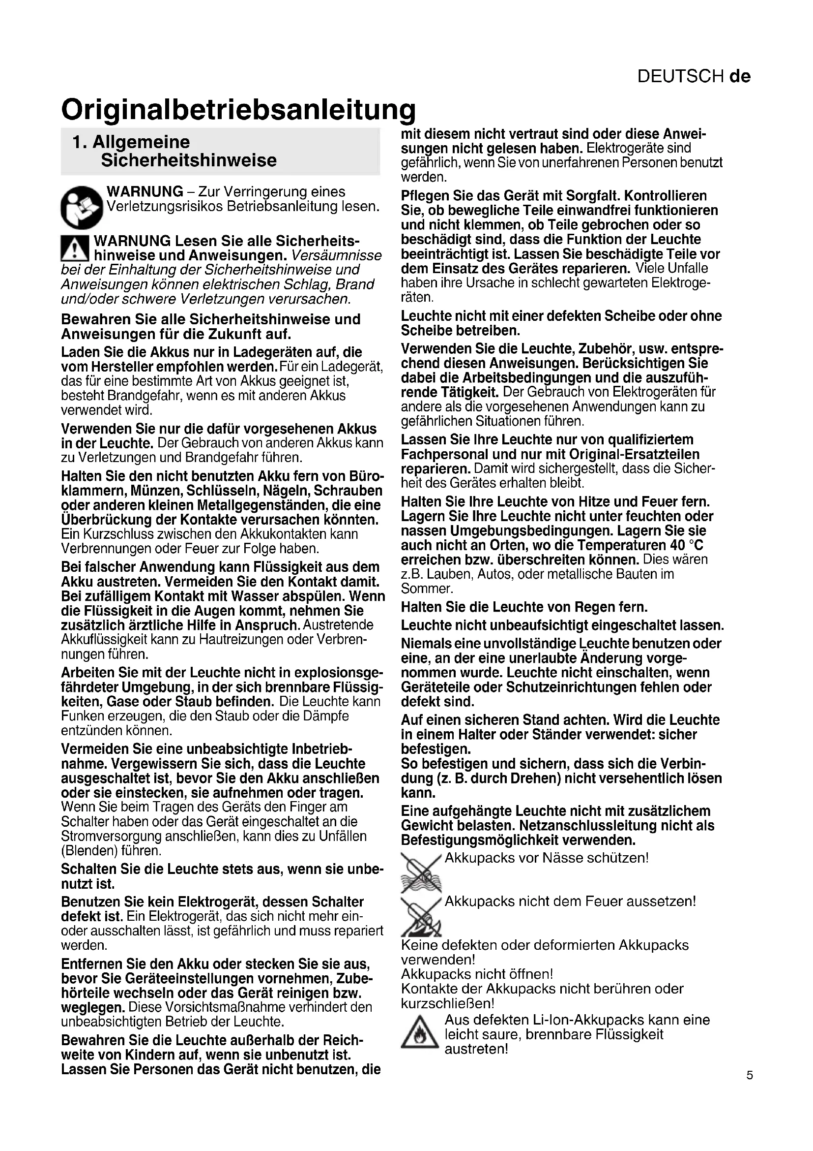 WARNUNG – Zur Verringerung eines Verletzungsrisikos Betriebsanleitung lesen. WARNUNG Lesen Sie alle Sicherheits- hinweise und Anweisungen. Versäumnisse bei der Einhaltung der Sicherheitshinweise und Anweisungen können elektrischen Schlag, Brand und/oder schwere Verletzungen verursachen. Bewahren Sie alle Sicherheitshinweise und Anweisungen für die Zukunft auf. Laden Sie die Akkus nur in Ladegeräten auf, die vom Hersteller empfohlen werden. Für ein Ladegerät, das für eine bestimmte Art von Akkus geeignet ist, besteht Brandgefahr, wenn es mit anderen Akkus verwendet wird. Verwenden Sie nur die dafür vorgesehenen Akkus in der Leuchte. Der Gebrauch von anderen Akkus kann zu Verletzungen und Brandgefahr führen. Halten Sie den nicht benutzten Akku fern von Büro- klammern, Münzen, Schlüsseln, Nägeln, Schrauben oder anderen kleinen Metallgegenständen, die eine Überbrückung der Kontakte verursachen könnten. Ein Kurzschluss zwischen den Akkukontakten kann Verbrennungen oder Feuer zur Folge haben. Bei falscher Anwendung kann Flüssigkeit aus dem Akku austreten. Vermeiden Sie den Kontakt damit. Bei zufälligem Kontakt mit Wasser abspülen. Wenn die Flüssigkeit in die Augen kommt, nehmen Sie zusätzlich ärztliche Hilfe in Anspruch. Austretende Akkuflüssigkeit kann zu Hautreizungen oder Verbren- nungen führen. Arbeiten Sie mit der Leuchte nicht in explosionsge- fährdeter Umgebung, in der sich brennbare Flüssig- keiten, Gase oder Staub befinden. Die Leuchte kann Funken erzeugen, die den Staub oder die Dämpfe entzünden können. Vermeiden Sie eine unbeabsichtigte Inbetrieb- nahme. Vergewissern Sie sich, dass die Leuchte ausgeschaltet ist, bevor Sie den Akku anschließen oder sie einstecken, sie aufnehmen oder tragen. Wenn Sie beim Tragen des Geräts den Finger am Schalter haben oder das Gerät eingeschaltet an die Stromversorgung anschließen, kann dies zu Unfällen (Blenden) führen. Schalten Sie die Leuchte stets aus, wenn sie unbe- nutzt ist. Benutzen Sie kein Elektrogerät, dessen Schalter defekt ist. Ein Elektrogerät, das sich nicht mehr ein- oder ausschalten lässt, ist gefährlich und muss repariert werden. Entfernen Sie den Akku oder stecken Sie sie aus, bevor Sie Geräteeinstellungen vornehmen, Zube- hörteile wechseln oder das Gerät reinigen bzw. weglegen. Diese Vorsichtsmaßnahme verhindert den unbeabsichtigten Betrieb der Leuchte. Bewahren Sie die Leuchte außerhalb der Reich- weite von Kindern auf, wenn sie unbenutzt ist. Lassen Sie Personen das Gerät nicht benutzen, die mit diesem nicht vertraut sind oder diese Anwei- sungen nicht gelesen haben. Elektrogeräte sind gefährlich, wenn Sie von unerfahrenen Personen benutzt werden. Pflegen Sie das Gerät mit Sorgfalt. Kontrollieren Sie, ob bewegliche Teile einwandfrei funktionieren und nicht klemmen, ob Teile gebrochen oder so beschädigt sind, dass die Funktion der Leuchte beeinträchtigt ist. Lassen Sie beschädigte Teile vor dem Einsatz des Gerätes reparieren. Viele Unfalle haben ihre Ursache in schlecht gewarteten Elektroge- räten. Leuchte nicht mit einer defekten Scheibe oder ohne Scheibe betreiben. Verwenden Sie die Leuchte, Zubehör, usw. entspre- chend diesen Anweisungen. Berücksichtigen Sie dabei die Arbeitsbedingungen und die auszufüh- rende Tätigkeit. Der Gebrauch von Elektrogeräten für andere als die vorgesehenen Anwendungen kann zu gefährlichen Situationen führen. Lassen Sie Ihre Leuchte nur von qualifiziertem Fachpersonal und nur mit Original-Ersatzteilen reparieren. Damit wird sichergestellt, dass die Sicher- heit des Gerätes erhalten bleibt. Halten Sie Ihre Leuchte von Hitze und Feuer fern. Lagern Sie Ihre Leuchte nicht unter feuchten oder nassen Umgebungsbedingungen. Lagern Sie sie auch nicht an Orten, wo die Temperaturen 40 °C erreichen bzw. überschreiten können. Dies wären z.B. Lauben, Autos, oder metallische Bauten im Sommer. Halten Sie die Leuchte von Regen fern. Leuchte nicht unbeaufsichtigt eingeschaltet lassen. Niemals eine unvollständige Leuchte benutzen oder eine, an der eine unerlaubte Änderung vorge- nommen wurde. Leuchte nicht einschalten, wenn Geräteteile oder Schutzeinrichtungen fehlen oder defekt sind. Auf einen sicheren Stand achten. Wird die Leuchte in einem Halter oder Ständer verwendet: sicher befestigen. So befestigen und sichern, dass sich die Verbin- dung (z. B. durch Drehen) nicht versehentlich lösen kann. Eine aufgehängte Leuchte nicht mit zusätzlichem Gewicht belasten. Netzanschlussleitung nicht als Befestigungsmöglichkeit verwenden. Akkupacks vor Nässe schützen! Akkupacks nicht dem Feuer aussetzen! Keine defekten oder deformierten Akkupacks verwenden! Akkupacks nicht öffnen! Kontakte der Akkupacks nicht berühren oder kurzschließen! Aus defekten Li-Ion-Akkupacks kann eine leicht saure, brennbare Flüssigkeit austreten! Originalbetriebsanleitung