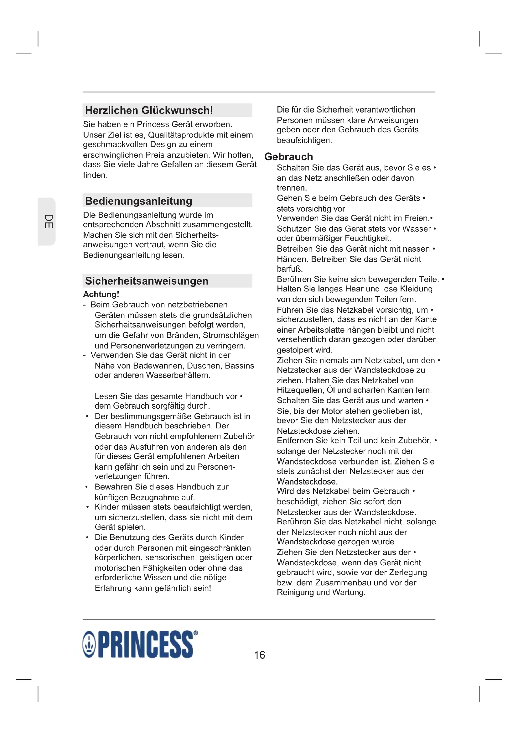 Die für die Sicherheit verantwortlichen Personen müssen klare Anweisungen geben oder den Gebrauch des Geräts beaufsichtigen. Gebrauch Schalten Sie das Gerät aus, bevor Sie es • an das Netz anschließen oder davon trennen. Gehen Sie beim Gebrauch des Geräts • stets vorsichtig vor. Verwenden Sie das Gerät nicht im Freien.• Schützen Sie das Gerät stets vor Wasser • oder übermäßiger Feuchtigkeit. Betreiben Sie das Gerät nicht mit nassen • Händen. Betreiben Sie das Gerät nicht barfuß. Berühren Sie keine sich bewegenden Teile. • Halten Sie langes Haar und lose Kleidung von den sich bewegenden Teilen fern. Führen Sie das Netzkabel vorsichtig, um • sicherzustellen, dass es nicht an der Kante einer Arbeitsplatte hängen bleibt und nicht versehentlich daran gezogen oder darüber gestolpert wird. Ziehen Sie niemals am Netzkabel, um den • Netzstecker aus der Wandsteckdose zu ziehen. Halten Sie das Netzkabel von Hitzequellen, Öl und scharfen Kanten fern. Schalten Sie das Gerät aus und warten • Sie, bis der Motor stehen geblieben ist, bevor Sie den Netzstecker aus der Netzsteckdose ziehen. Entfernen Sie kein Teil und kein Zubehör, • solange der Netzstecker noch mit der Wandsteckdose verbunden ist. Ziehen Sie stets zunächst den Netzstecker aus der Wandsteckdose. Wird das Netzkabel beim Gebrauch • beschädigt, ziehen Sie sofort den Netzstecker aus der Wandsteckdose. Berühren Sie das Netzkabel nicht, solange der Netzstecker noch nicht aus der Wandsteckdose gezogen wurde. Ziehen Sie den Netzstecker aus der • Wandsteckdose, wenn das Gerät nicht gebraucht wird, sowie vor der Zerlegung bzw. dem Zusammenbau und vor der Reinigung und Wartung. Herzlichen Glückwunsch! Sie haben ein Princess Gerät erworben. Unser Ziel ist es, Qualitätsprodukte mit einem geschmackvollen Design zu einem erschwinglichen Preis anzubieten. Wir hoffen, dass Sie viele Jahre Gefallen an diesem Gerät finden. Bedienungsanleitung Die Bedienungsanleitung wurde im entsprechenden Abschnitt zusammengestellt. Machen Sie sich mit den Sicherheits- anweisungen vertraut, wenn Sie die Bedienungsanleitung lesen. Sicherheitsanweisungen Achtung! - Beim Gebrauch von netzbetriebenen Geräten müssen stets die grundsätzlichen Sicherheitsanweisungen befolgt werden, um die Gefahr von Bränden, Stromschlägen und Personenverletzungen zu verringern. - Verwenden Sie das Gerät nicht in der Nähe von Badewannen, Duschen, Bassins oder anderen Wasserbehältern. Lesen Sie das gesamte Handbuch vor • dem Gebrauch sorgfältig durch. Der bestimmungsgemäße Gebrauch ist in • diesem Handbuch beschrieben. Der Gebrauch von nicht empfohlenem Zubehör oder das Ausführen von anderen als den für dieses Gerät empfohlenen Arbeiten kann gefährlich sein und zu Personen- verletzungen führen. Bewahren Sie dieses Handbuch zur • künftigen Bezugnahme auf. Kinder müssen stets beaufsichtigt werden, • um sicherzustellen, dass sie nicht mit dem Gerät spielen. Die Benutzung des Geräts durch Kinder • oder durch Personen mit eingeschränkten körperlichen, sensorischen, geistigen oder motorischen Fähigkeiten oder ohne das erforderliche Wissen und die nötige Erfahrung kann gefährlich sein!1717
