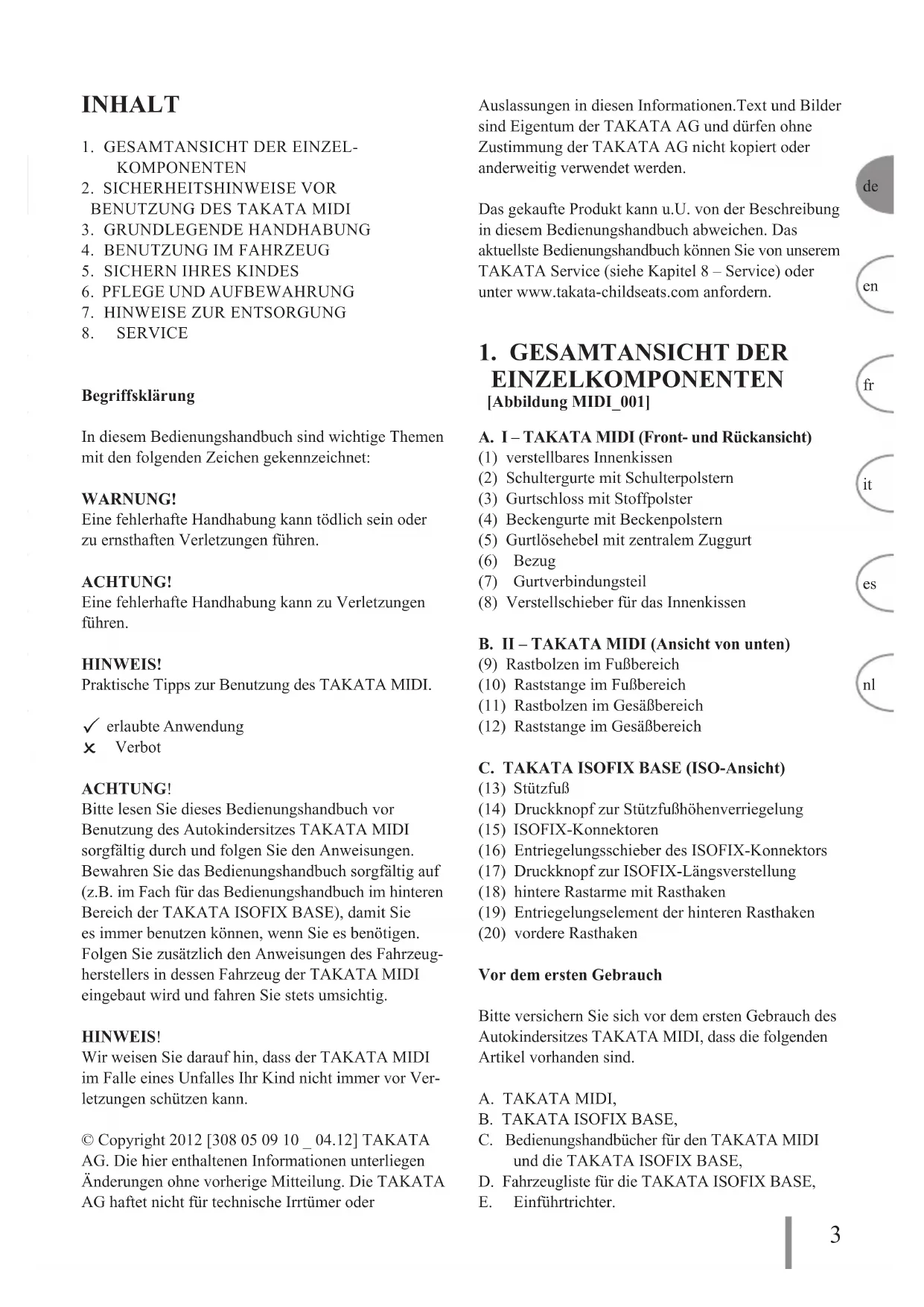 Verbot ACHTUNG! Bitte lesen Sie dieses Bedienungshandbuch vor Benutzung des Autokindersitzes TAKATA MIDI sorgfältig durch und folgen Sie den Anweisungen. Bewahren Sie das Bedienungshandbuch sorgfältig auf (z.B. im Fach für das Bedienungshandbuch im hinteren Bereich der TAKATA ISOFIX BASE), damit Sie es immer benutzen können, wenn Sie es benötigen. Folgen Sie zusätzlich den Anweisungen des Fahrzeug- herstellers in dessen Fahrzeug der TAKATA MIDI eingebaut wird und fahren Sie stets umsichtig. HINWEIS! Wir weisen Sie darauf hin, dass der TAKATA MIDI im Falle eines Unfalles Ihr Kind nicht immer vor Ver- letzungen schützen kann. © Copyright 2012 [308 05 09 10 _ 04.12] TAKATA AG. Die hier enthaltenen Informationen unterliegen Änderungen ohne vorherige Mitteilung. Die TAKATA AG haftet nicht für technische Irrtümer oder Auslassungen in diesen Informationen.Text und Bilder sind Eigentum der TAKATA AG und dürfen ohne Zustimmung der TAKATA AG nicht kopiert oder anderweitig verwendet werden. Das gekaufte Produkt kann u.U. von der Beschreibung in diesem Bedienungshandbuch abweichen. Das aktuellste Bedienungshandbuch können Sie von unserem TAKATA Service (siehe Kapitel 8 – Service) oder unter www.takata-childseats.com anfordern.