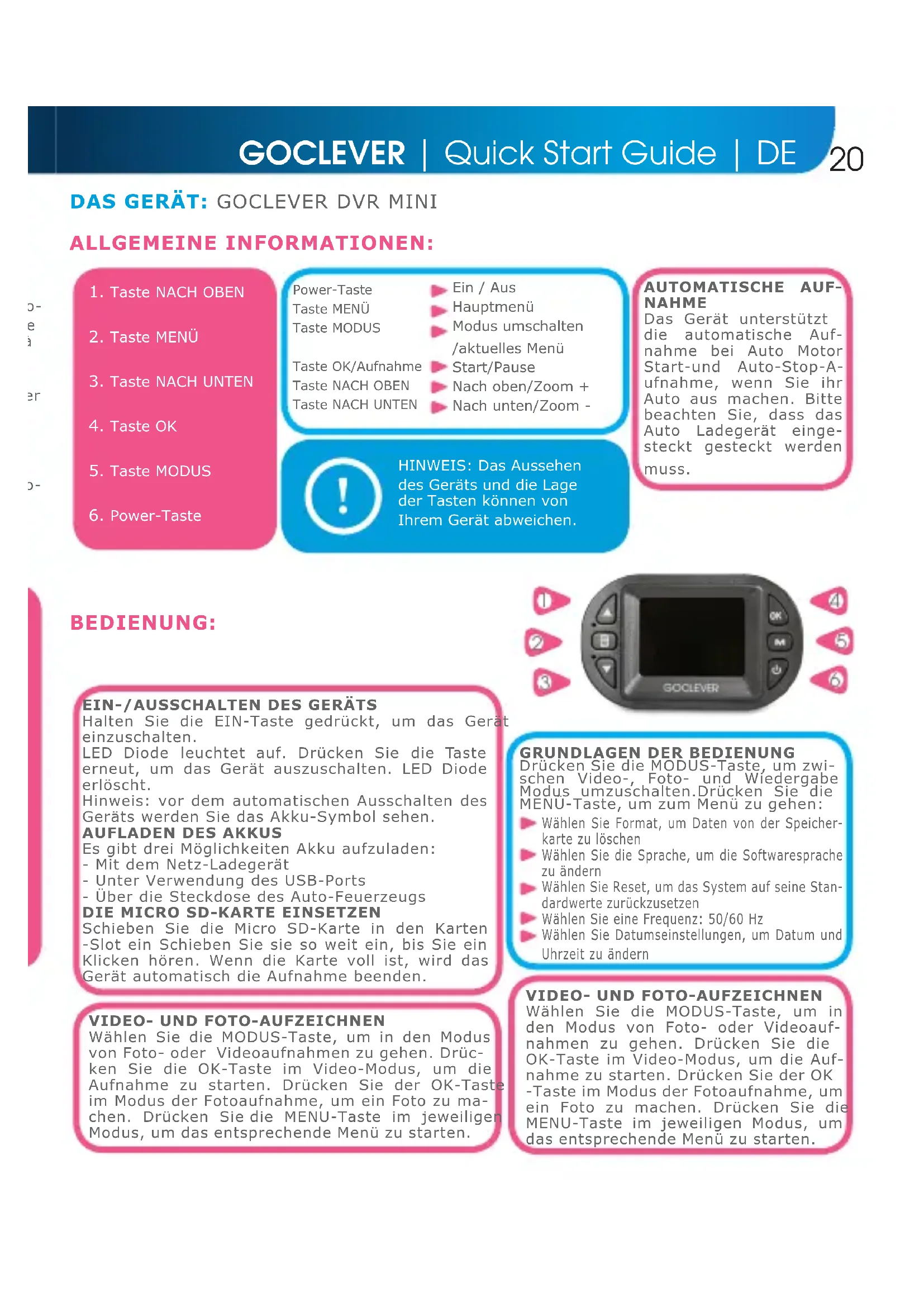 BEDIENUNG: ALLGEMEINE INFORMATIONEN: Power-TasteTaste MENÜTaste MODUSTaste OK/AufnahmeTaste NACH OBENTaste NACH UNTEN Ein / Aus Hauptmenü Modus umschalten /aktuelles Menü Start/Pause Nach oben/Zoom + Nach unten/Zoom -