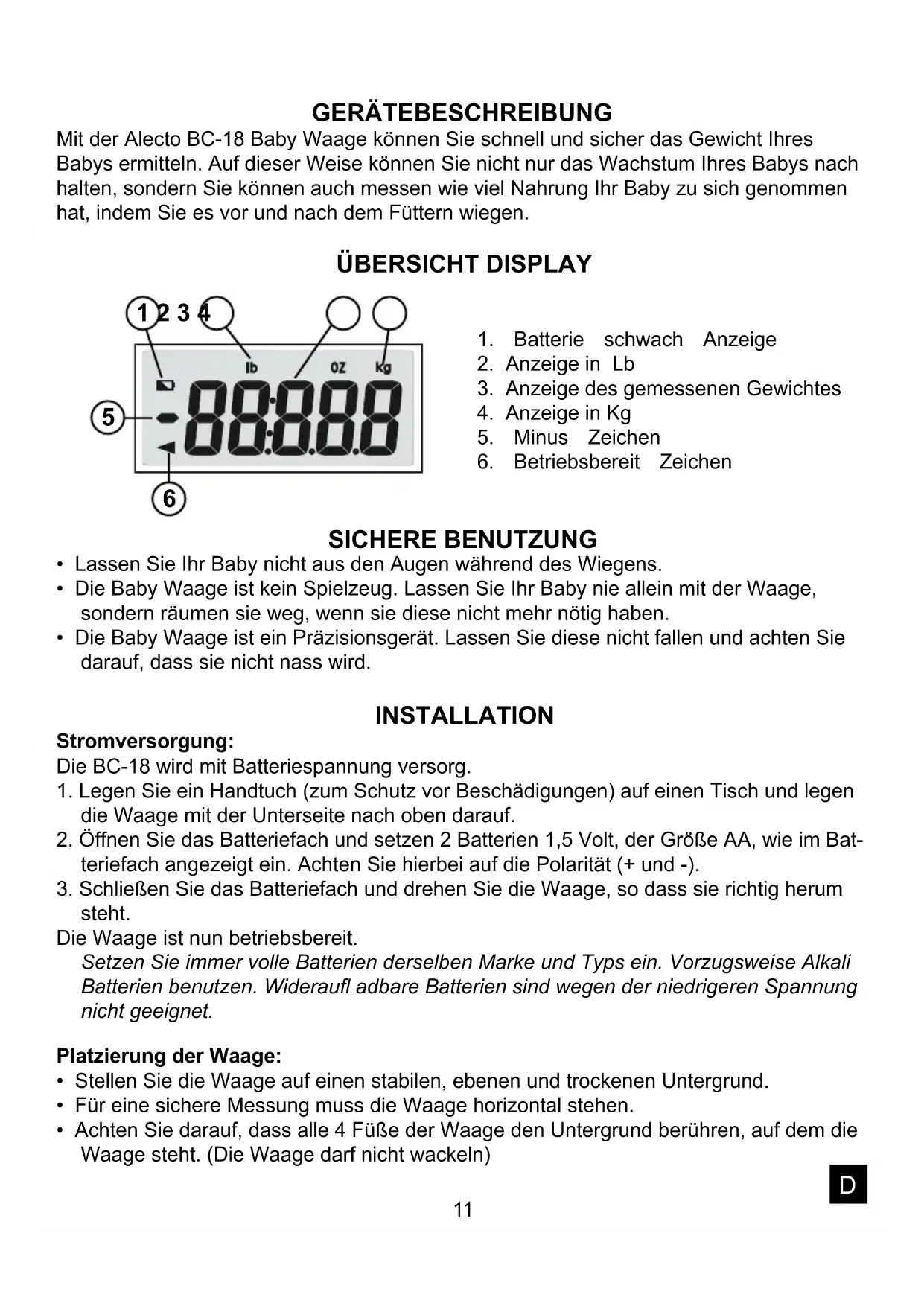 Die Alecto BC-18 entspricht den essentiellen Bedingungen und Maßnahmen, wie sie in der Europäischen Richtlinie 1999/5/EC beschrieben sind. Die Erklärung zur Konformität ist erhältlich auf der Website WWW.ALECTO.INFO . GARANTIE Auf die Alecto BC-18 gewähren Wir eine Garantie von 24 Monate, nach Ankaufsdatum. Wir garantieren in dieser Zeit die kostenlose Reparatur von Schäden die auf Material- und Konstruktionsfehler beruhen. Dies unterliegt der Beurteilung des Importeurs. Wie zu verfahren ist: Bemerken Sie einen Defekt, ziehen Sie erst diese Gebrauchsanleitung zu Rate. Gibt diese keinen Aufschluss, wenden Sie sich bitte an den Lieferanten des Funkgerätes oder an das Alecto Servicecenter (Telefon: +31 (0)73 6411 355). Die Garantie verfällt: Bei unsachgemäßen Gebrauch, falschen Anschluss, ausgelaufene und / oder falsch eingesetzte Batterien, Benutzung von nicht originalen Zubehör, Verwahrlosung und bei Schäden die durch Feuchtigkeit, Feuer, Überschwemmung, Blitzeinschlag und Naturkata- strophen. Bei unbefugten Änderungen und / oder Reparaturen durch Dritte. Bei unsachgemäßen Transport des Gerätes ohne geeigneter Verpackung und wenn dem Gerät nicht dieser Garantienachweiß und die Kaufquittung beigelegt ist. Batterien und die Antenne fallen nicht unter die Garantie. Jegliche weitere Haftung, auch für eventuelle Folgeschäden ist ausgeschlossen. D15 INTRODUCTION The Alecto BC-18 baby scale helps you to quickly and save measure the weight of your baby. You might also use the BC-18 to measure the weight of your baby before and after feeding her, determining how many food the baby has taken. OVERVIEW DISPLAY