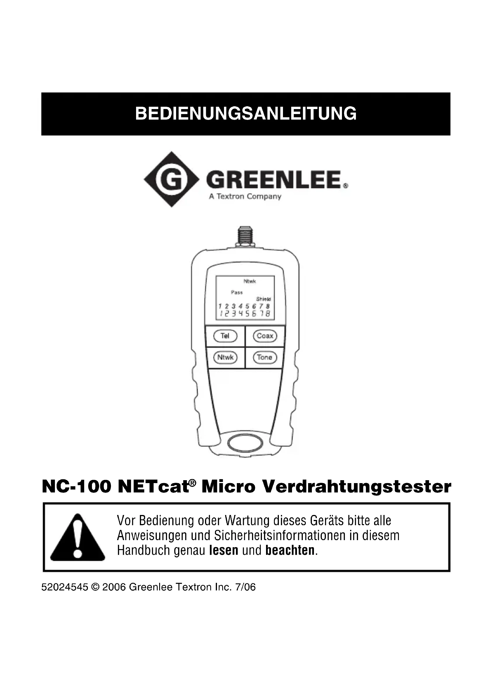 Micro von Greenlee vertraut zu machen. Bitte dieses Handbuch allen Mitarbeitern zugänglich machen. Ersatz-Handbücher sind auf Anfrage kostenlos erhältlich. Alle technischen Daten sind Nennwerte. Bei Designverbesserungen sind Änderungen der Nennwerte vorbehalten. Greenlee Textron Inc. haftet nicht für Schäden, die sich aus der falschen Anwendung oder dem Missbrauch seiner Produkte ergeben. NETcat ist eine eingetragene Marke der Tempo Research Corp.NC-100 NETcat