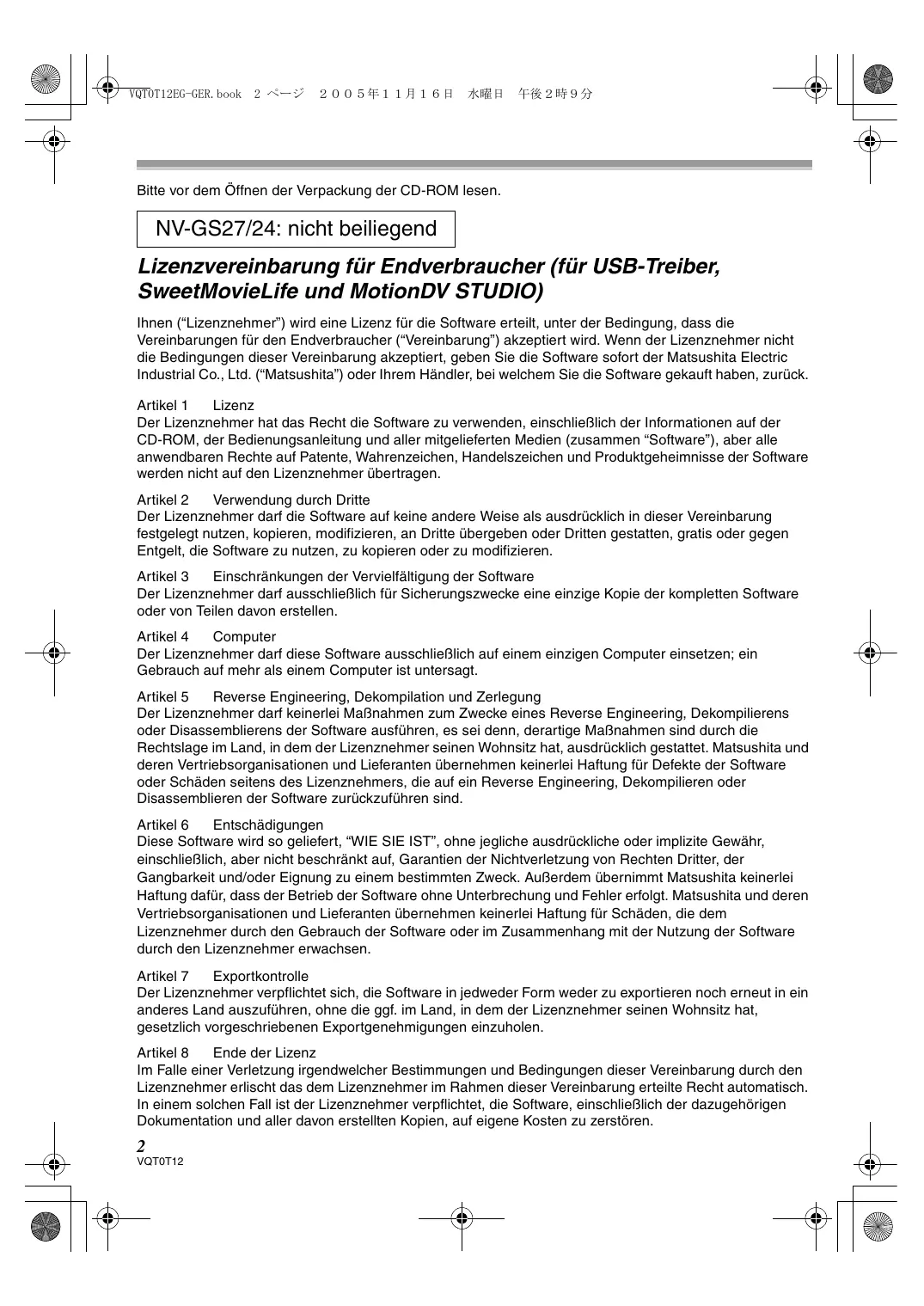 Bitte vor dem Öffnen der Verpackung der CD-ROM lesen. NV-GS27/24: nicht beiliegend Lizenzvereinbarung für Endverbraucher (für USB-Treiber, SweetMovieLife und MotionDV STUDIO) Ihnen (“Lizenznehmer”) wird eine Lizenz für die Software erteilt, unter der Bedingung, dass die Vereinbarungen für den Endverbraucher (“Vereinbarung”) akzeptiert wird. Wenn der Lizenznehmer nicht die Bedingungen dieser Vereinbarung akzeptiert, geben Sie die Software sofort der Matsushita Electric Industrial Co., Ltd. (“Matsushita”) oder Ihrem Händler, bei welchem Sie die Software gekauft haben, zurück. Artikel 1 Lizenz Der Lizenznehmer hat das Recht die Software zu verwenden, einschließlich der Informationen auf der CD-ROM, der Bedienungsanleitung und aller mitgelieferten Medien (zusammen “Software”), aber alle anwendbaren Rechte auf Patente, Wahrenzeichen, Handelszeichen und Produktgeheimnisse der Software werden nicht auf den Lizenznehmer übertragen. Artikel 2 Verwendung durch Dritte Der Lizenznehmer darf die Software auf keine andere Weise als ausdrücklich in dieser Vereinbarung festgelegt nutzen, kopieren, modifizieren, an Dritte übergeben oder Dritten gestatten, gratis oder gegen Entgelt, die Software zu nutzen, zu kopieren oder zu modifizieren. Artikel 3 Einschränkungen der Vervielfältigung der Software Der Lizenznehmer darf ausschließlich für Sicherungszwecke eine einzige Kopie der kompletten Software oder von Teilen davon erstellen. Artikel 4 Computer Der Lizenznehmer darf diese Software ausschließlich auf einem einzigen Computer einsetzen; ein Gebrauch auf mehr als einem Computer ist untersagt. Artikel 5 Reverse Engineering, Dekompilation und Zerlegung Der Lizenznehmer darf keinerlei Maßnahmen zum Zwecke eines Reverse Engineering, Dekompilierens oder Disassemblierens der Software ausführen, es sei denn, derartige Maßnahmen sind durch die Rechtslage im Land, in dem der Lizenznehmer seinen Wohnsitz hat, ausdrücklich gestattet. Matsushita und deren Vertriebsorganisationen und Lieferanten übernehmen keinerlei Haftung für Defekte der Software oder Schäden seitens des Lizenznehmers, die auf ein Reverse Engineering, Dekompilieren oder Disassemblieren der Software zurückzuführen sind. Artikel 6 Entschädigungen Diese Software wird so geliefert, “WIE SIE IST”, ohne jegliche ausdrückliche oder implizite Gewähr, einschließlich, aber nicht beschränkt auf, Garantien der Nichtverletzung von Rechten Dritter, der Gangbarkeit und/oder Eignung zu einem bestimmten Zweck. Außerdem übernimmt Matsushita keinerlei Haftung dafür, dass der Betrieb der Software ohne Unterbrechung und Fehler erfolgt. Matsushita und deren Vertriebsorganisationen und Lieferanten übernehmen keinerlei Haftung für Schäden, die dem Lizenznehmer durch den Gebrauch der Software oder im Zusammenhang mit der Nutzung der Software durch den Lizenznehmer erwachsen. Artikel 7 Exportkontrolle Der Lizenznehmer verpflichtet sich, die Software in jedweder Form weder zu exportieren noch erneut in ein anderes Land auszuführen, ohne die ggf. im Land, in dem der Lizenznehmer seinen Wohnsitz hat, gesetzlich vorgeschriebenen Exportgenehmigungen einzuholen. Artikel 8 Ende der Lizenz Im Falle einer Verletzung irgendwelcher Bestimmungen und Bedingungen dieser Vereinbarung durch den Lizenznehmer erlischt das dem Lizenznehmer im Rahmen dieser Vereinbarung erteilte Recht automatisch. In einem solchen Fall ist der Lizenznehmer verpflichtet, die Software, einschließlich der dazugehörigen Dokumentation und aller davon erstellten Kopien, auf eigene Kosten zu zerstören.