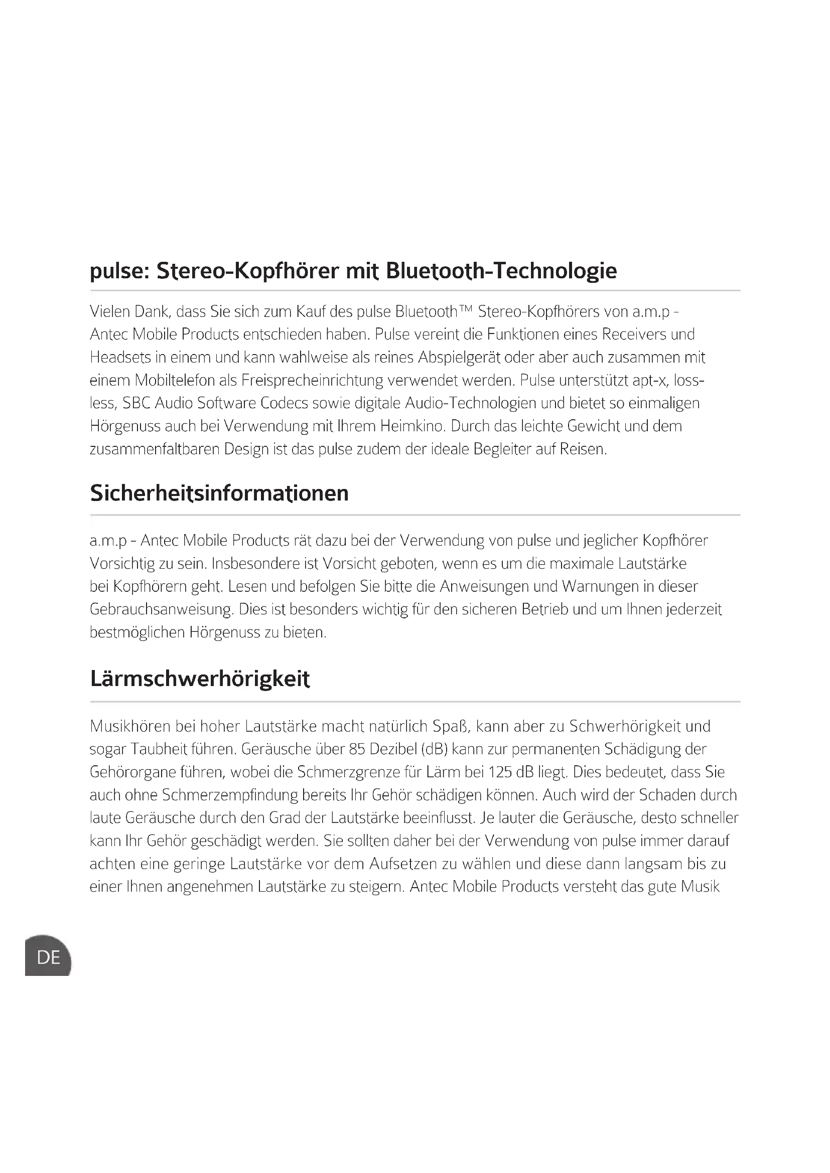 - comprobar si el dispositivo móvil es compatible con las funciones de marcación con manos libres o de voz. Solución de problemasES Encendido LED AZUL parpadeó tres veces Apagado LED ROJA parpadeó tres veces Modo Emparejar LED alterna luz roja y azul Modo Espera LED color azul Modo activado AV (activación por voz) LED azul parpadea dos veces cada dos segundos Modo Auricular activado LED azul parpadea una vez por segundo Batería baja LED rojo parpadea cada dos segundos Apagado automático LED rojo parpadeará 3 veces y se apaga (a los 5 minutos sin ninguna conexión) Botón Volumen Up Ipara aumentar el volumen Botón Volumen Down para reducción de volumen Botón Forward para pasar a la siguiente canción Botón Backward para pasar a la anterior canción Botón Play /Pausa para reproducir o pausar canciones Botón Multifunción De encendido / apagado / llamada tripartita / SIRI (presionando una vez) / Redial (presionando dos veces) Botón Teléfono para múltiples funciones del teléfono Indicación LED Funciones de los botonesVielen Dank, dass Sie sich zum Kauf des pulse Bluetooth™ Stereo-Kopfhörers von a.m.p - Antec Mobile Products entschieden haben. Pulse vereint die Funktionen eines Receivers und Headsets in einem und kann wahlweise als reines Abspielgerät oder aber auch zusammen mit einem Mobiltelefon als Freisprecheinrichtung verwendet werden. Pulse unterstützt apt-x, loss- less, SBC Audio Software Codecs sowie digitale Audio-Technologien und bietet so einmaligen Hörgenuss auch bei Verwendung mit Ihrem Heimkino. Durch das leichte Gewicht und dem zusammenfaltbaren Design ist das pulse zudem der ideale Begleiter auf Reisen. a.m.p - Antec Mobile Products rät dazu bei der Verwendung von pulse und jeglicher Kopfhörer Vorsichtig zu sein. Insbesondere ist Vorsicht geboten, wenn es um die maximale Lautstärke bei Kopfhörern geht. Lesen und befolgen Sie bitte die Anweisungen und Warnungen in dieser Gebrauchsanweisung. Dies ist besonders wichtig für den sicheren Betrieb und um Ihnen jederzeit bestmöglichen Hörgenuss zu bieten. Musikhören bei hoher Lautstärke macht natürlich Spaß, kann aber zu Schwerhörigkeit und sogar Taubheit führen. Geräusche über 85 Dezibel (dB) kann zur permanenten Schädigung der Gehörorgane führen, wobei die Schmerzgrenze für Lärm bei 125 dB liegt. Dies bedeutet, dass Sie auch ohne Schmerzempfindung bereits Ihr Gehör schädigen können. Auch wird der Schaden durch laute Geräusche durch den Grad der Lautstärke beeinflusst. Je lauter die Geräusche, desto schneller kann Ihr Gehör geschädigt werden. Sie sollten daher bei der Verwendung von pulse immer darauf achten eine geringe Lautstärke vor dem Aufsetzen zu wählen und diese dann langsam bis zu einer Ihnen angenehmen Lautstärke zu steigern. Antec Mobile Products versteht das gute Musik