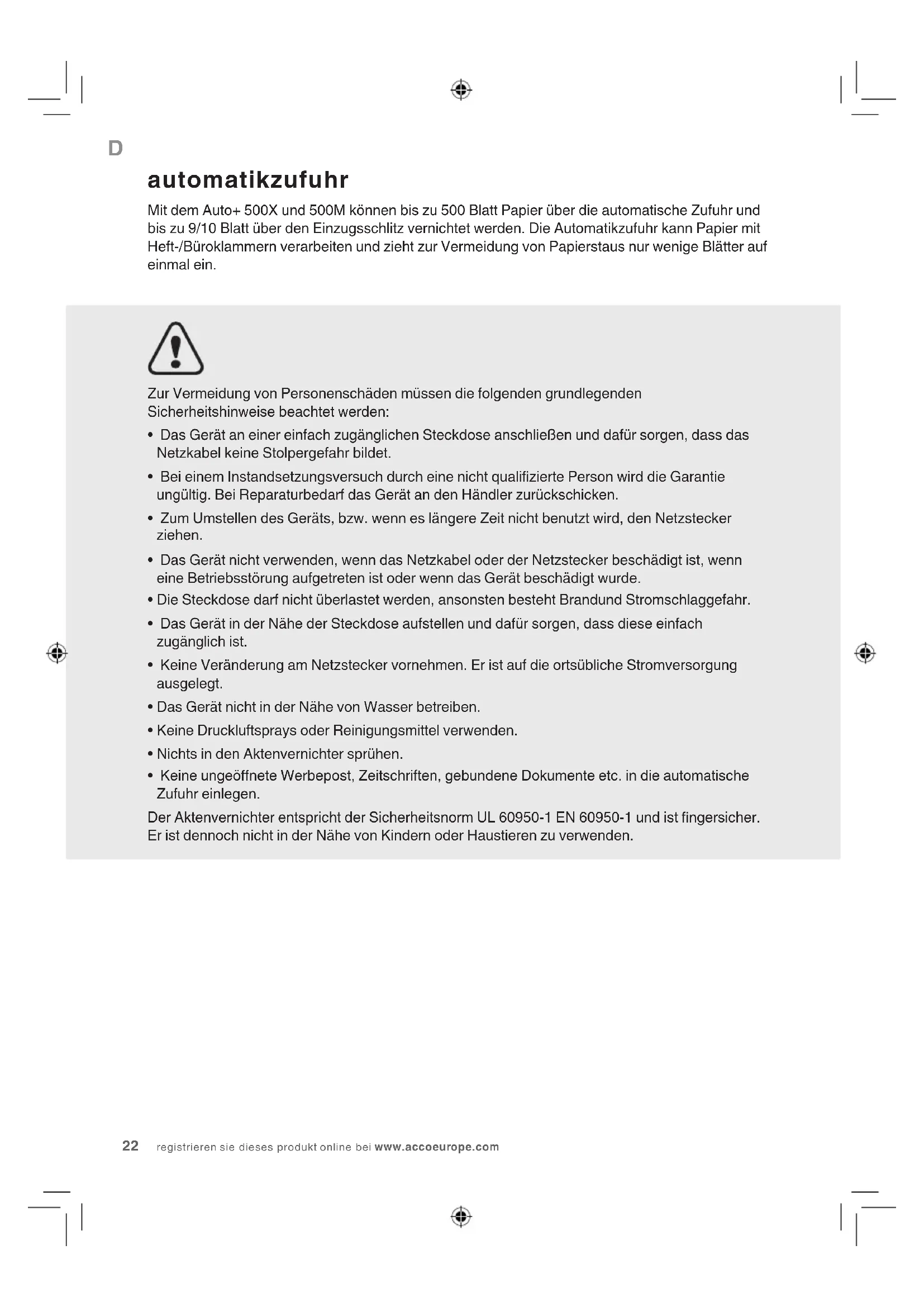 - Keine ungeönete Werbepost, Zeitschriften, gebundene Dokumente etc. in die automatische Zufuhr einlegen. Der Aktenvernichter entspricht der Sicherheitsnorm UL 60950-1 EN 60950-1 und ist ngersicher. Er ist dennoch nicht in der Nähe von Kindern oder Haustieren zu verwenden. automatikzufuhr Mit dem Auto+ 500X und 500M können bis zu 500 Blatt Papier über die automatische Zufuhr und bis zu 9/10 Blatt über den Einzugsschlitz vernichtet werden. Die Automatikzufuhr kann Papier mit Heft-/Büroklammern verarbeiten und zieht zur Vermeidung von Papierstaus nur wenige Blätter auf einmal ein.D