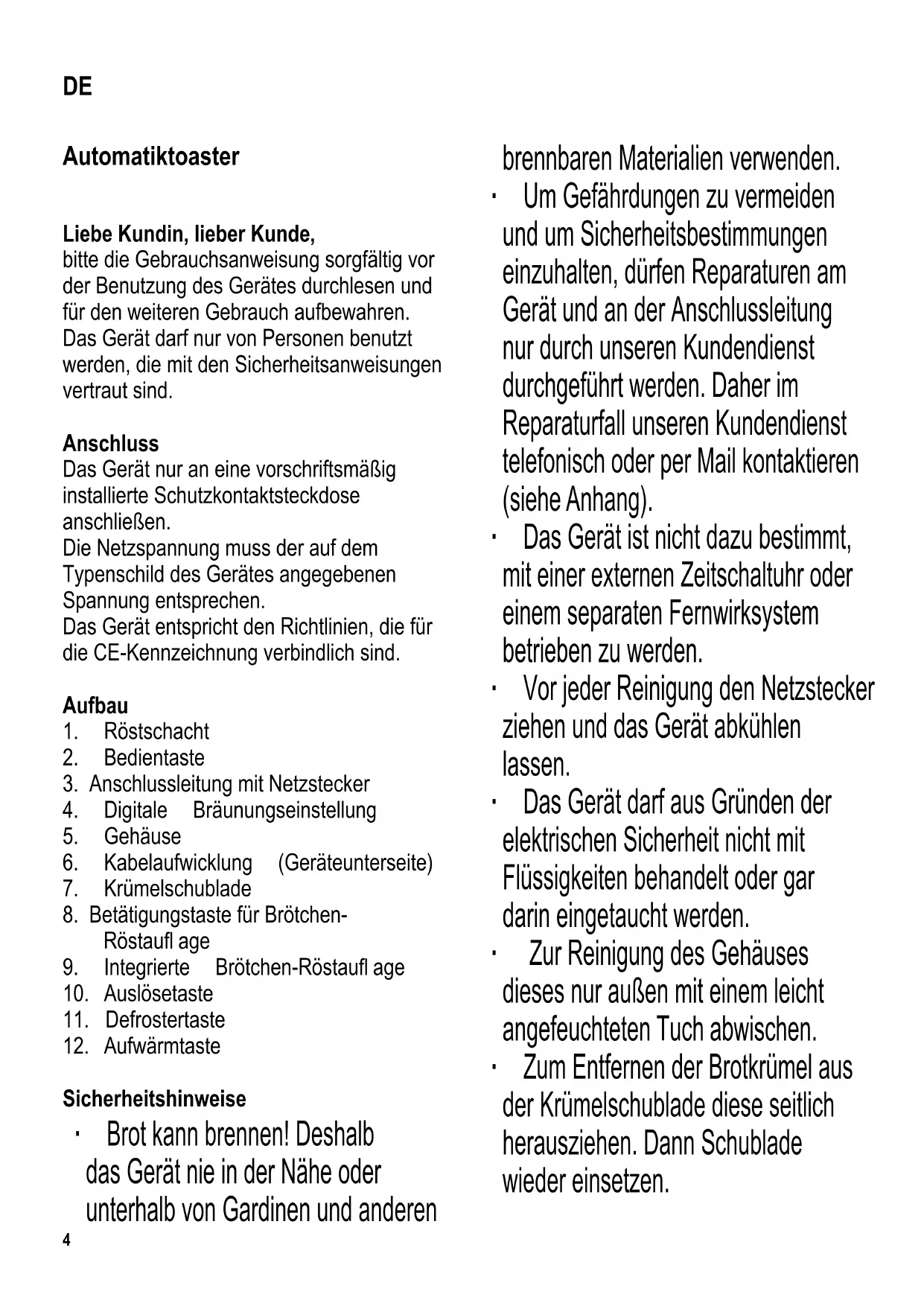 Sicherheitshinweise ∙ Brot kann brennen! Deshalb das Gerät nie in der Nähe oder unterhalb von Gardinen und anderen brennbaren Materialien verwenden. ∙ Um Gefährdungen zu vermeiden und um Sicherheitsbestimmungen einzuhalten, dürfen Reparaturen am Gerät und an der Anschlussleitung nur durch unseren Kundendienst durchgeführt werden. Daher im Reparaturfall unseren Kundendienst telefonisch oder per Mail kontaktieren (siehe Anhang). ∙ Das Gerät ist nicht dazu bestimmt, mit einer externen Zeitschaltuhr oder einem separaten Fernwirksystem betrieben zu werden. ∙ Vor jeder Reinigung den Netzstecker ziehen und das Gerät abkühlen lassen. ∙ Das Gerät darf aus Gründen der elektrischen Sicherheit nicht mit Flüssigkeiten behandelt oder gar darin eingetaucht werden. ∙ Zur Reinigung des Gehäuses dieses nur außen mit einem leicht angefeuchteten Tuch abwischen. ∙ Zum Entfernen der Brotkrümel aus der Krümelschublade diese seitlich herausziehen. Dann Schublade wieder einsetzen. DE5 ∙ Das Gerät ist dazu bestimmt, im Haushalt und ähnlichen Anwendungen verwendet zu werden, wie z.B. - in Küchen für Mitarbeiter in Läden, Büros und ähnlichen Arbeitsumgebungen, - in landwirtschaftlichen Betrieben, - von Kunden in Hotels, Motels und weiteren typischen Wohnumgebungen, - in Frühstückspensionen. ∙ Das Gerät kann von Kindern ab 8 Jahren sowie von Personen mit reduzierten physischen, sensorischen oder mentalen Fähigkeiten oder Mangel an Erfahrung und/oder Wissen benutzt werden, wenn sie beaufsichtigt oder bezüglich des sicheren Gebrauchs des Gerätes unterwiesen wurden und die daraus resultierenden Gefahren verstanden haben. ∙ Kinder dürfen nicht mit dem Gerät spielen. ∙ Reinigung und Benutzer-Wartung dürfen nicht durch Kinder durchgeführt werden, es sei denn sie sind 8 Jahre und älter und werden beaufsichtigt. ∙ Kinder jünger als 8 Jahre sind vom Gerät und der Anschlussleitung fernzuhalten. ∙ Kinder von Verpackungsmaterial fernhalten. Es besteht u.a. Erstickungsgefahr! ∙ Das Gerät auf eine wärmebeständige ebene Fläche stellen. ∙ Das Gerät nicht auf heißen Oberfl ächen (z.B. Herdplatten o.ä.) oder in der Nähe von offenen Gasfl ammen abstellen oder benutzen, damit das Gehäuse nicht beschädigt wird. ∙ Achtung! Während des Betriebes kann die Temperatur der berührbaren Oberfl äche sehr hoch sein. Verbrennungsgefahr! ∙ Vor der Inbetriebnahme das komplette Gerät inkl. Anschlussleitung und eventueller Zubehörteile auf Mängel und Beschädigungen überprüfen, die die Funktionssicherheit des Gerätes beeinträchtigen könnten. Falls das Gerät z.B. zu Boden gefallen ist oder an der Anschlussleitung gezogen wurde, können von außen nicht erkennbare Schäden vorliegen. In diesen Fällen das Gerät nicht in Betrieb nehmen. ∙ Die Anschlussleitung darf heiße Geräteteile nicht berühren. ∙ Die Anschlussleitung nicht herunterhängen lassen. ∙ Das Gerät niemals ohne Aufsicht betreiben. ∙ Bei Betrieb des Gerätes den Röstschacht niemals abdecken. ∙ Nicht mit Fingern oder Gegenständen (z.B.6 Gabel, Messer o.ä.) in den Röstschacht hineingelangen, da die Heizelemente spannungsführend sind. ∙ Den Netzstecker des Gerätes ziehen, - nach jedem Gebrauch - bei Störungen während des Betriebes, - vor jeder Reinigung des Gerätes. ∙ Den Netzstecker nicht an der Anschlussleitung aus der Steckdose ziehen, sondern den Netzstecker anfassen. ∙ Wird das Gerät falsch bedient, oder zweckentfremdet verwendet, kann keine Haftung für evtl. auftretende Schäden übernommen werden. Bedienung Allgemeine Hinweise ∙ Achtung: Die Bedientaste rastet nur bei angeschlossener Zuleitung ein! ∙ Nicht zu dicke oder zu große Scheiben verwenden, da sich diese leicht verklemmen können. Es können Brotscheiben bis maximal 14 mm Dicke getoastet werden. ∙ Bei Störungen und beim Reinigen erst den Netzstecker aus der Steckdose ziehen! ∙ Verklemmte Brotscheiben mit einem stumpfen Holzstab (z.B. Pinselstiel) lösen. Dabei die Heizkörper nicht berühren. Vor der ersten Inbetriebnahme ∙ Toaster reinigen (siehe „Reinigung und Pfl ege“). ∙ Den Toaster ohne Toastbrot mindestens fünfmal bei maximalem Bräunungsgrad betreiben. ∙ Zwischen den einzelnen Aus- und Einschaltvorgängen den Toaster abkühlen lassen. ∙ Beim ersten Gebrauch kann ein leichter Geruch entstehen (geringe Rauchentwicklung möglich). Dieser verliert sich jedoch nach kurzer Zeit. Für ausreichende Lüftung durch geöffnete Fenster und Balkontüren sorgen. Automatische Abschaltung Das Gerät ist mit einer automatischen Abschaltung ausgestattet. Das Gerät wird abgeschaltet, wenn nach Beendigung des Toastvorgangs eine Toastscheibe blockiert und nicht nach oben transportiert werden kann. Dann den Netzstecker ziehen und die Toastscheibe wie unter ‚Allgemeine Hinweise’ beschrieben entfernen. Einstellung des Bräunungsgrades Der gewünschte Bräunungsgrad kann mithilfe der digitalen Bräunungseinstellung ausgewählt werden, sobald die Bedientaste nach unten gedrückt wurde. Hell: Stufen 1-3 Dunkel: Stufen 5-7 Wir empfehlen eine Einstellung des Bräunungsgrades für Toastbrot auf Position