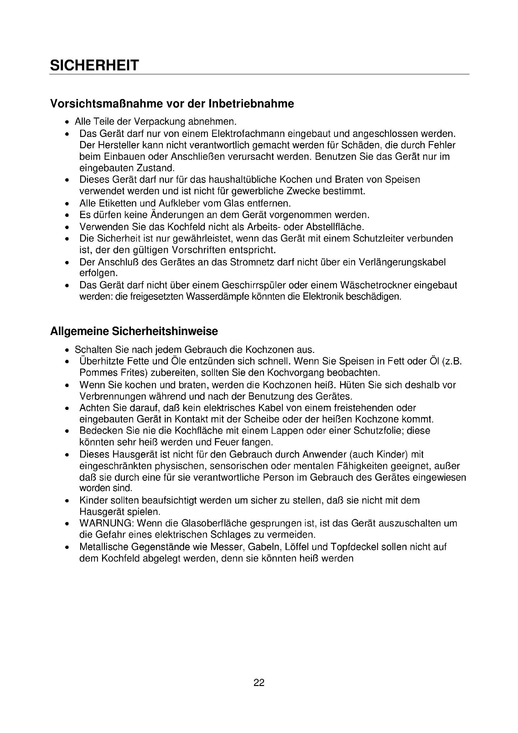 - ELEKTROANSCHLUSS SICHERHEIT Vorsichtsmaßnahme vor der Inbetriebnahme Alle Teile der Verpackung abnehmen. Das Gerät darf nur von einem Elektrofachmann eingebaut und angeschlossen werden. Der Hersteller kann nicht verantwortlich gemacht werden für Schäden, die durch Fehler beim Einbauen oder Anschließen verursacht werden. Benutzen Sie das Gerät nur im eingebauten Zustand. Dieses Gerät darf nur für das haushaltübliche Kochen und Braten von Speisen verwendet werden und ist nicht für gewerbliche Zwecke bestimmt. Alle Etiketten und Aufkleber vom Glas entfernen. Es dürfen keine Änderungen an dem Gerät vorgenommen werden. Verwenden Sie das Kochfeld nicht als Arbeits- oder Abstellfläche. Die Sicherheit ist nur gewährleistet, wenn das Gerät mit einem Schutzleiter verbunden ist, der den gültigen Vorschriften entspricht. Der Anschluß des Gerätes an das Stromnetz darf nicht über ein Verlängerungskabel erfolgen. Das Gerät darf nicht über einem Geschirrspüler oder einem Wäschetrockner eingebaut werden: die freigesetzten Wasserdämpfe könnten die Elektronik beschädigen. Allgemeine Sicherheitshinweise Schalten Sie nach jedem Gebrauch die Kochzonen aus. Überhitzte Fette und Öle entzünden sich schnell. Wenn Sie Speisen in Fett oder Öl (z.B. Pommes Frites) zubereiten, sollten Sie den Kochvorgang beobachten. Wenn Sie kochen und braten, werden die Kochzonen heiß. Hüten Sie sich deshalb vor Verbrennungen während und nach der Benutzung des Gerätes. Achten Sie darauf, daß kein elektrisches Kabel von einem freistehenden oder eingebauten Gerät in Kontakt mit der Scheibe oder der heißen Kochzone kommt. Bedecken Sie nie die Kochfläche mit einem Lappen oder einer Schutzfolie; diese könnten sehr heiß werden und Feuer fangen. Dieses Hausgerät ist nicht für den Gebrauch durch Anwender (auch Kinder) mit eingeschränkten physischen, sensorischen oder mentalen Fähigkeiten geeignet, außer daß sie durch eine für sie verantwortliche Person im Gebrauch des Gerätes eingewiesen worden sind. Kinder sollten beaufsichtigt werden um sicher zu stellen, daß sie nicht mit dem Hausgerät spielen. WARNUNG: Wenn die Glasoberfläche gesprungen ist, ist das Gerät auszuschalten um die Gefahr eines elektrischen Schlages zu vermeiden. Metallische Gegenstände wie Messer, Gabeln, Löffel und Topfdeckel sollen nicht auf dem Kochfeld abgelegt werden, denn sie könnten heiß werden23 Schutz vor Beschädigung Verwenden Sie keine Töpfe oder Pfannen mit ungeschliffenem oder beschädigtem Boden. Diese können die Glaskeramikscheiben verkratzen. Beachten Sie, daß auch Sandkörner Kratzer verursachen können. Glaskeramik ist unempfindlich gegen Temperaturschocks und sehr widerstandsfähig, jedoch nicht unzerbrechlich. Besonders spitze und harte Gegenstände, die auf die Kochfläche fallen, können sie beschädigen. Vermeiden Sie mit den Töpfen an den Rändern der Glasscheibe zu stoßen. Die Kochzonen nicht mit leerem Kochgeschirr benutzen. Vermeiden Sie Zucker, Kunstoff, oder Alufolie auf den heißen Kochzonen. Diese Stoffe schmelzen, kleben fest und können dadurch beim Abkühlen Risse, Brüche oder andere bleibende Veränderungen in der Scheibe verursachen. Falls Sie trotzdem auf die heißen Kochzonen gelangen, schalten Sie das Gerät bitte aus, und entfernen Sie diese Stoffe noch im heißen Zustand. Da die Kochzonen heiß sind, besteht Verbrennungsgefahr. Stellen Sie in keinem Fall heißes Kochgeschirr auf der Steuerung ab. Die Elektronik unter dem Glas könnte beschädigt werden. Befindet sich unter dem eingebauten Gerät eine Schublade, muß auf einen Mindestabstand von 2 cm zwischen der Unterseite des Gerätes und dem Schubladeninhalt geachtet werden, da sonst die Belüftung des Gerätes nicht gewährleistet ist. Es dürfen keine brennbaren Gegenstände (z.B. Spraydosen) in dieser Schublade aufbewahrt werden. Die Besteckkästen in der Schublade müssen aus hitzebeständigem Material sein. Erhitzen Sie keine geschlossenen Behälter (z.B. Konservendosen) auf den Kochzonen. Durch den entsprechenden Überdruck können die Behälter bzw. Dosen platzen, und es besteht Verletzungsgefahr! Vorsichtsmaßnahmen bei Geräteausfall Sollte ein Fehler festgestellt werden, muß das Gerät ausgeschaltet und vom Stromnetz getrennt werden. Wenn Brüche, Sprünge oder Risse auf dem Glas auftreten: schalten Sie das Kochfeld sofort aus, schrauben Sie die Sicherung für das Kochfeld ab bzw. nehmen Sie diese heraus, und wenden Sie sich an unseren Kundendienst oder an Ihren Fachhändler. Öffnen Sie in keinem Fall das Gerät selber. Reparaturen am Gerät dürfen nur von Fachkräften durchgeführt werden. Schutz vor weiteren Gefahren Achten Sie darauf, daß das Kochgeschirr immer zentriert auf der Kochzone plaziert ist. Der Pfannenboden, muß möglichst viel von der Kochzone abdecken. Für Personen mit einem Herzschrittmacher: in der Nähe des eingeschalteten Gerätes entsteht ein elektromagnetisches Feld, das eventuell den Herzschrittmacher beeinträchtigen würde. Wenden Sie sich bitte im Zweifelsfall an den Hersteller des Herzschrittmachers oder an Ihren Arzt.24 p. 2922