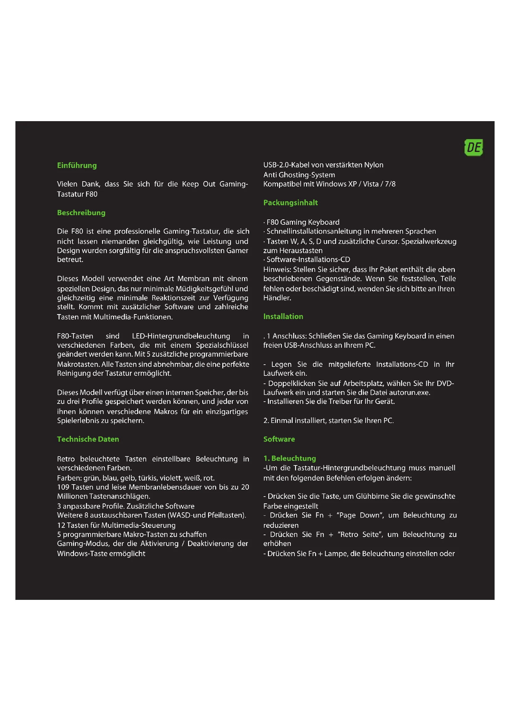Stisknutím Windows klávesy Fn + povolit nebo zakázat klávesu Windows, takže nic vám brání v průběhu přehrávání relací. 6 Obnovit výchozí Můžete obnovit výchozí nastavení, klikněte na tlačítko “Restore Default” na softwarové klávesnici. Technická podpora Prosím více informací o instalaci a konguraci tohoto produktu naleznete na našich webových stránkách www. keep-out.eu nebo napsat e-mail na adresu: support@keep- out.euDE Einführung Vielen Dank, dass Sie sich für die Keep Out Gaming- Tastatur F80 Beschreibung Die F80 ist eine professionelle Gaming-Tastatur, die sich nicht lassen niemanden gleichgültig, wie Leistung und Design wurden sorgfältig für die anspruchsvollsten Gamer betreut. Dieses Modell verwendet eine Art Membran mit einem speziellen Design, das nur minimale Müdigkeitsgefühl und gleichzeitig eine minimale Reaktionszeit zur Verfügung stellt. Kommt mit zusätzlicher Software und zahlreiche Tasten mit Multimedia-Funktionen. F80-Tasten sind LED-Hintergrundbeleuchtung in verschiedenen Farben, die mit einem Spezialschlüssel geändert werden kann. Mit 5 zusätzliche programmierbare Makrotasten. Alle Tasten sind abnehmbar, die eine perfekte Reinigung der Tastatur ermöglicht. Dieses Modell verfügt über einen internen Speicher, der bis zu drei Prole gespeichert werden können, und jeder von ihnen können verschiedene Makros für ein einzigartiges Spielerlebnis zu speichern. Technische Daten Retro beleuchtete Tasten einstellbare Beleuchtung in verschiedenen Farben. Farben: grün, blau, gelb, türkis, violett, weiß, rot. 109 Tasten und leise Membranlebensdauer von bis zu 20 Millionen Tastenanschlägen. 3 anpassbare Prole. Zusätzliche Software Weitere 8 austauschbaren Tasten (WASD-und Pfeiltasten). 12 Tasten für Multimedia-Steuerung 5 programmierbare Makro-Tasten zu schaen Gaming-Modus, der die Aktivierung / Deaktivierung der Windows-Taste ermöglicht USB-2.0-Kabel von verstärkten Nylon Anti Ghosting-System Kompatibel mit Windows XP / Vista / 7/8 Packungsinhalt