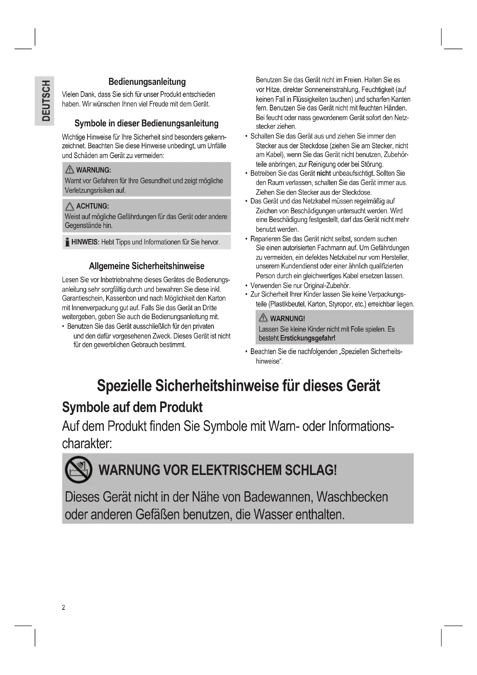 - Beachten Sie die nachfolgenden „Speziellen Sicherheits- hinweise“. Bedienungsanleitung Vielen Dank, dass Sie sich für unser Produkt entschieden haben. Wir wünschen Ihnen viel Freude mit dem Gerät. Symbole in dieser Bedienungsanleitung Wichtige Hinweise für Ihre Sicherheit sind besonders gekenn- zeichnet. Beachten Sie diese Hinweise unbedingt, um Unfälle und Schäden am Gerät zu vermeiden: WARNUNG: Warnt vor Gefahren für Ihre Gesundheit und zeigt mögliche Verletzungsrisiken auf. ACHTUNG: Weist auf mögliche Gefährdungen für das Gerät oder andere Gegenstände hin. HINWEIS: Hebt Tipps und Informationen für Sie hervor. Allgemeine Sicherheitshinweise Lesen Sie vor Inbetriebnahme dieses Gerätes die Bedienungs- anleitung sehr sorgfältig durch und bewahren Sie diese inkl. Garantieschein, Kassenbon und nach Möglichkeit den Karton mit Innenverpackung gut auf. Falls Sie das Gerät an Dritte weitergeben, geben Sie auch die Bedienungsanleitung mit.
