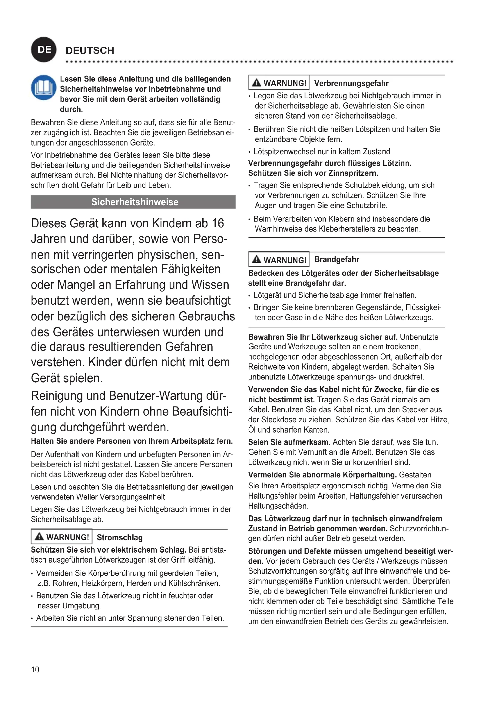 fen nicht von Kindern ohne Beaufsichti- gung durchgeführt werden. Halten Sie andere Personen von Ihrem Arbeitsplatz fern. Der Aufenthalt von Kindern und unbefugten Personen im Ar- beitsbereich ist nicht gestattet. Lassen Sie andere Personen nicht das Lötwerkzeug oder das Kabel berühren. Lesen und beachten Sie die Betriebsanleitung der jeweiligen verwendeten Weller Versorgungseinheit. Legen Sie das Lötwerkzeug bei Nichtgebrauch immer in der Sicherheitsablage ab. WARNUNG! Stromschlag Schützen Sie sich vor elektrischem Schlag. Bei antista- tisch ausgeführten Lötwerkzeugen ist der Griff leitfähig.