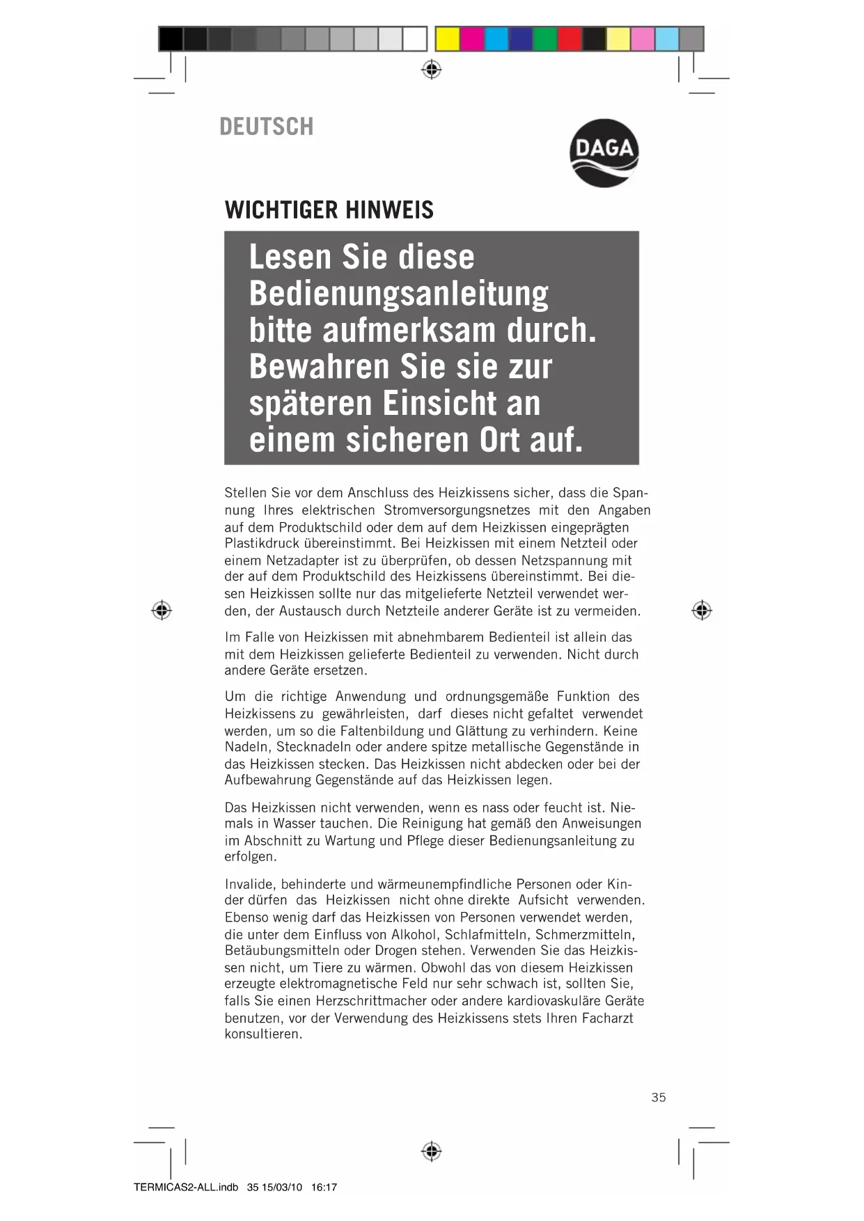 lichen Ein-Aus-Schiebeschalter und bringen Sie ihn auf die Position „0“. Wir empfehlen Ihnen, den Regler nach dem Einschalten des Heizkis- sens 20 Minuten lang auf die maximale Temperaturstufe zu schal- ten (Temperaturstufe 4), um eine schnelle Erwärmung zu gewährleis- ten. Verringern Sie anschließend die Temperatur, bis der gewünschte Wärmegrad erreicht ist. Es wird empfohlen, die maximale Tempera- turstufe (Stufe 4) nur während der ersten 20 Minuten Betriebszeit zu verwenden, um eine schnellere Erwärmung des Heizkissens zu gewährleisten. Jedoch verringert das Heizkissen bei Nichteinhaltung dieser Empfehlung und als Sicherheitsmaßnahme nach einem Dau- erbetrieb von etwa 2 Stunden automatisch die Temperatur. In dieser Beziehung möchten wir daran erinnern, dass die wohltu- ende Wirkung der vom Heizkissen gespendeten Wärme keine hohen TERMICAS2-ALL.indb 38 15/03/10 16:1739 Temperaturen erfordert und eine dauerhafte Überhitzung der Haut Verbrennungen verursachen kann. Die höchsten Temperaturstufen des Reglers sollten nur so lange verwendet werden, bis eine ange- nehme Temperatur erreicht ist. Anschließend sollte die Temperatur schrittweise auf eine niedrigere Stufe gesenkt werden. Wie zuvor bereits aufgeführt wurde, handelt es sich bei dem von Ihnen nach einem längeren Betrieb des Heizkissens auf Stufe 3-4 wahrgenommenen Temperaturrückgang keinesfalls um eine Störung. Es bedeutet ganz im Gegenteil, dass das automatische Kontrollsys- tem zur Überwachung des Betriebszeitraums bei erhöhten Tempera- turen, über das die Heizkissen von Daga verfügen, ausgelöst hat, um eine überhöhte Wärmeanwendung auf der Haut zu verhindern. Lassen Sie das Heizkissen vor dem Falten und anschließenden Auf- bewahren erst abkühlen und legen Sie keine Gegenstände auf dem Heizkissen ab.