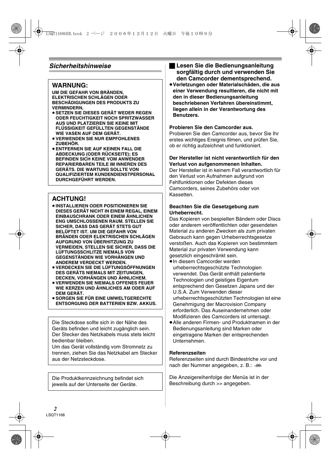 ª Lesen Sie die Bedienungsanleitung sorgfältig durch und verwenden Sie den Camcorder dementsprechend. ≥Verletzungen oder Materialschäden, die aus einer Verwendung resultieren, die nicht mit den in dieser Bedienungsanleitung beschriebenen Verfahren übereinstimmt, liegen allein in der Verantwortung des Benutzers. Probieren Sie den Camcorder aus. Probieren Sie den Camcorder aus, bevor Sie Ihr erstes wichtiges Ereignis filmen, und prüfen Sie, ob er richtig aufzeichnet und funktioniert. Der Hersteller ist nicht verantwortlich für den Verlust von aufgenommenen Inhalten. Der Hersteller ist in keinem Fall verantwortlich für den Verlust von Aufnahmen aufgrund von Fehlfunktionen oder Defekten dieses Camcorders, seines Zubehörs oder von Kassetten. Beachten Sie die Gesetzgebung zum Urheberrecht. Das Kopieren von bespielten Bändern oder Discs oder anderem veröffentlichten oder gesendeten Material zu anderen Zwecken als zum privaten Gebrauch kann gegen Urheberrechtsgesetze verstoßen. Auch das Kopieren von bestimmtem Material zur privaten Verwendung kann gesetzlich eingeschränkt sein. ≥In diesem Camcorder werden urheberrechtsgeschützte Technologien verwendet. Das Gerät enthält patentierte Technologien und geistiges Eigentum entsprechend den Gesetzen Japans und der U.S.A. Zum Verwenden dieser urheberrechtsgeschützten Technologien ist eine Genehmigung der Macrovision Company erforderlich. Das Auseinandernehmen oder Modifizieren des Camcorders ist untersagt. ≥Alle anderen Firmen- und Produktnamen in der Bedienungsanleitung sind Marken oder eingetragene Marken der entsprechenden Unternehmen. Referenzseiten Referenzseiten sind durch Bindestriche vor und nach der Nummer angegeben, z. B.: -00Die Anzeigereihenfolge der Menüs ist in der Beschreibung durch >> angegeben.