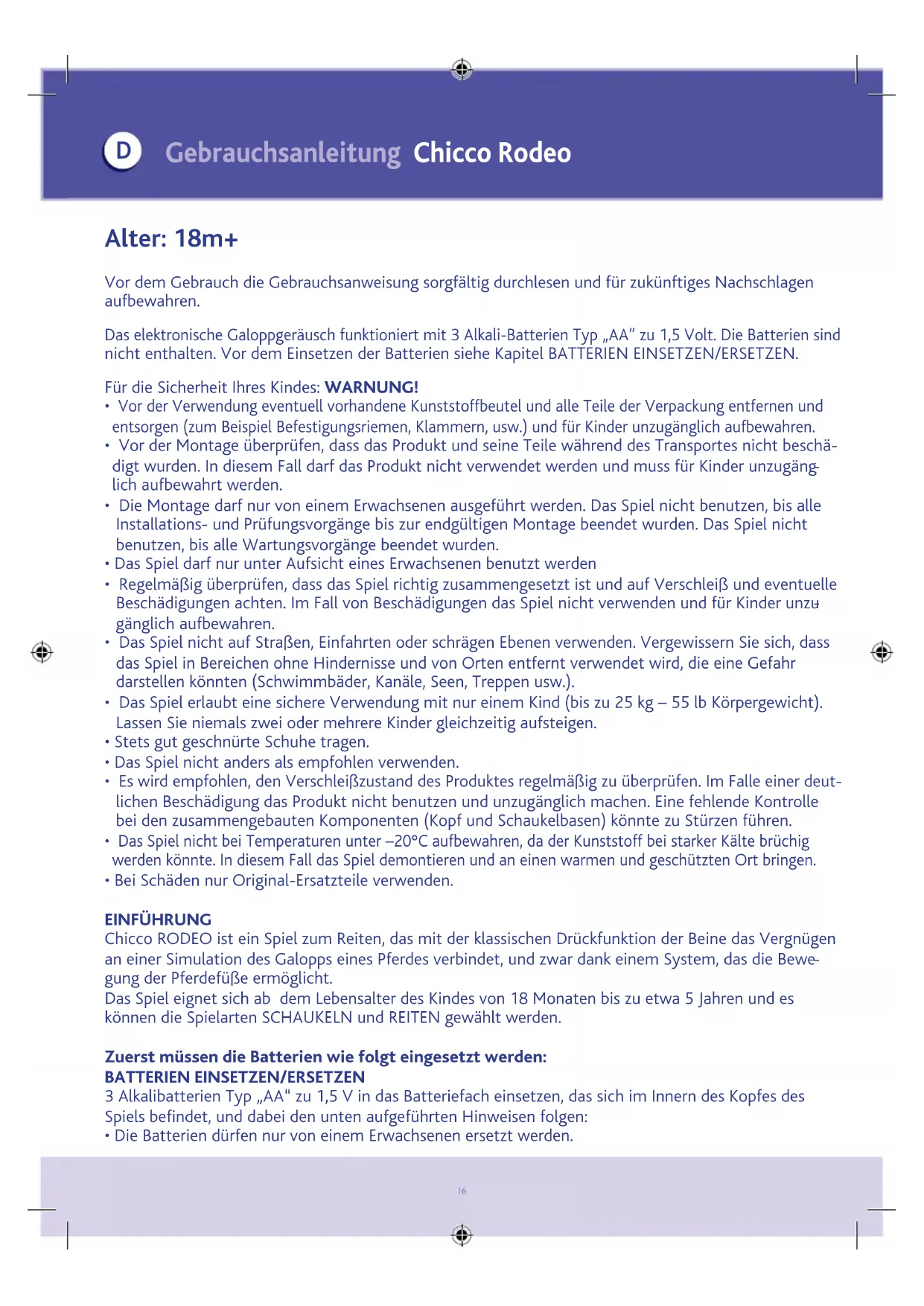 Alter: 18m+ Vor dem Gebrauch die Gebrauchsanweisung sorgfältig durchlesen und für zukünftiges Nachschlagen aufbewahren. Das elektronische Galoppgeräusch funktioniert mit 3 Alkali-Batterien Typ „AA” zu 1,5 Volt. Die Batterien sind nicht enthalten. Vor dem Einsetzen der Batterien siehe Kapitel BATTERIEN EINSETZEN/ERSETZEN. Für die Sicherheit Ihres Kindes: WARNUNG!