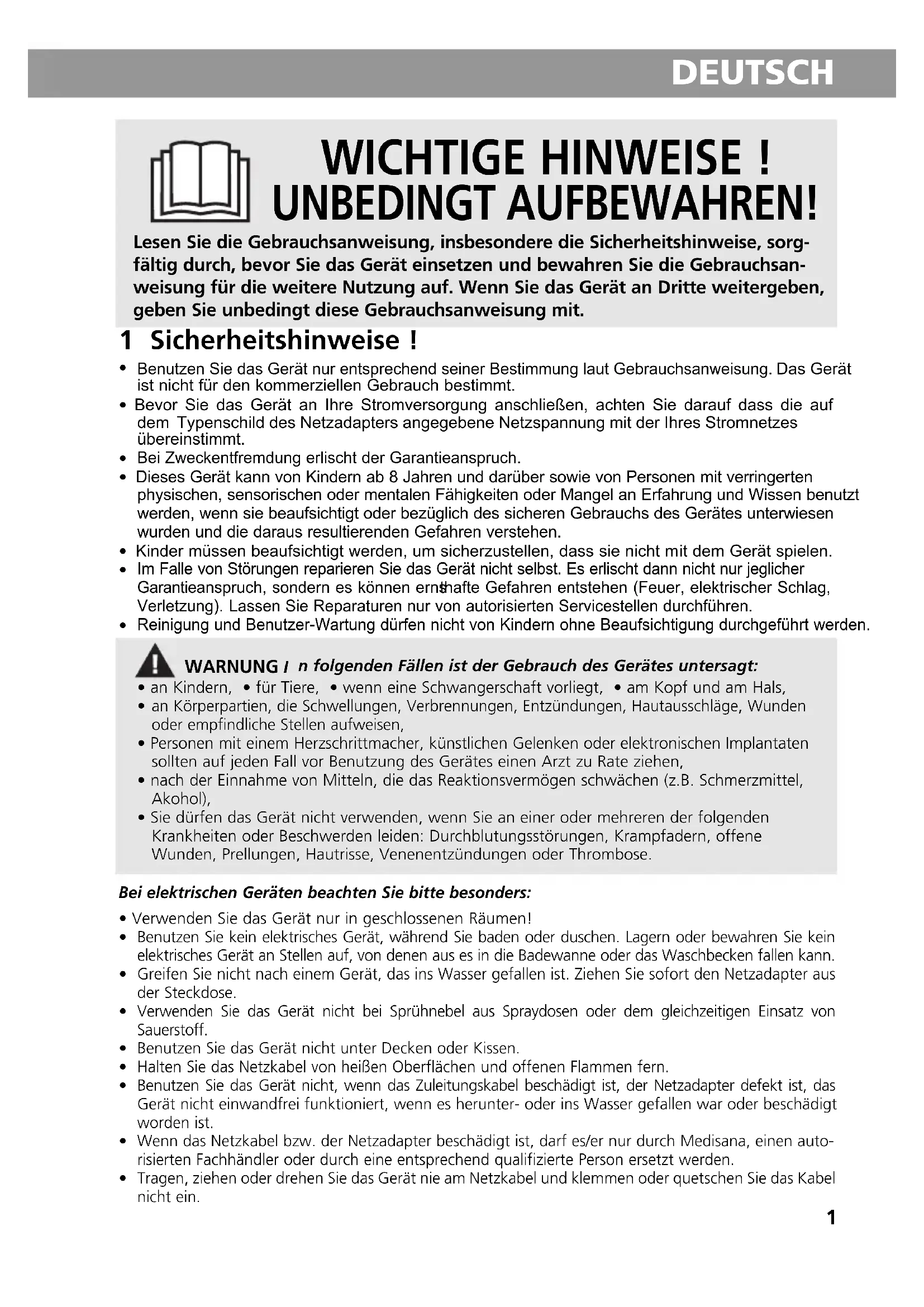 Im Falle von Störungen reparieren Sie das Gerät nicht selbst. Es erlischt dann nicht nur jeglicher Garantieanspruch, sondern es können ernsthafte Gefahren entstehen (Feuer, elektrischer Schlag, Verletzung). Lassen Sie Reparaturen nur von autorisierten Servicestellen durchführen. Reinigung und Benutzer-Wartung dürfen nicht von Kindern ohne Beaufsichtigung durchgeführt werden. WARNUNG I n folgenden Fällen ist der Gebrauch des Gerätes untersagt:• an Kindern, • für Tiere, • wenn eine Schwangerschaft vorliegt, • am Kopf und am Hals, an Körperpartien, die Schwellungen, Verbrennungen, Entzündungen, Hautausschläge, Wundenoder empfindliche Stellen aufweisen,• Personen mit einem Herzschrittmacher, künstlichen Gelenken oder elektronischen Implantatensollten auf jeden Fall vor Benutzung des Gerätes einen Arzt zu Rate ziehen,
