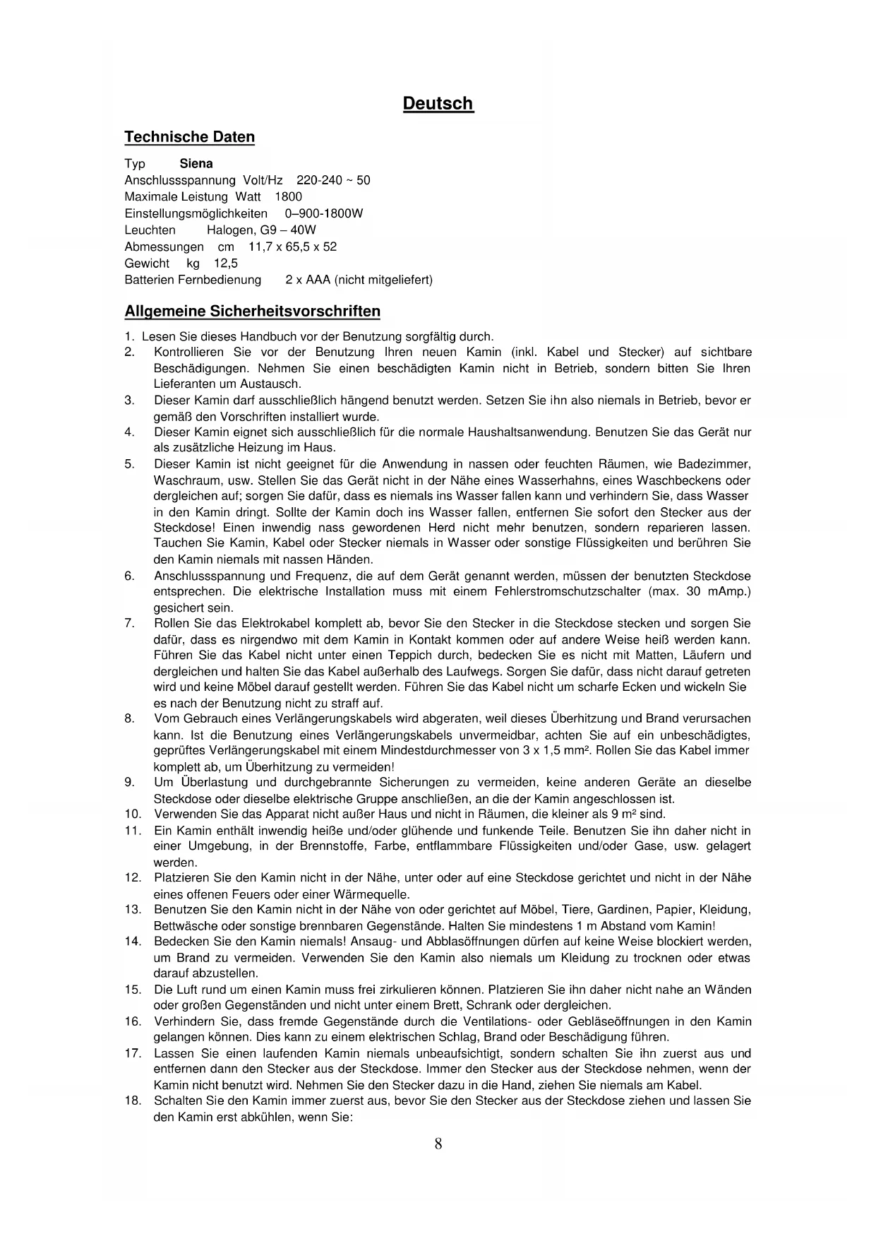 Deutsch Technische Daten Typ Siena Anschlussspannung Volt/Hz 220-240 ~ 50 Maximale Leistung Watt 1800 Einstellungsmöglichkeiten 0–900-1800W Leuchten Halogen, G9 – 40W Abmessungen cm 11,7 x 65,5 x 52 Gewicht kg 12,5 Batterien Fernbedienung 2 x AAA (nicht mitgeliefert) Allgemeine Sicherheitsvorschriften
