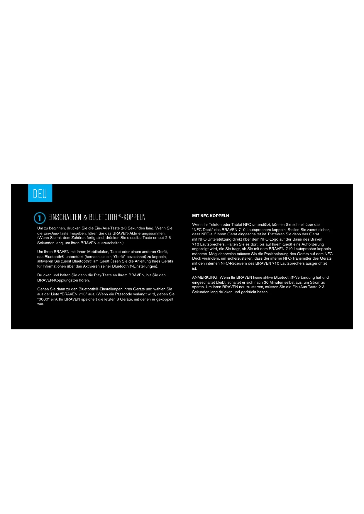 Wenn Ihr Telefon oder Tablet NFC unterstützt, können Sie schnell über das “NFC Deck” des BRAVEN 710 Lautsprechers koppeln. Stellen Sie zuerst sicher, dass NFC auf Ihrem Gerät eingeschaltet ist. Platzieren Sie dann das Gerät mit NFC-Unterstützung direkt über dem NFC-Logo auf der Basis des Braven 710 Lautsprechers. Halten Sie es dort, bis auf Ihrem Gerät eine Aufforderung angezeigt wird, die Sie fragt, ob Sie mit dem BRAVEN 710 Lautsprecher koppeln möchten. Möglicherweise müssen Sie die Positionierung des Geräts auf dem NFC Deck verändern, um sicherzustellen, dass der interne NFC-Transmitter des Geräts mit den internen NFC-Receivern des BRAVEN 710 Lautsprechers ausgerichtet ist. ANMERKUNG: Wenn Ihr BRAVEN keine aktive Bluetooth®-Verbindung hat und eingeschaltet bleibt, schaltet er sich nach 30 Minuten selbst aus, um Strom zu sparen. Um Ihren BRAVEN neu zu starten, müssen Sie die Ein-/Aus-Taste 2-3 Sekunden lang drücken und gedrückt halten. 1DEU