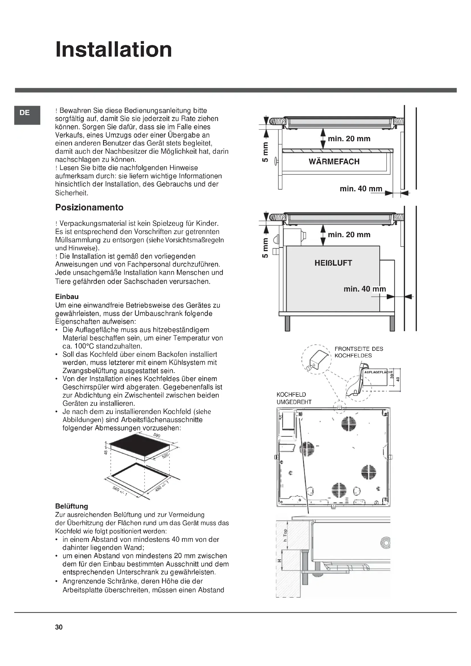 - um einen Abstand von mindestens 20 mm zwischen dem für den Einbau bestimmten Ausschnitt und dem entsprechenden Unterschrank zu gewährleisten.