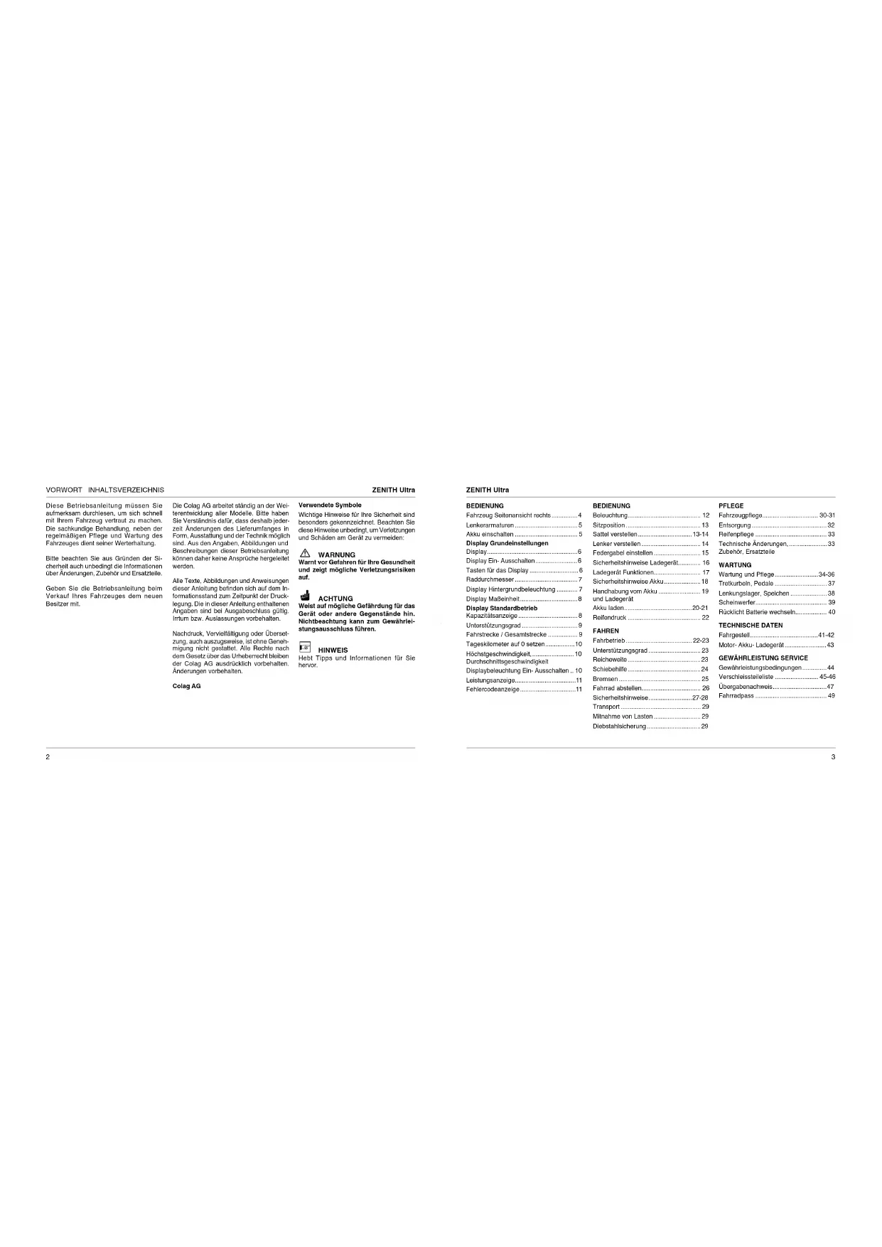- Diebstahlsicherung Diese Betriebsanleitung müssen Sie aufmerksam durchlesen, um sich schnell mit Ihrem Fahrzeug vertraut zu machen. Die sachkundige Behandlung, neben der regelmäßigen Pflege und Wartung des Fahrzeuges dient seiner Werterhaltung. Bitte beachten Sie aus Gründen der Si- cherheit auch unbedingt die Informationen über Änderungen, Zubehör und Ersatzteile. Geben Sie die Betriebsanleitung beim Verkauf Ihres Fahrzeuges dem neuen Besitzer mit. Die Colag AG arbeitet ständig an der Wei- terentwicklung aller Modelle. Bitte haben Sie Verständnis dafür, dass deshalb jeder- zeit Änderungen des Lieferumfanges in Form, Ausstattung und der Technik möglich sind. Aus den Angaben, Abbildungen und Beschreibungen dieser Betriebsanleitung können daher keine Ansprüche hergeleitet werden. Alle Texte, Abbildungen und Anweisungen dieser Anleitung benden sich auf dem In- formationsstand zum Zeitpunkt der Druck- legung. Die in dieser Anleitung enthaltenen Angaben sind bei Ausgabeschluss gültig. Irrtum bzw. Auslassungen vorbehalten. Nachdruck, Vervielfältigung oder Überset- zung, auch auszugsweise, ist ohne Geneh- migung nicht gestattet. Alle Rechte nach dem Gesetz über das Urheberrecht bleiben der Colag AG ausdrücklich vorbehalten. Änderungen vorbehalten. Colag AG Verwendete Symbole Wichtige Hinweise für Ihre Sicherheit sind besonders gekennzeichnet. Beachten Sie diese Hinweise unbedingt, um Verletzungen und Schäden am Gerät zu vermeiden: WARNUNG Warnt vor Gefahren für Ihre Gesundheit und zeigt mögliche Verletzungsrisiken auf. ACHTUNG Weist auf mögliche Gefährdung für das Gerät oder andere Gegenstände hin. Nichtbeachtung kann zum Gewährlei- stungsausschluss führen. HINWEIS Hebt Tipps und Informationen für Sie hervor.5 ZENITH Ultra p. 29