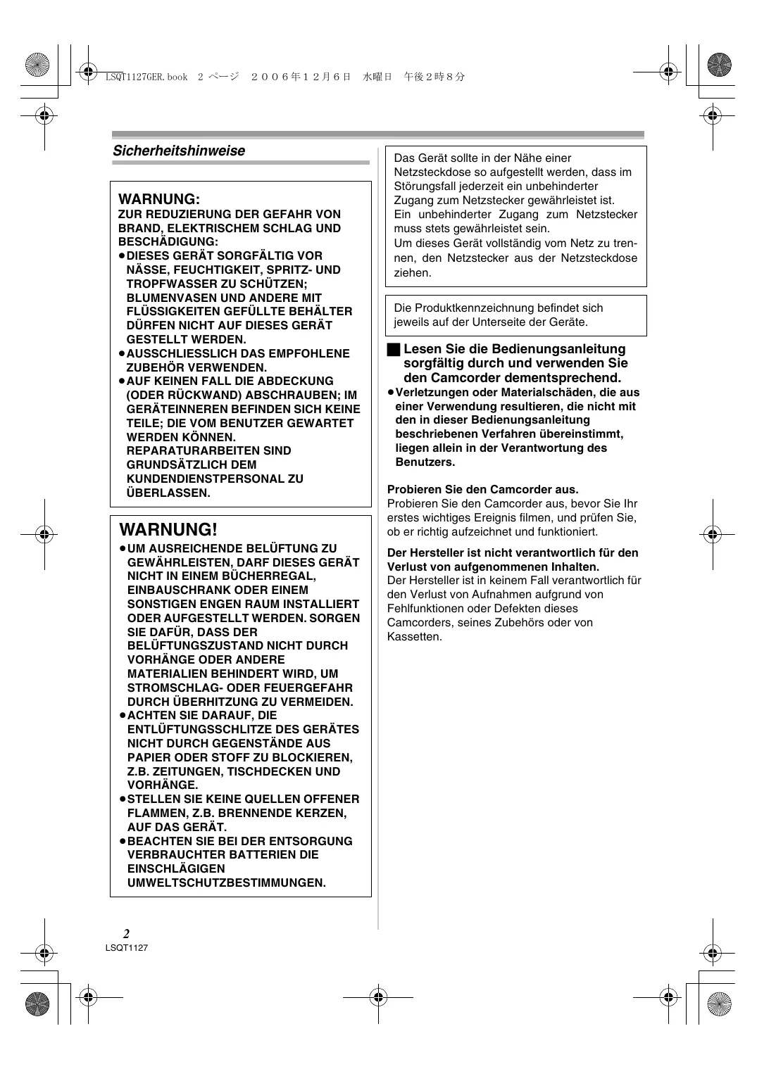 Das Gerät sollte in der Nähe einer Netzsteckdose so aufgestellt werden, dass im Störungsfall jederzeit ein unbehinderter Zugang zum Netzstecker gewährleistet ist. Ein unbehinderter Zugang zum Netzstecker muss stets gewährleistet sein. Um dieses Gerät vollständig vom Netz zu trennen, den Netzstecker aus der Netzsteckdose ziehen. Die Produktkennzeichnung befindet sich jeweils auf der Unterseite der Geräte. ª Lesen Sie die Bedienungsanleitung sorgfältig durch und verwenden Sie den Camcorder dementsprechend. ≥Verletzungen oder Materialschäden, die aus einer Verwendung resultieren, die nicht mit den in dieser Bedienungsanleitung beschriebenen Verfahren übereinstimmt, liegen allein in der Verantwortung des Benutzers. Probieren Sie den Camcorder aus. Probieren Sie den Camcorder aus, bevor Sie Ihr erstes wichtiges Ereignis filmen, und prüfen Sie, ob er richtig aufzeichnet und funktioniert. Der Hersteller ist nicht verantwortlich für den Verlust von aufgenommenen Inhalten. Der Hersteller ist in keinem Fall verantwortlich für den Verlust von Aufnahmen aufgrund von Fehlfunktionen oder Defekten dieses Camcorders, seines Zubehörs oder von Kassetten. LSQT1127GER.book 3 ページ 2006年12月6日