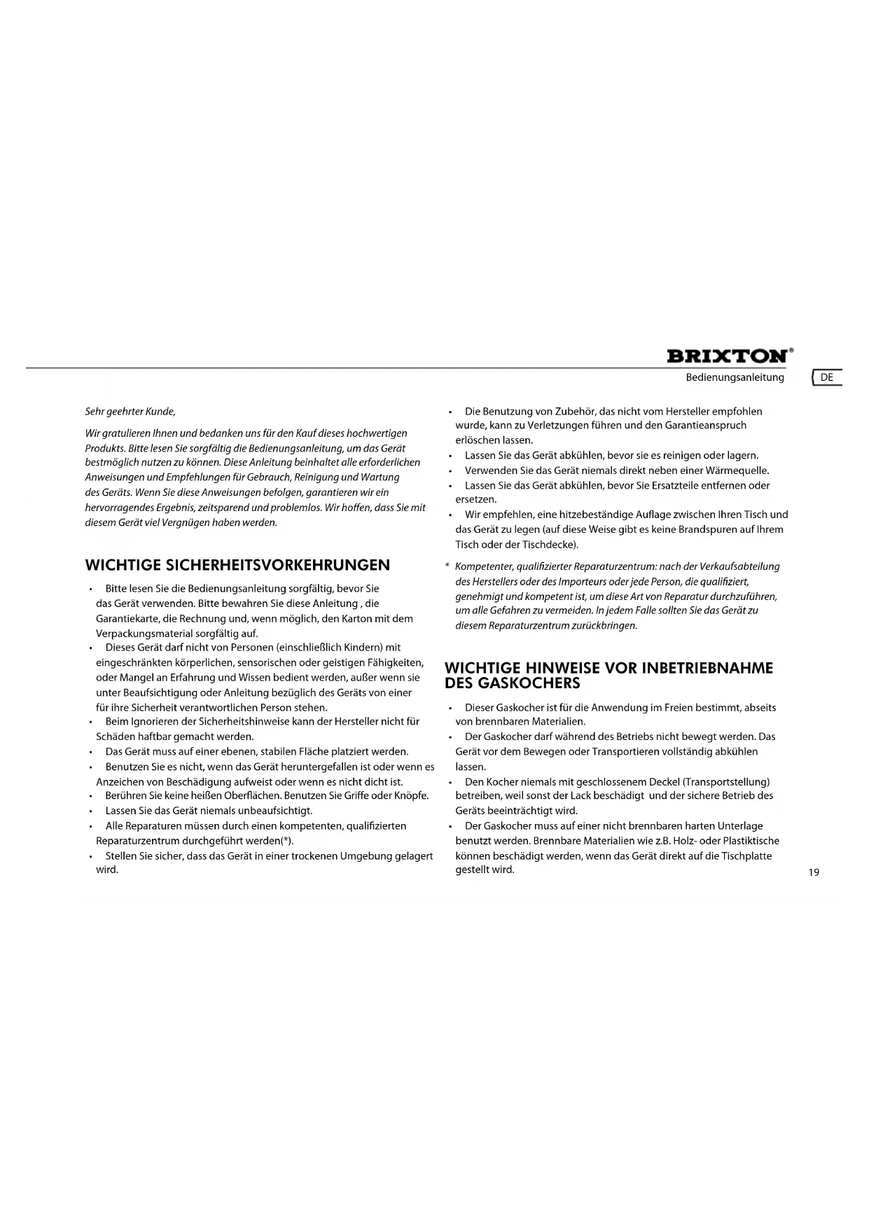 - Kompetenter, qualizierter Reparaturzentrum: nach der Verkaufsabteilung des Herstellers oder des Importeurs oder jede Person, die qualiziert, genehmigt und kompetent ist, um diese Art von Reparatur durchzuführen, um alle Gefahren zu vermeiden. In jedem Falle sollten Sie das Gerät zu diesem Reparaturzentrum zurückbringen. WichtiGe hinWeise vor inbetriebnahme des Gaskochers